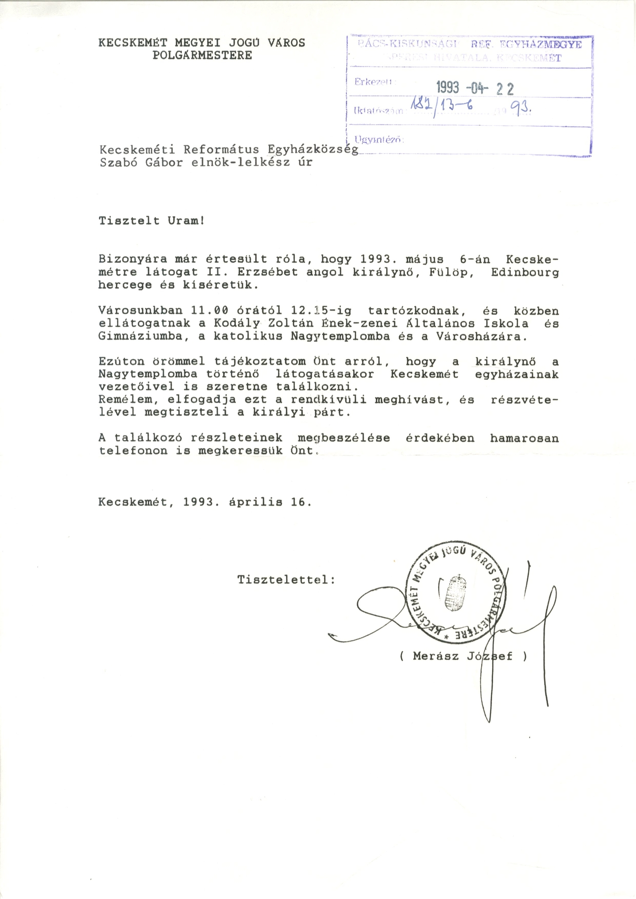 Varga László nyugalmazott püspökhelyettes, kecskeméti lelkipásztor a rendszerváltozás utáni első testület választott képviselője volt, II. Erzsébet látogatásakor a többi képviselővel együtt a városháza dísztermében fogadta sokadmagával a brit uralkodót. Kézfogásra nem volt lehetőség, bólintással üdvözölték, a királynő is így fogadta az üdvözletet. Varga László megjegyzi, érdekes, hogy a királynő az Újkollégium épületében is járt, amely ugyan ma református iskola, de akkor – az államosítás miatt – a Kodály Iskola működött az épületben.