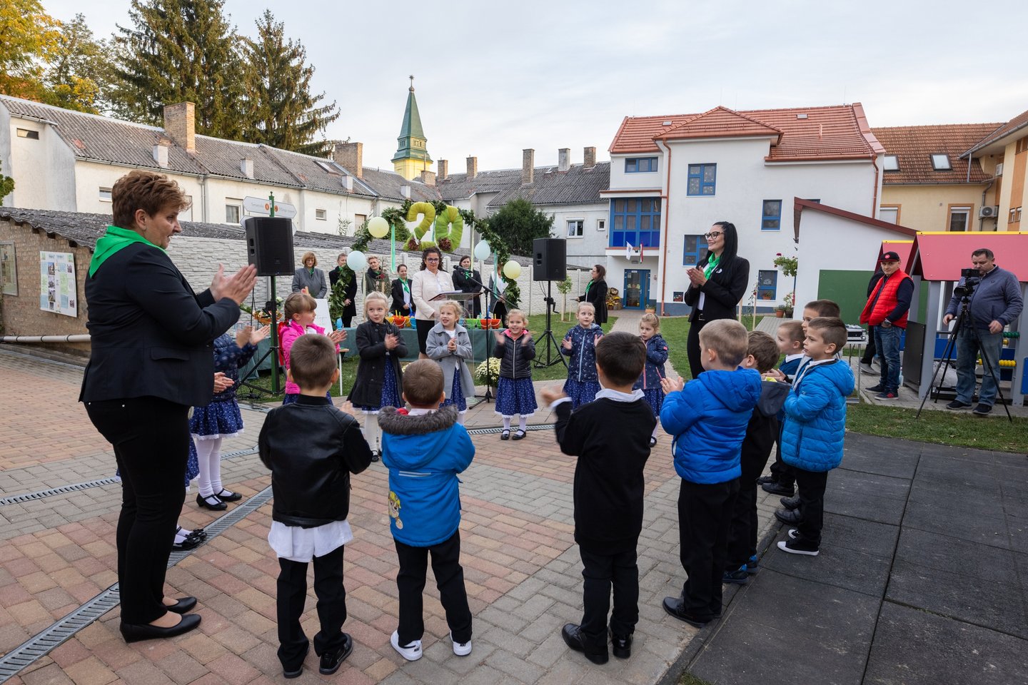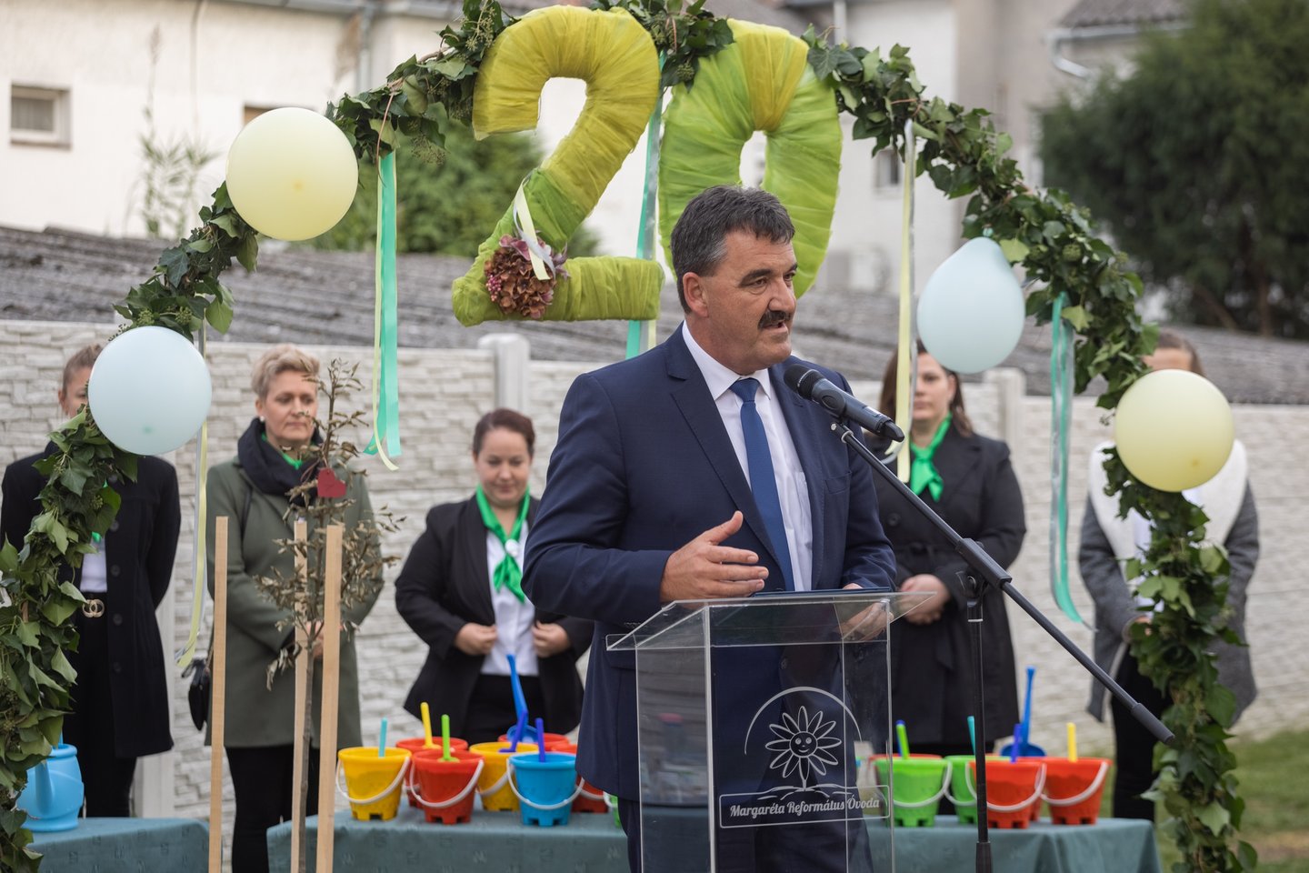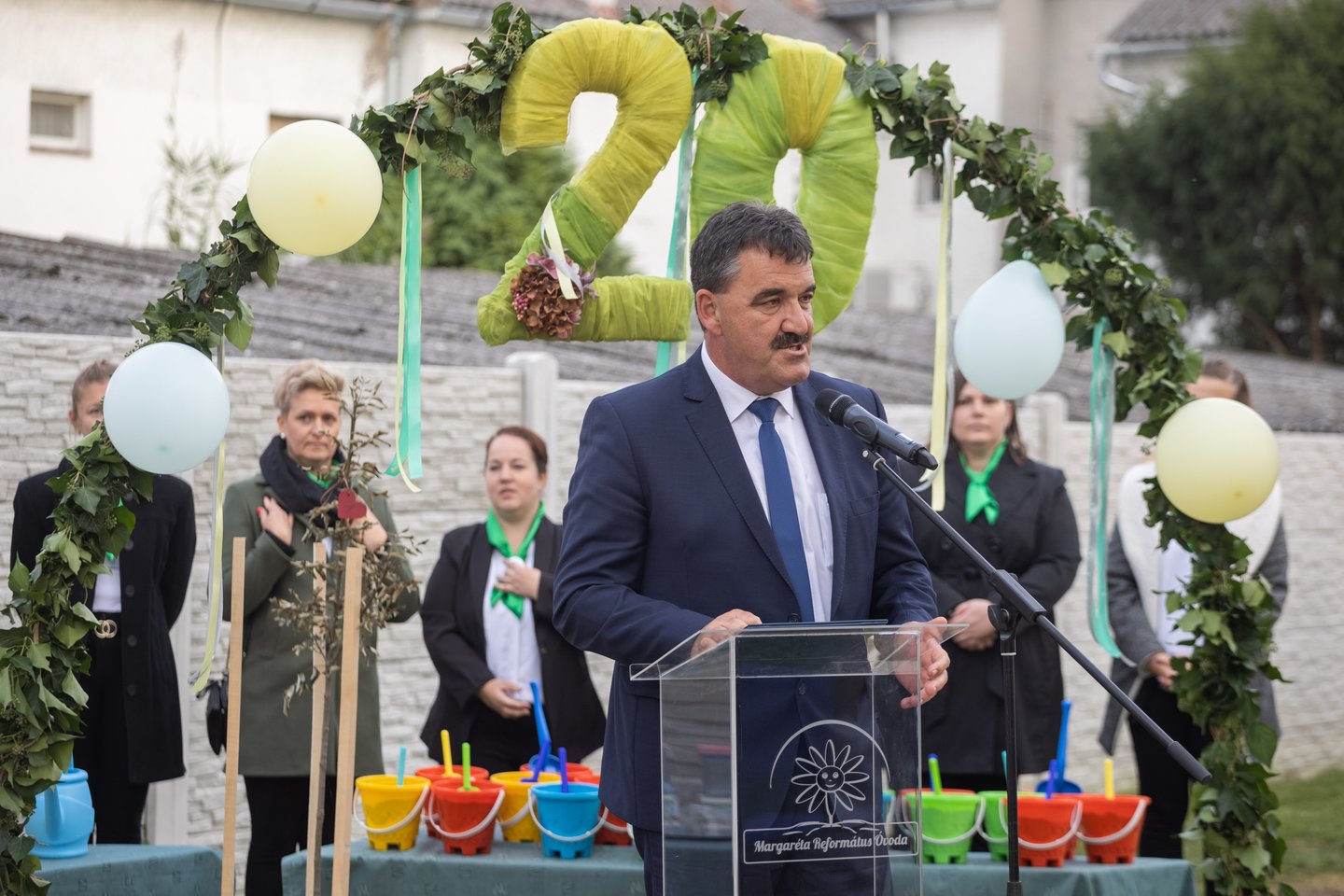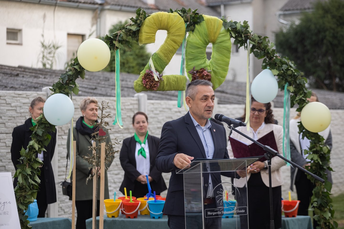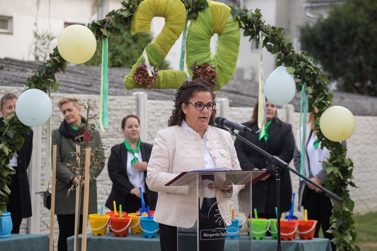 Schott Ágnes igazgató köszöntőjében hálát adott az elmúlt húsz év áldásaiért. Az intézmény 2003 óta működi református szellemben, de az épületben már 1949-ben is óvoda üzemelt. Az elmúlt húsz évben korszerűsítették és bővítették az intézményt. „Célunk, hogy testileg-lelkileg harmonikus, sokoldalúan fejlett gyermekeket neveljünk, jellemes keresztyén emberi értékeknek megfelelően” – számolt be.