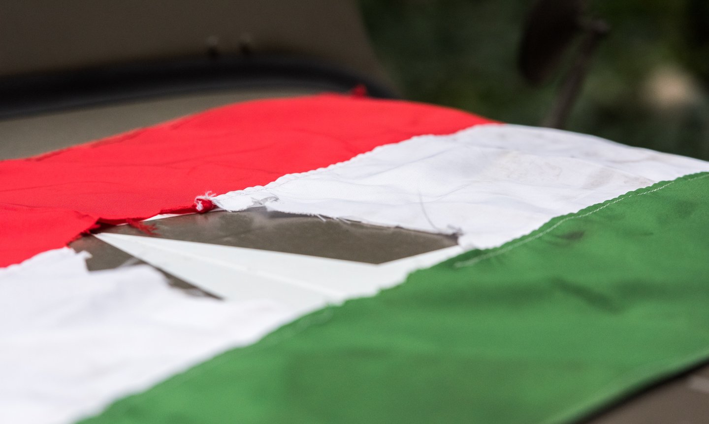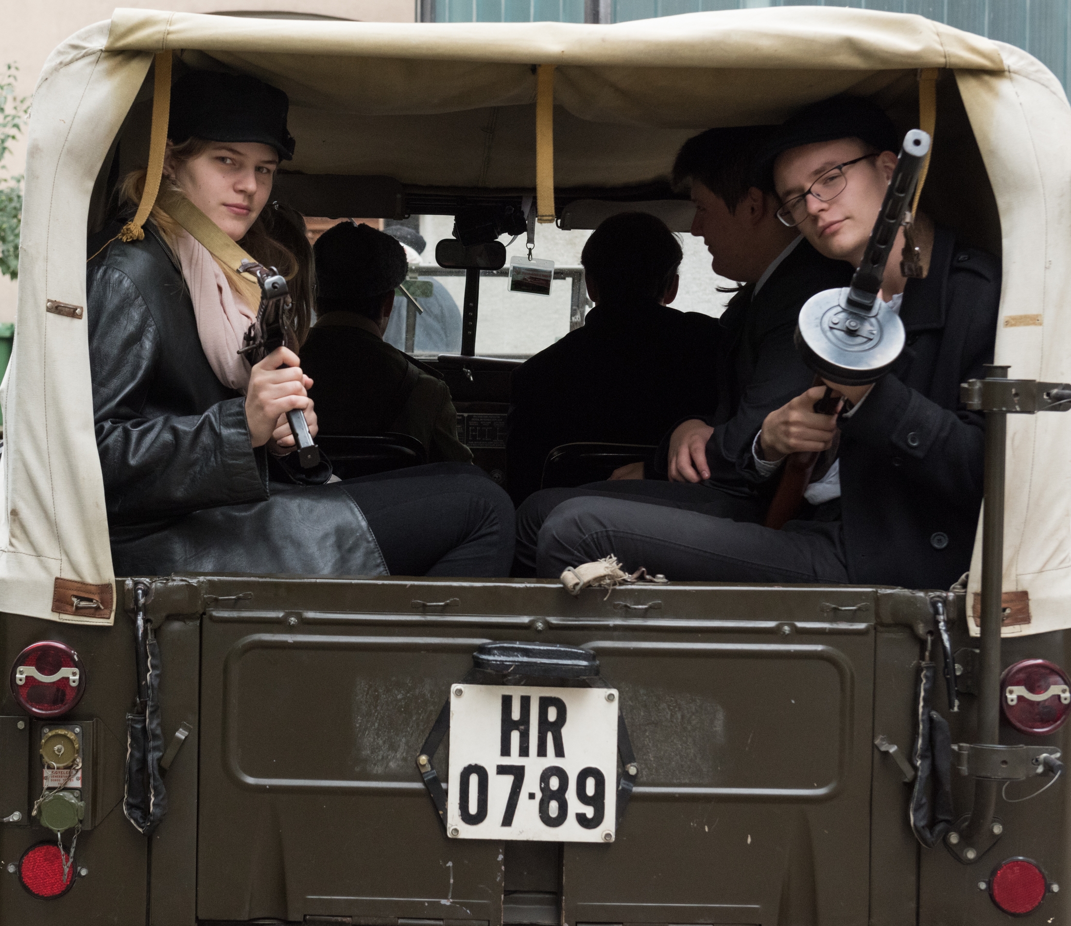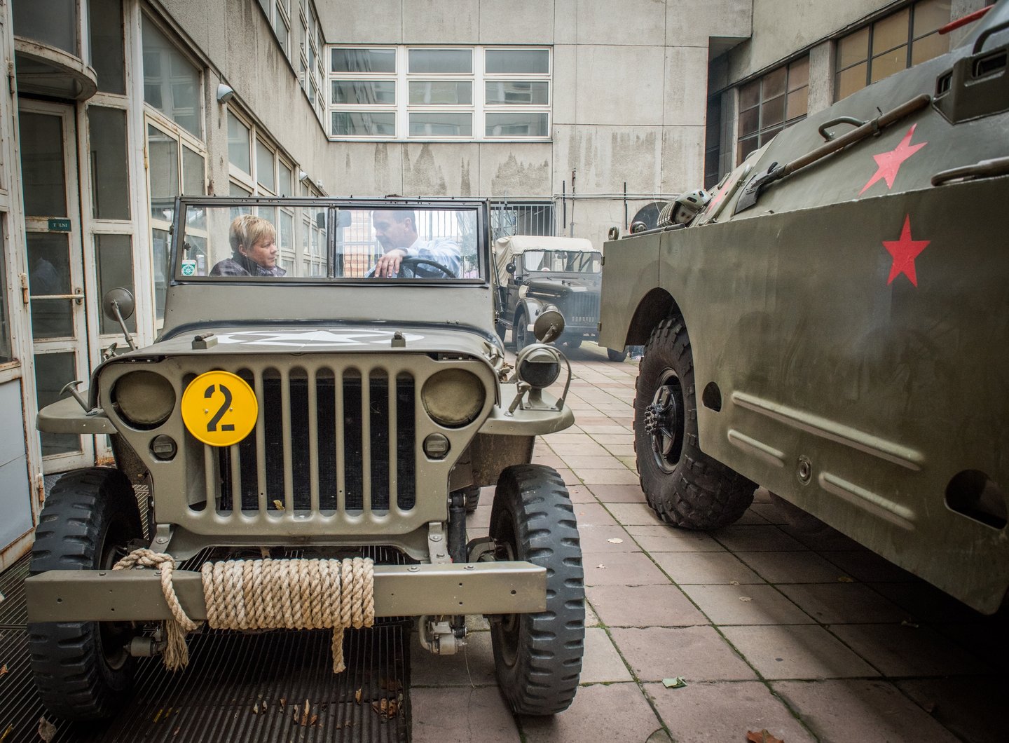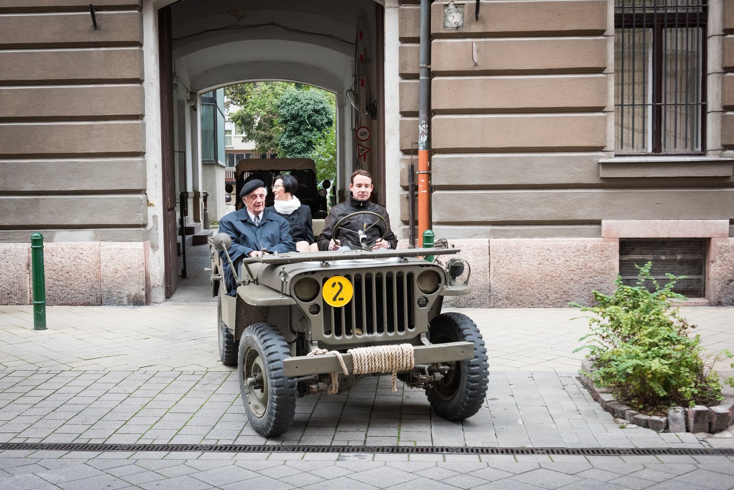 A felkelőközpontból kilépve katonai dzsip szeli át az udvart, rajta forradalmárok.