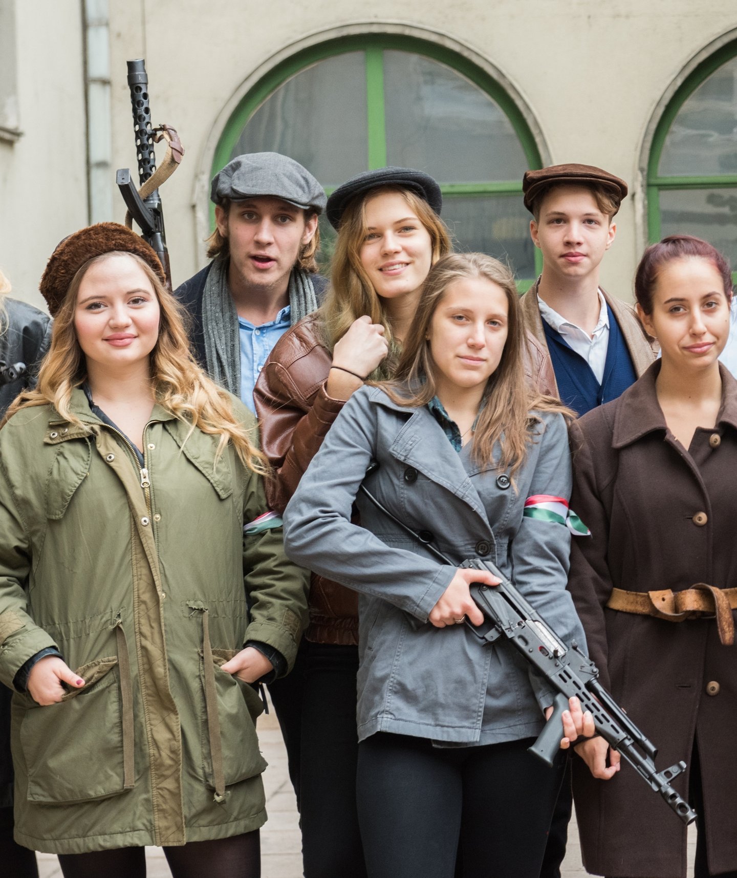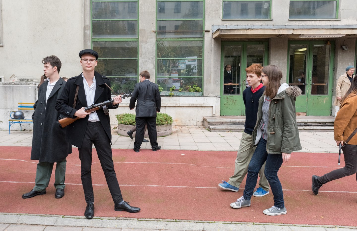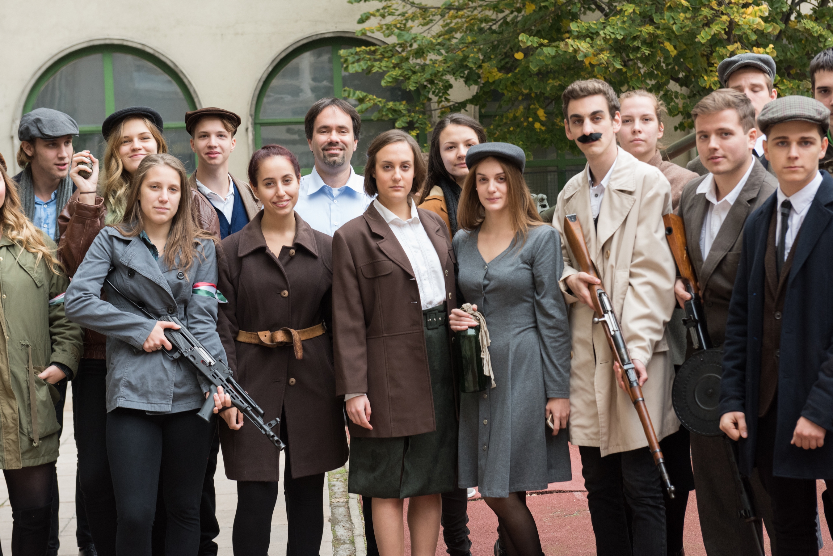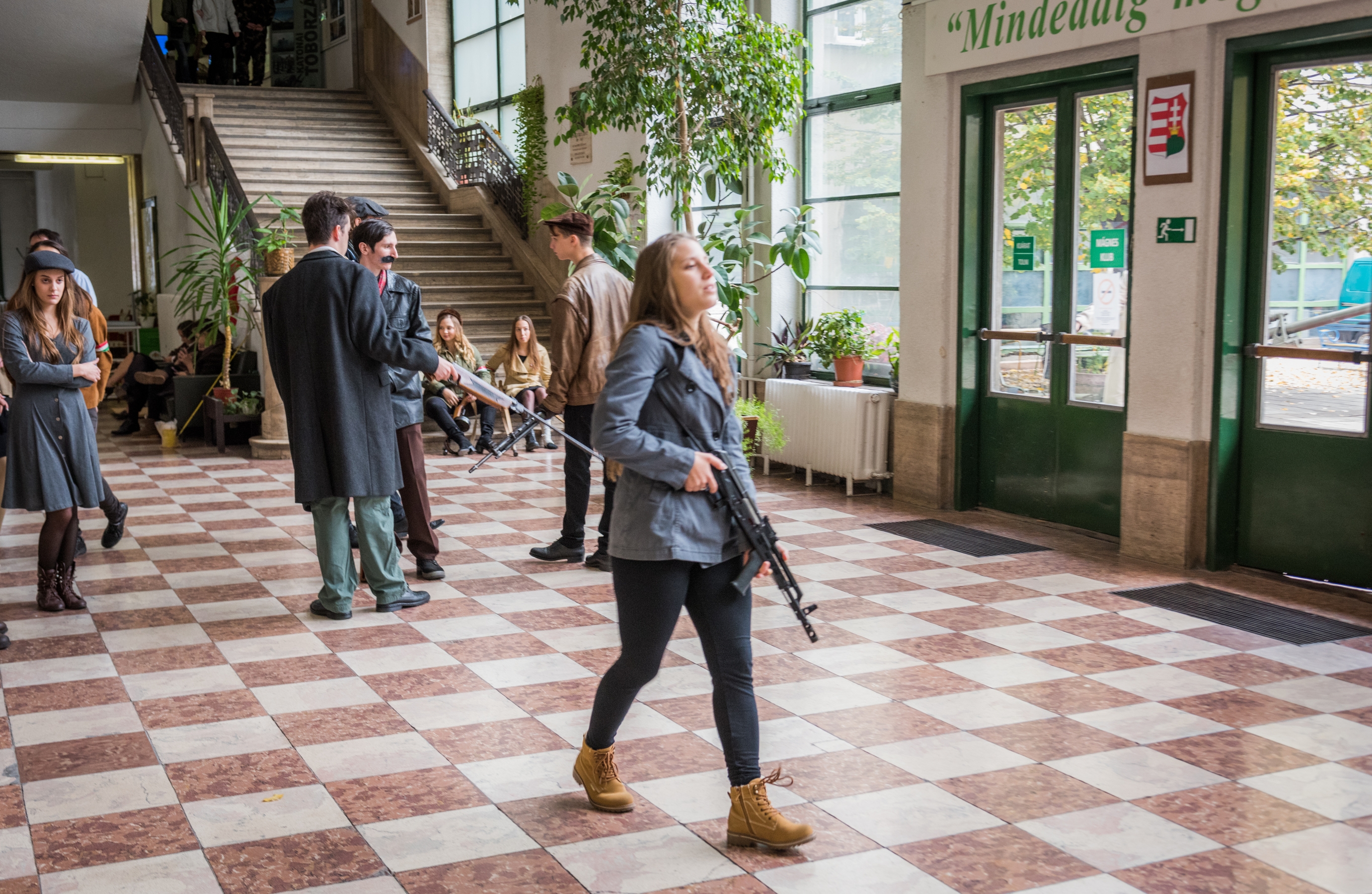 Mikes Adél forradalmár, 12. A osztályos diák fogad a kapuban. A lány azt mondja, hogy az igazgató úr és a történelem tanár ötlete volt a rendhagyó ünnepi megemlékezés. A korhű ruhába öltözött lány oldalán kalasnyikov lóg. Elárulja, hogy valódi a fegyver, de azonnal megnyugtat, hogy nincs élesítve.