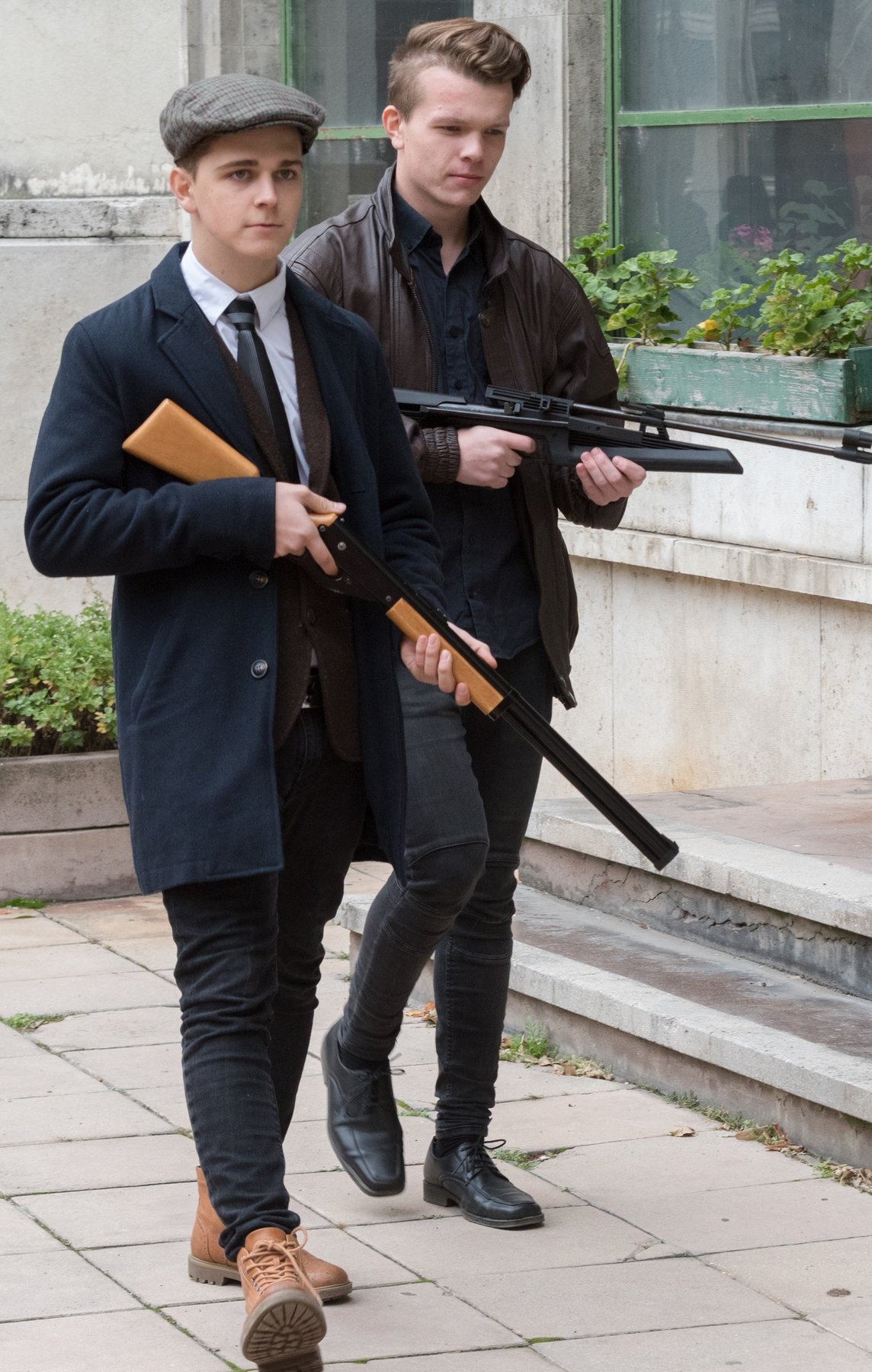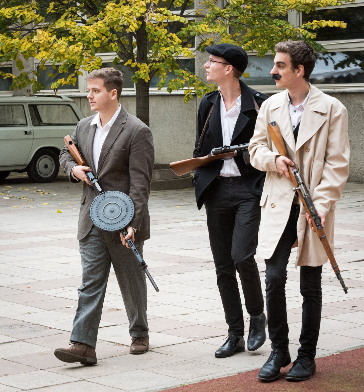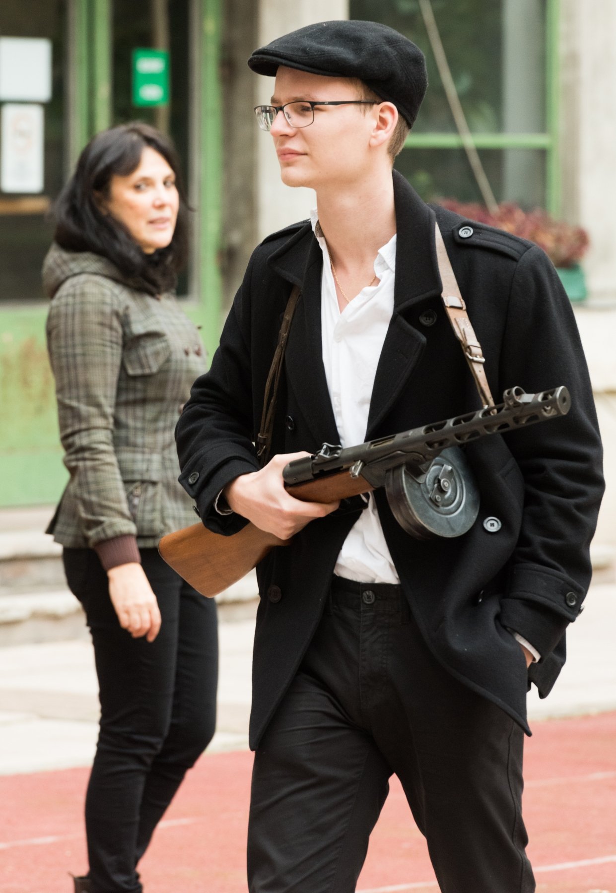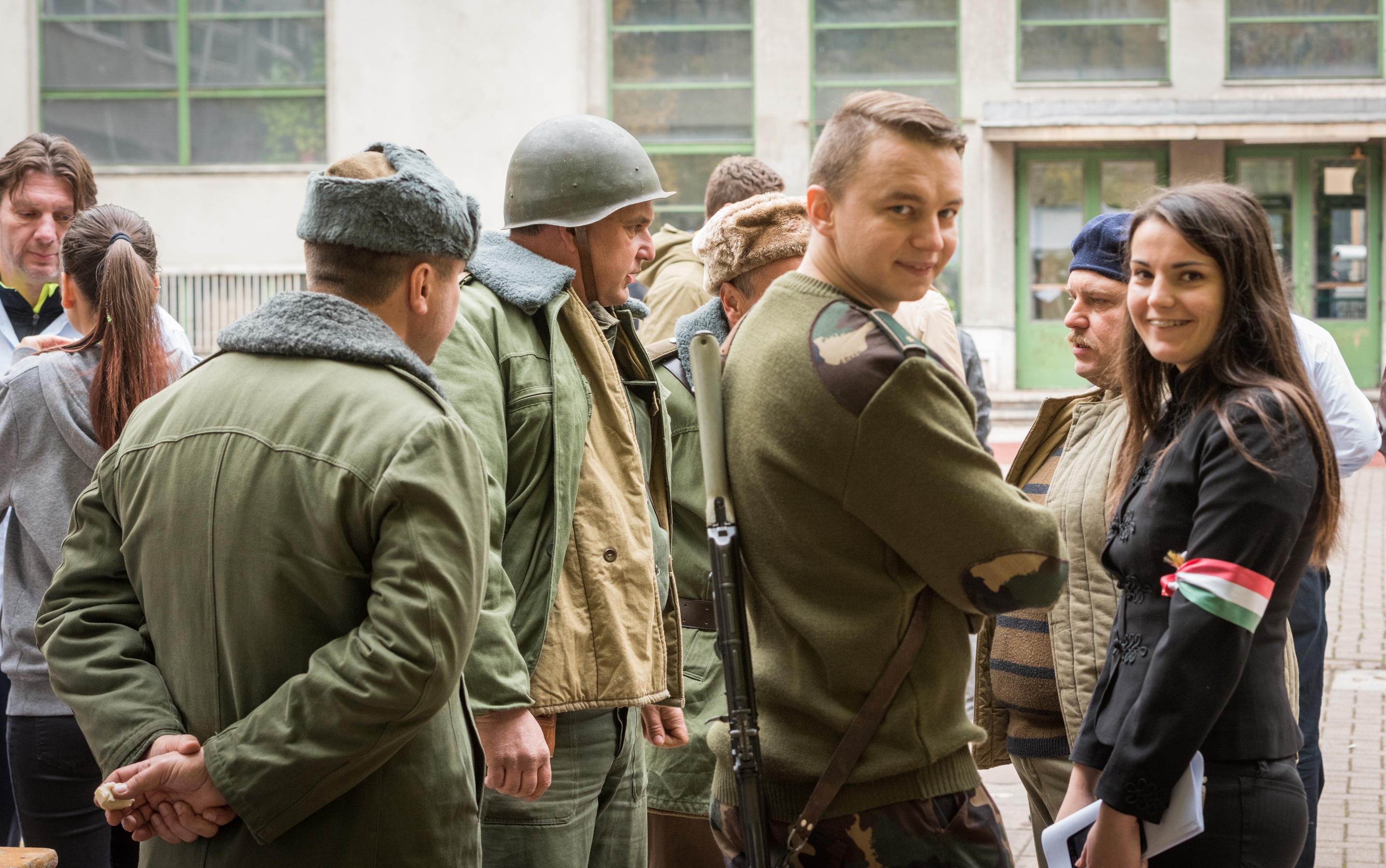 Mikes Adél forradalmár, 12. A osztályos diák fogad a kapuban. A lány azt mondja, hogy az igazgató úr és a történelem tanár ötlete volt a rendhagyó ünnepi megemlékezés. A korhű ruhába öltözött lány oldalán kalasnyikov lóg. Elárulja, hogy valódi a fegyver, de azonnal megnyugtat, hogy nincs élesítve.