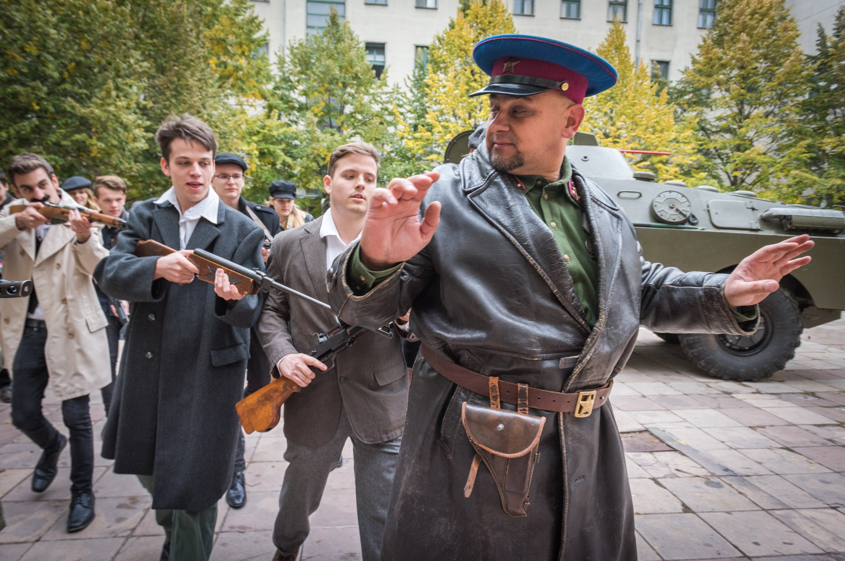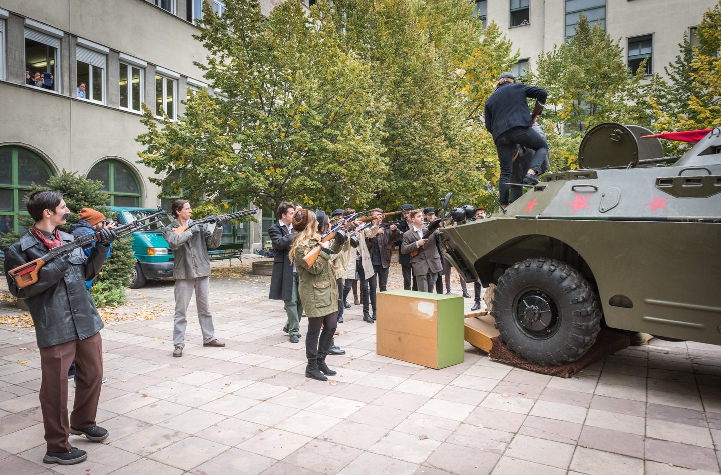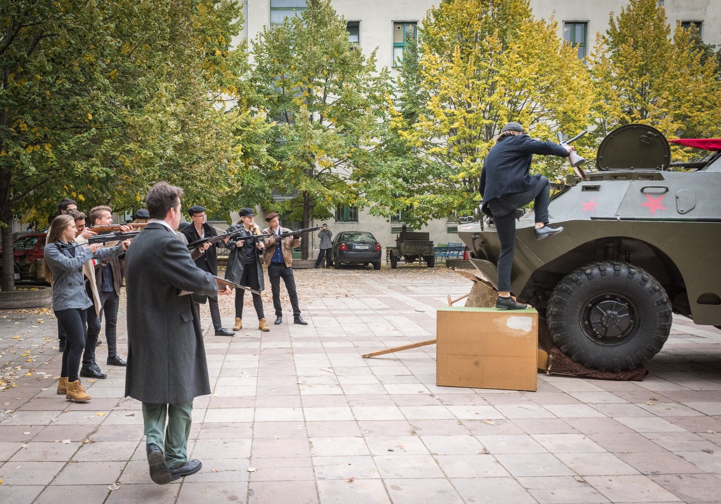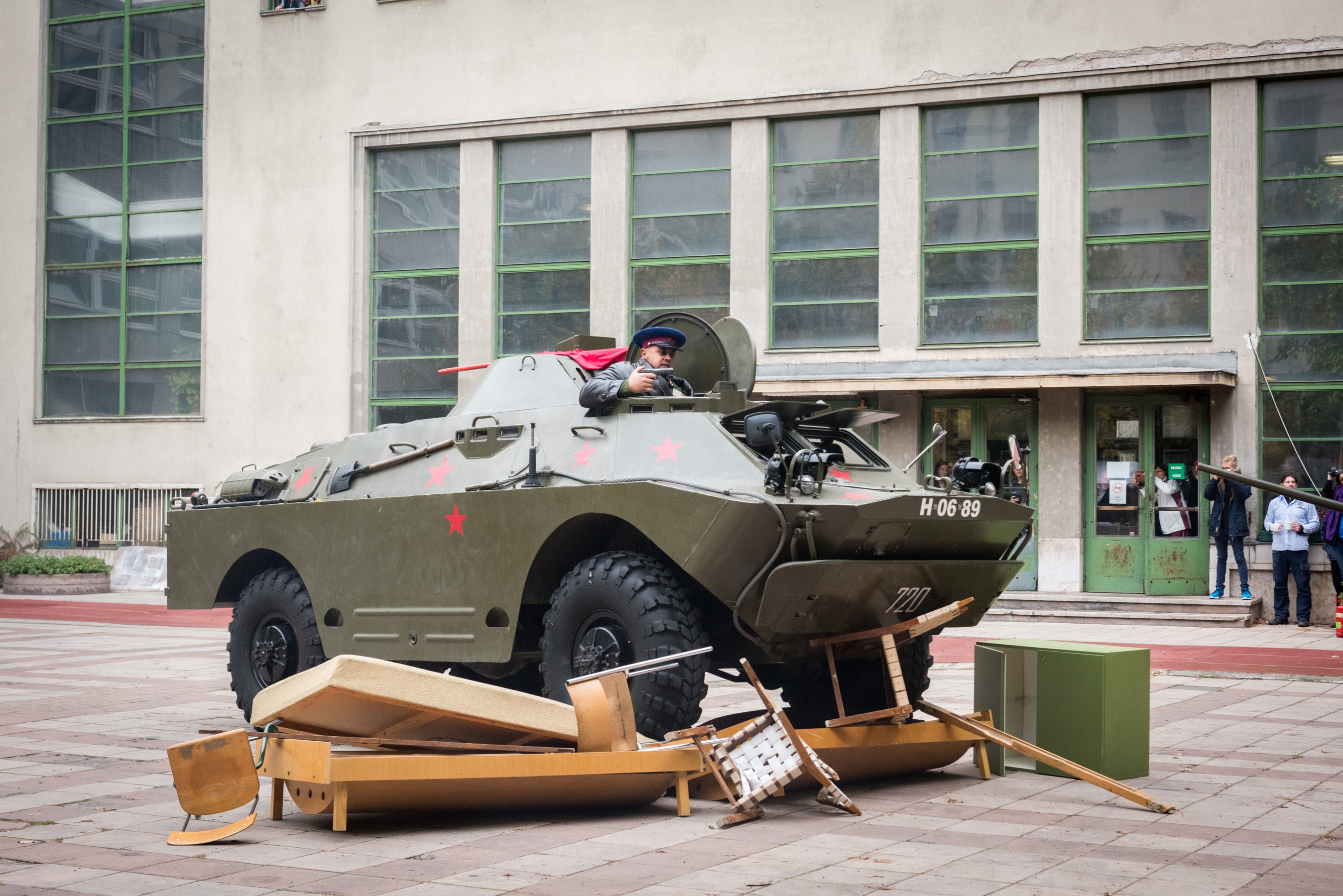 Pillanatokon belül feldübörög az udvaron a páncélozott harckocsi. Benne egy szovjet tiszt, akit Kozma Károly orosz hagyományőrző alakít. Nagy erővel nekihajt az udvaron összetákolt barikádnak. Az iskolaablakok megtelnek diákokkal.