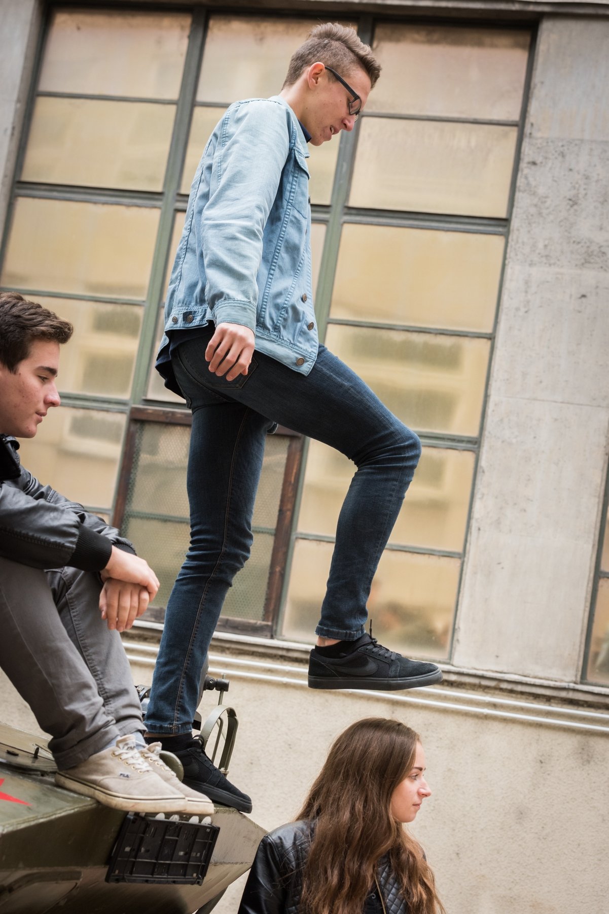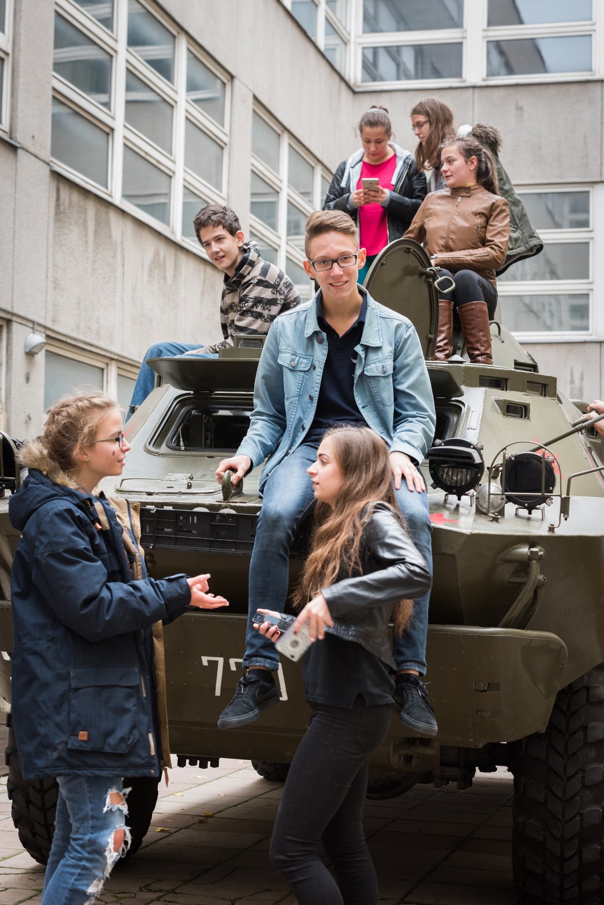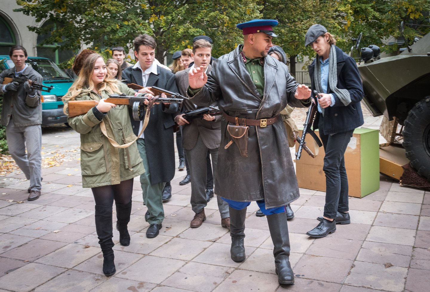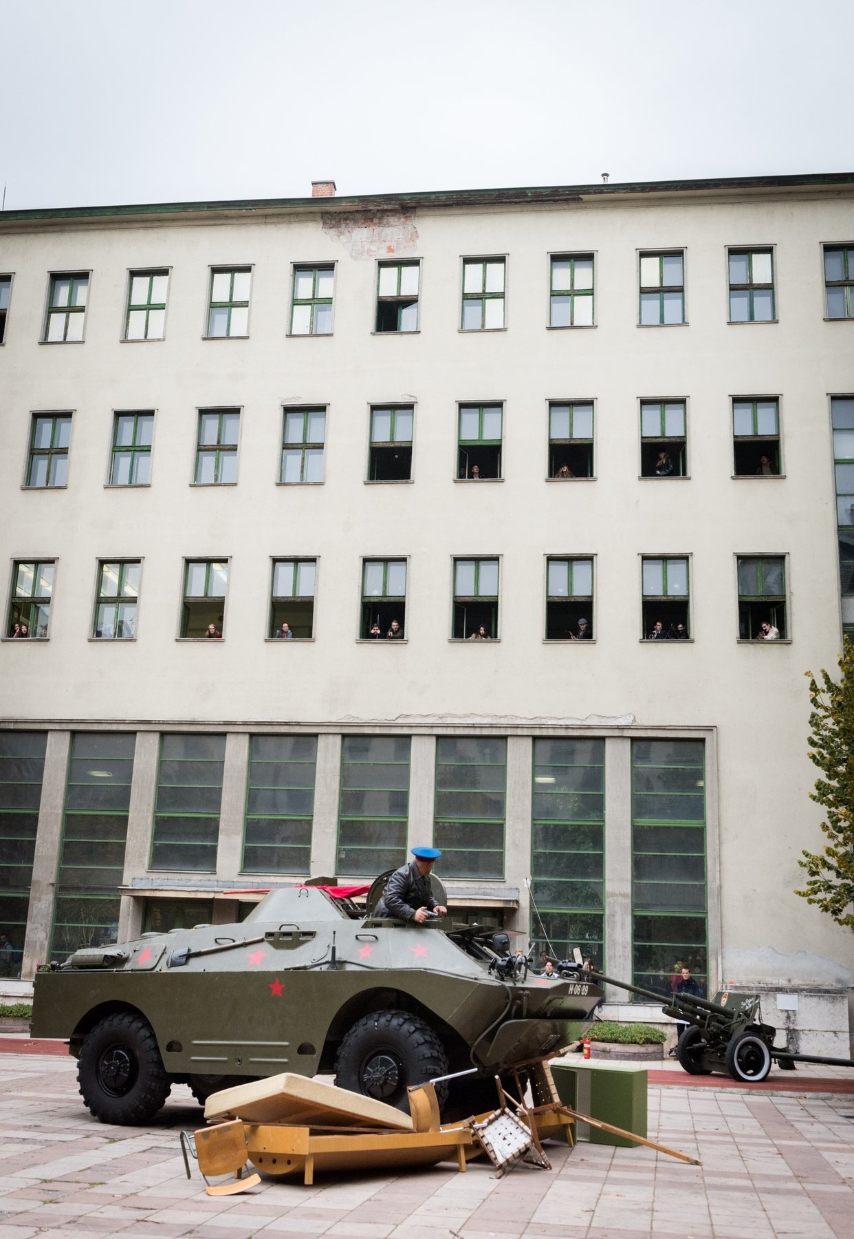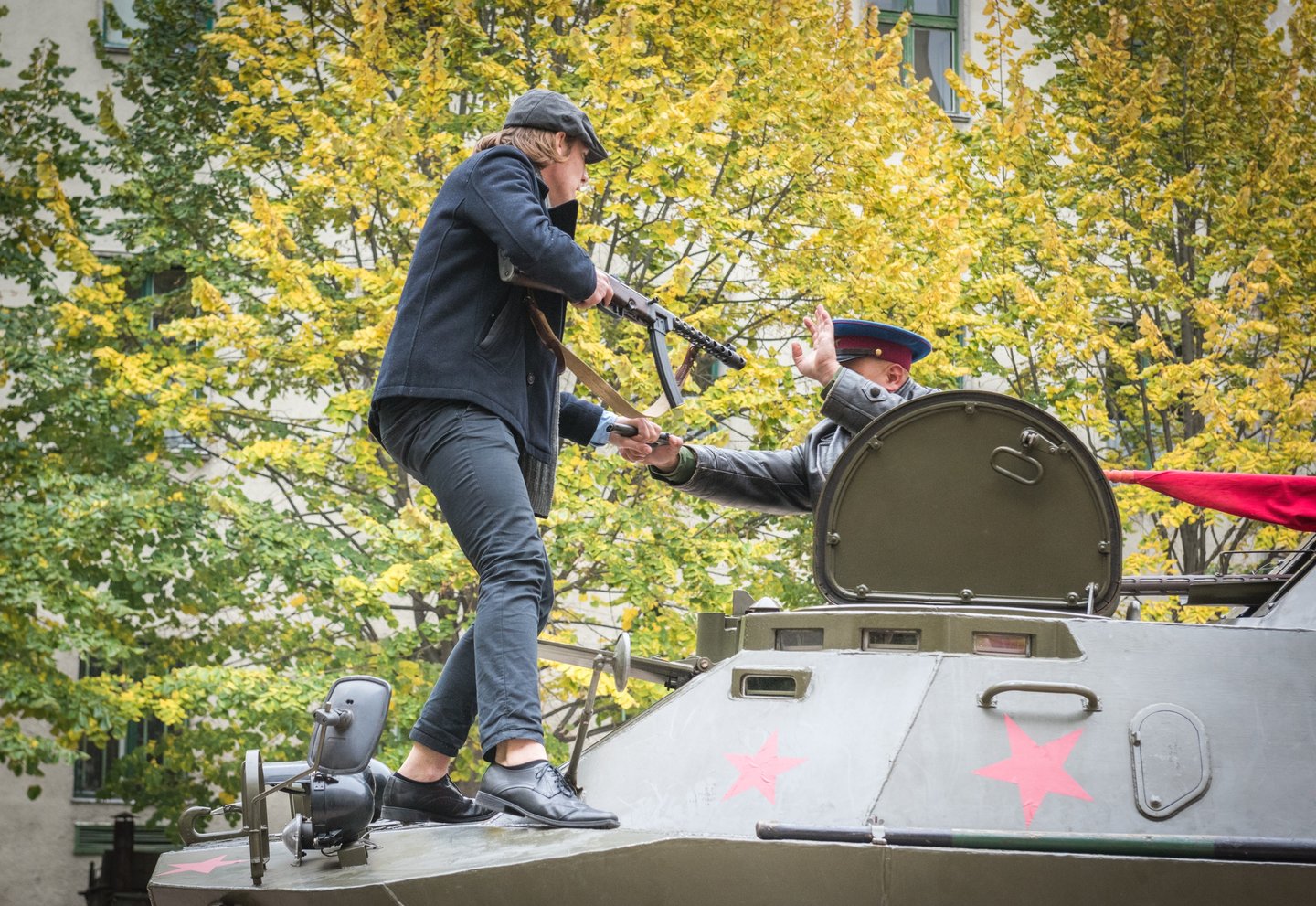 Pillanatokon belül feldübörög az udvaron a páncélozott harckocsi. Benne egy szovjet tiszt, akit Kozma Károly orosz hagyományőrző alakít. Nagy erővel nekihajt az udvaron összetákolt barikádnak. Az iskolaablakok megtelnek diákokkal.
