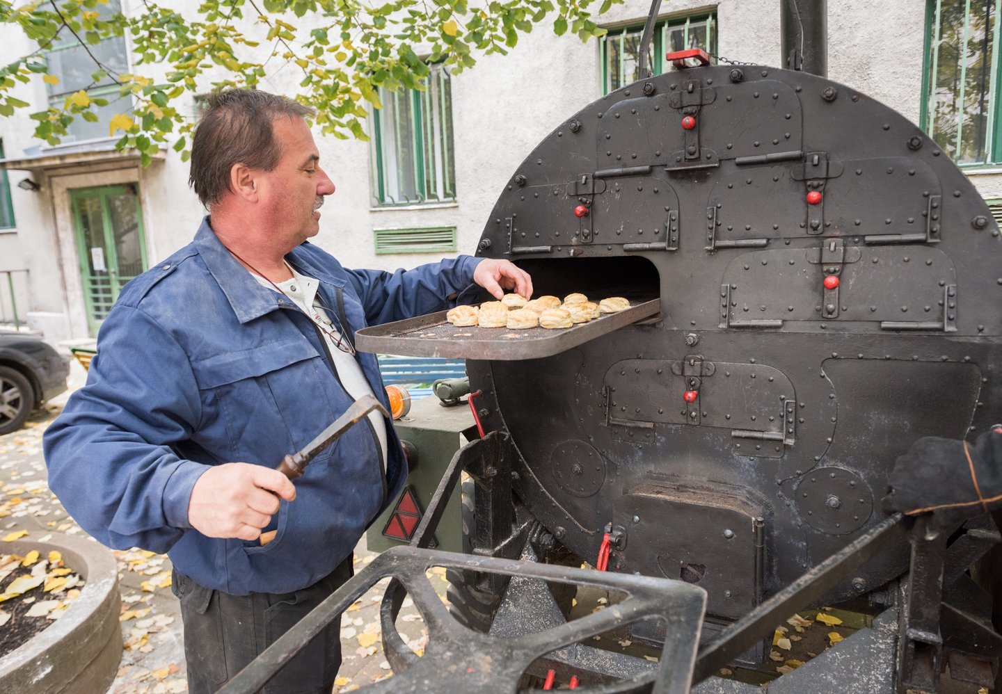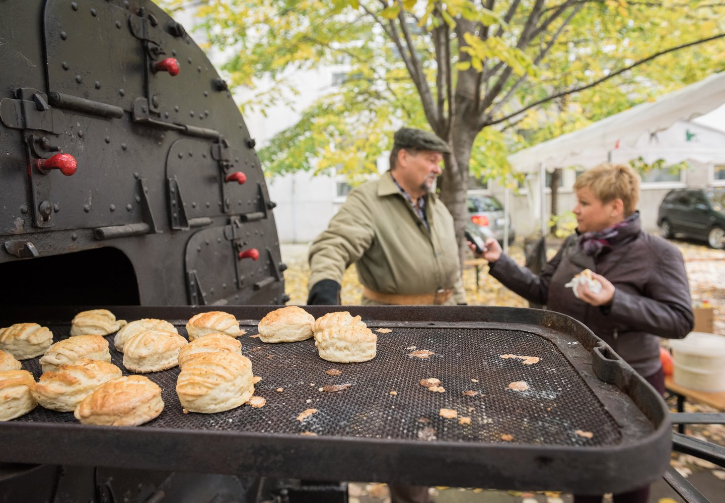 Távolabb, a mobil tábori kemencében pogácsa sül. Cserép Árpád, a hadikonyha-hagyományőrzők vezető szakácsa szívesen mesél a különös szerkezetről. – A mobil tábori kemencét 1901-ben rendszeresítették Magyarországon. Korábban az volt a gyakorlat, hogy a helyben talált kemencékben sütöttek, így látták el a katonákat. A mobilkemencét szekérvázon hordták, és hat másik szekér tartozott hozzá, amin a lisztet, a tűzifát és a személyzetet szállították. A kemencében menet közben is tudtak sütni, és a menetoszlop nyugodtan folytathatta útját – meséli és megkínálja a haditudósítót egy forradalmi pogácsával.