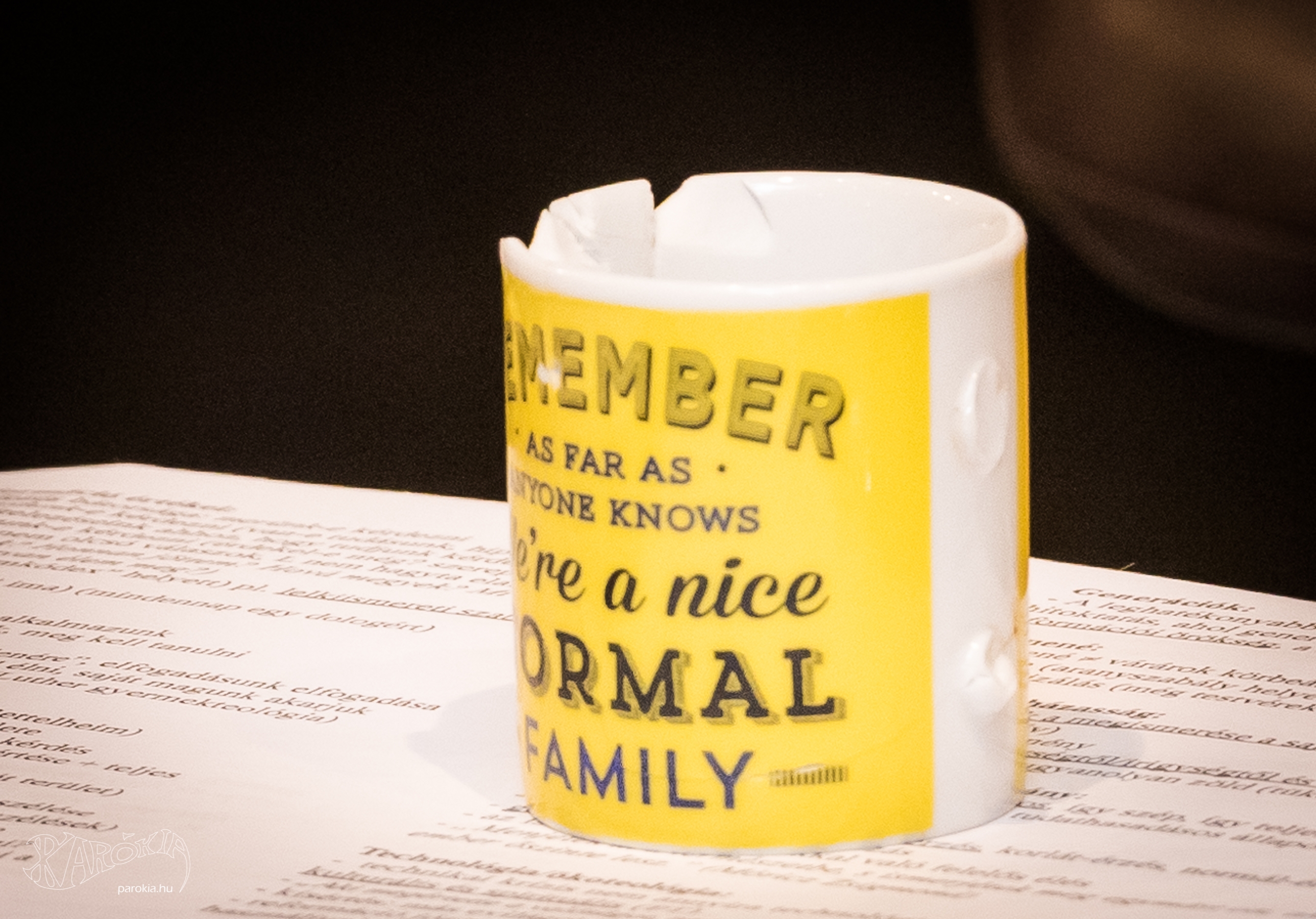Eszter arról mesélt, amikor Írországban tartózkodott éppen egy tudományos konferencián, és már nagyon hiányzott neki a férje. Hazaindulás előtt meglátott egy bögrét, amelyre az volt írva: „Ne feledd, mindenki úgy tudja, hogy mi egy normális, kedves család vagyunk.” Megvette. Tamás örült is neki itthon. Másnap reggel abból ivott, majd harmadnap is. A következő napon azonban valamin összekülönböztek, s elkeseredésében Eszter összetörte a bögrét.