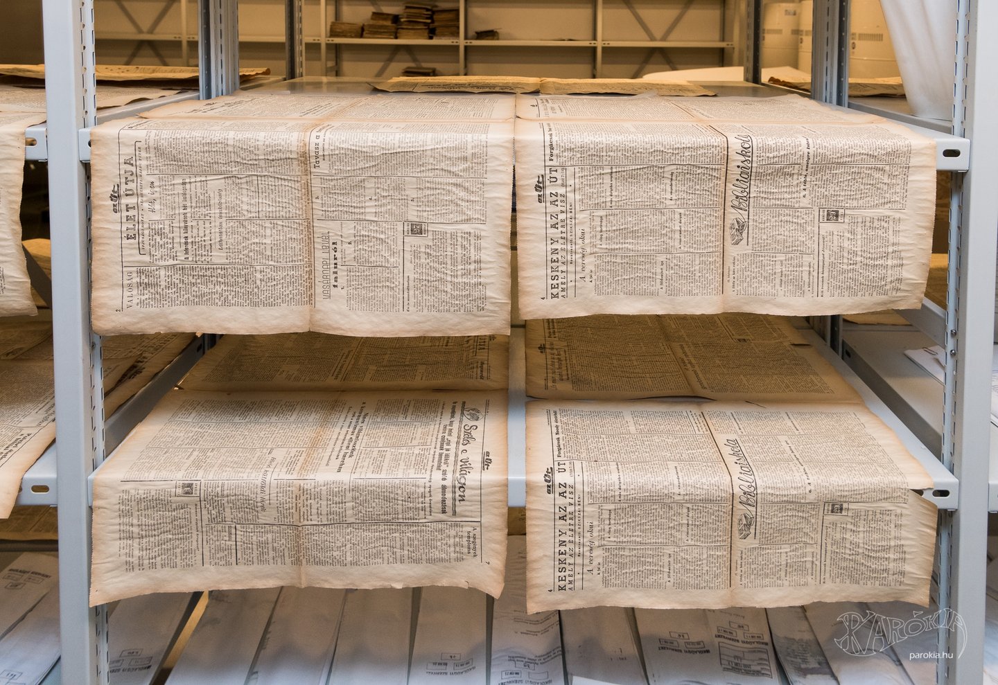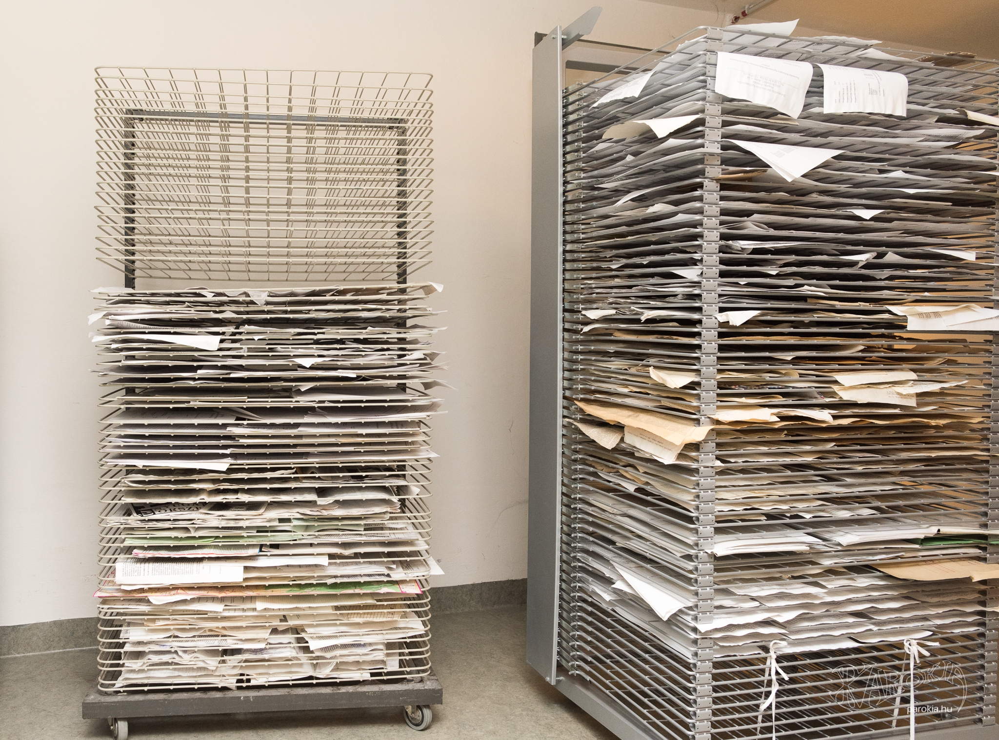 „Vannak kifejezetten a nedves iratok kiszárítására gyártott szárítóállványaink. Viszonylag egyszerű szerkezetek, de más levéltárakban nem nagyon van ilyen, általában csak restaurátor-műhelyekben akad egy-kettő” – mondta a főigazgató.