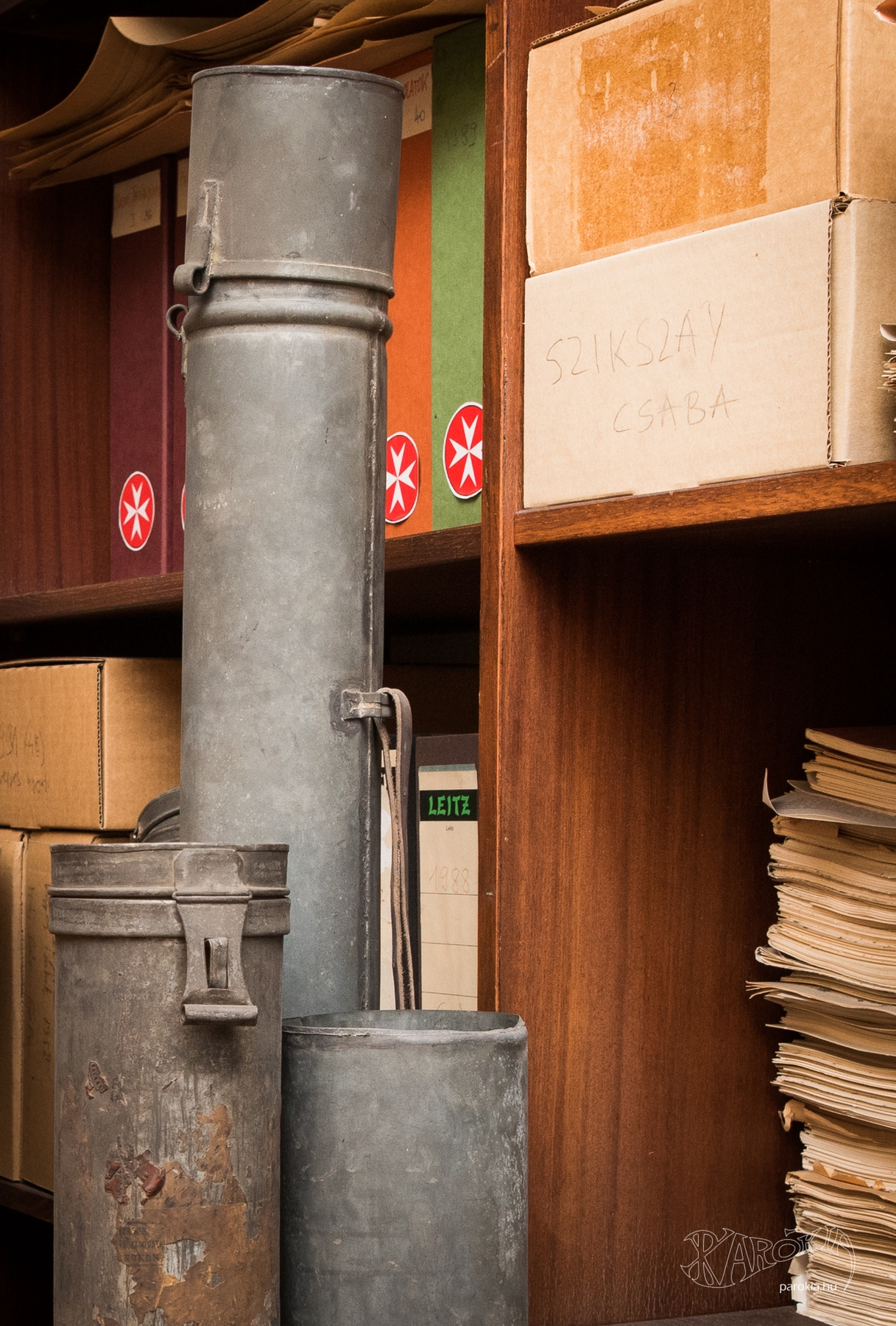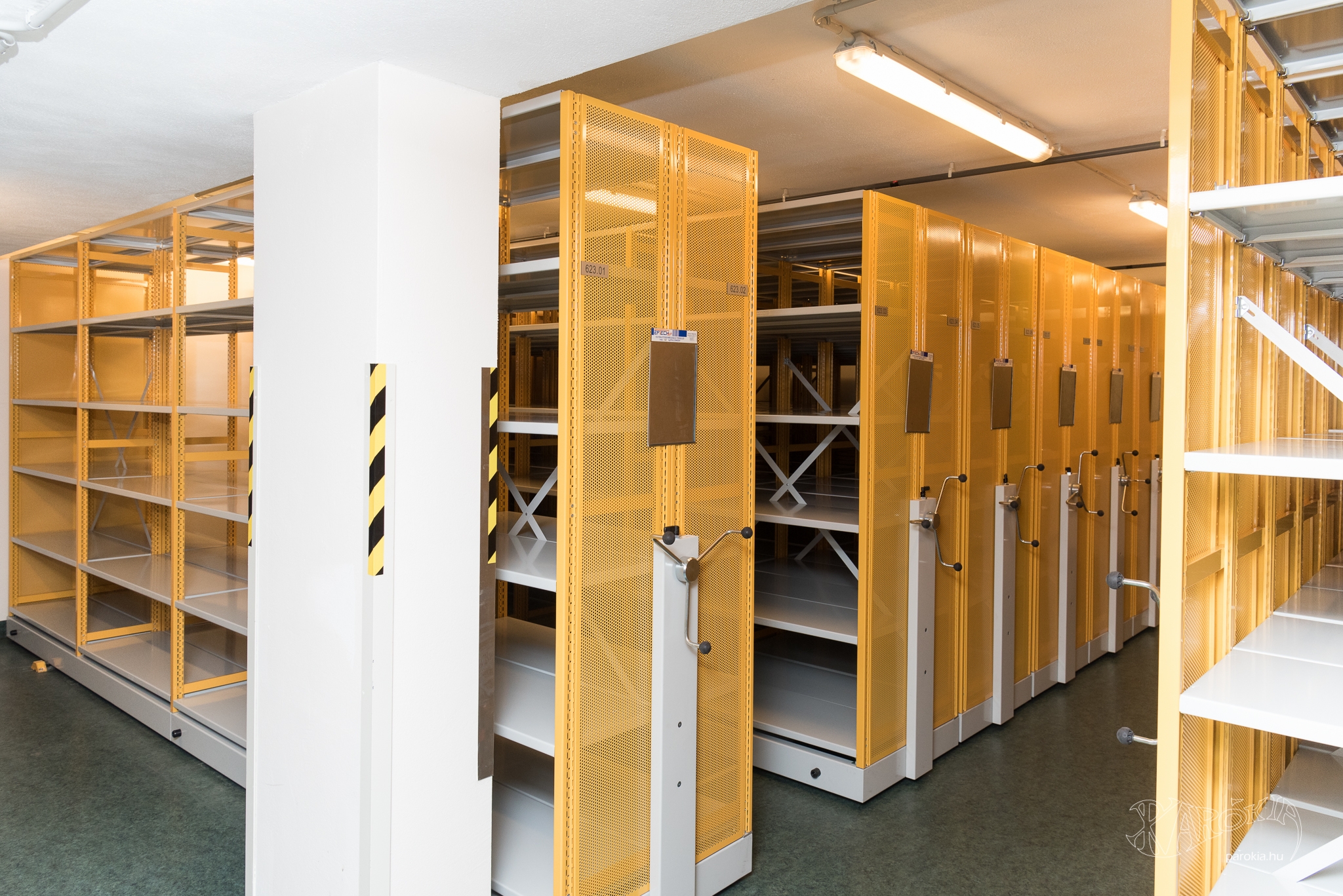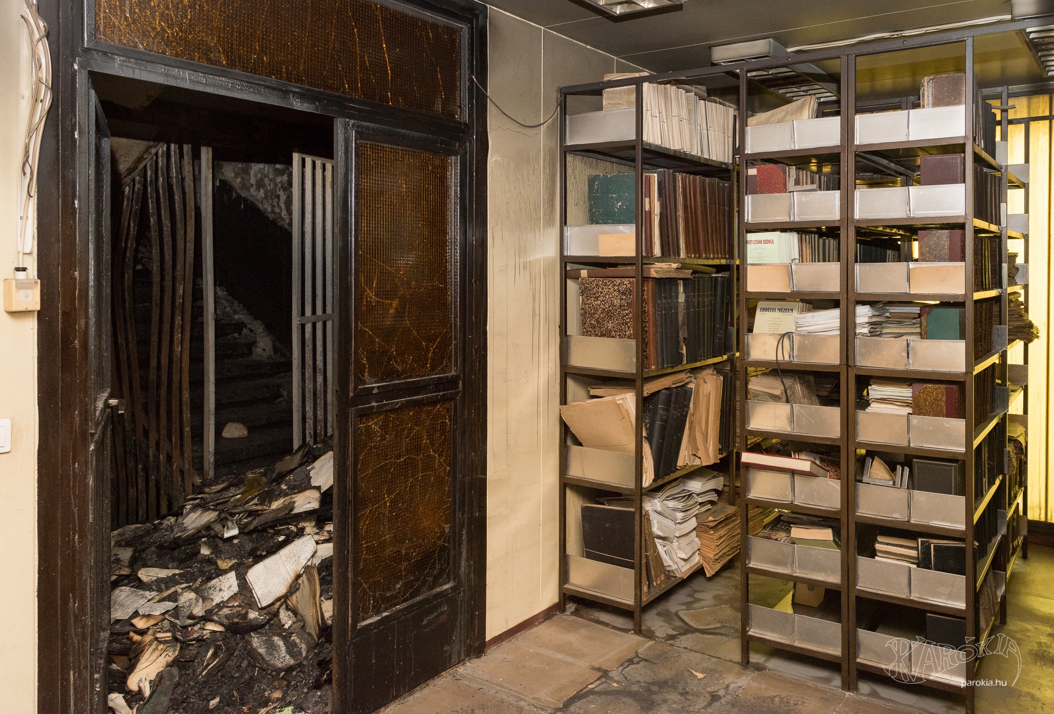 „Ezt az épületet lebontják, emiatt is sürgőssé vált a levéltár kiköltöztetése. A padlóról mindenhonnan eltűnt a víz, de nagyon magas még a páratartalom, és vannak repedések a mennyezeten, ahonnan még szivároghat le víz. Ezeket folyamatosan figyeljük, beosztottuk egymás között, ki mikor van itt” – vázolta fel a jelenlegi helyzetet Szatmári Judit. „Először a piaristák hoztak páramentesítőket, majd Debrecenből kaptunk nagyobb teljesítményűeket. Most már elegendő áram is van a működtetésükhöz. A villanyszerelők egész hétvégén dolgoztak azon, hogy a hálózat elbírja a készülékek terhelését. A tűzeset után először a szeretetszolgálat aggregátora és a szomszédos étterem biztosított áramot. Nagy hála van bennünk mindezekért.