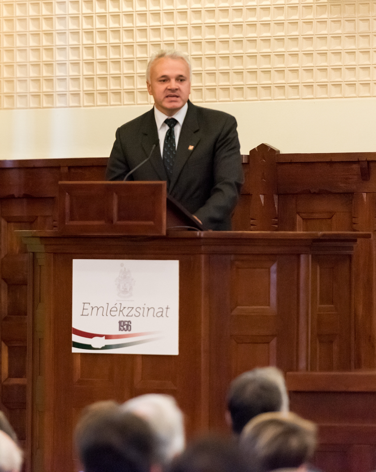 „1956-ban egy kicsiny, rabságba döntött, megnyomorított és a nagyok által útszélre vetett ország, Magyarország szolgálatába állt a történelem” – kezdte beszédét Bogárdi Szabó István püspök, a Magyarországi Református Egyház Zsinatának lelkészi elnöke. „Ennek azonban 1956-ban és a forradalom eltiprása után három bő évtizedig, valamint a mára nézve is elkötelező következményei vannak. Amit egy társadalom vagy politikai közösség megadhat számunkra, az csak szükséges feltétele lehet méltó keresztyén életünknek. Az elégséges feltétel felragyogtatása és érvényre juttatása más és nagyobb mélységhez vezet. Jól értették ezt 1956-1957-ben a magyar református gyülekezetek presbitériumai is, akik nyilatkozataikban – már a forradalom leverése után is – annak adtak hangot, hogy szabadságunknak ez az igazi tétje” – folytatta Bogárdi Szabó István.