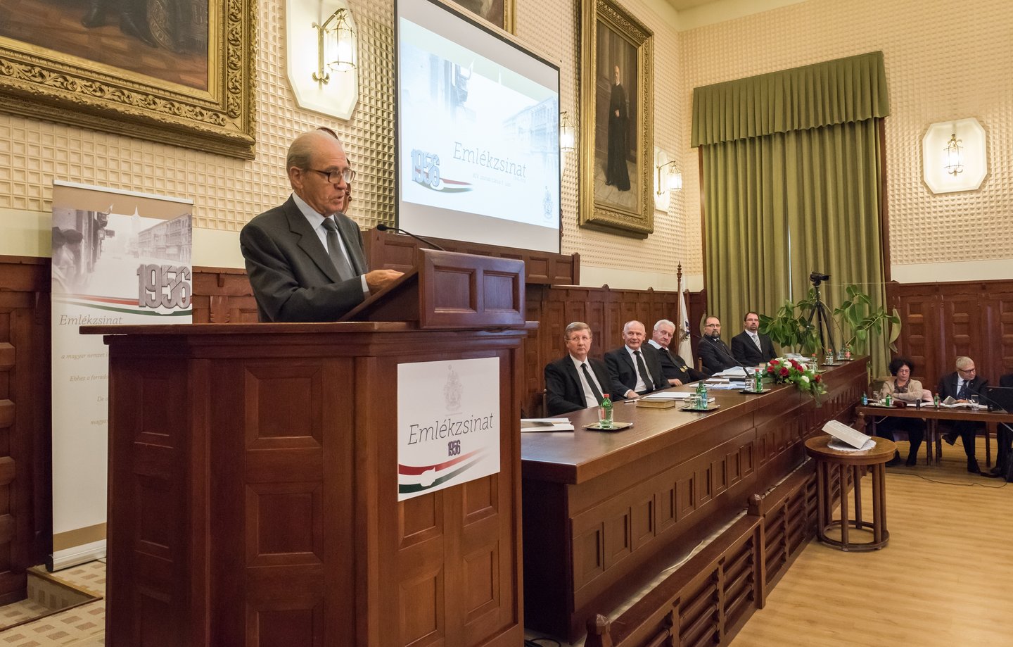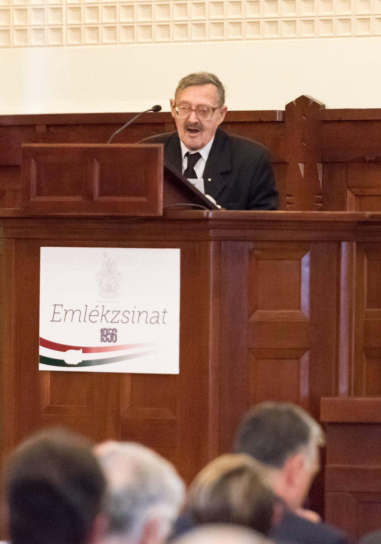Regéczy-Nagy László, a Történelmi Igazságtétel Bizottság elnöke, magyar katonatiszt, akit az 1956-os forradalomban viselt szerepe miatt börtönbüntetésre ítéltek, úgy fogalmazott az ünnepi ülésen, hogy a „diktatúrában lassan alakul ki hiteles közvélemény, hiszen az egész rendszer minden lyukból ugyanazt a hazugságot fújja, és aki ellene merészel szólni, vagy csak elereszti a füle mellett a vörös szózuhatagot, pórul jár! Ezért érezzük még utólag is elkésettnek a magyar milliók reagálását. A forradalmat nem a hívő emberek robbantották ki, bár a református egyházon belül elég hamar elkezdődött az ébredés, amit később a vallatóim kálvinista ellenforradalomnak neveztek. Bibó István szerint 56-ban az egész magyarság egy fejjel magasabb volt önmagánál, s így zúgott bele történelmünkbe »az emberi méltóság forradalma«”.