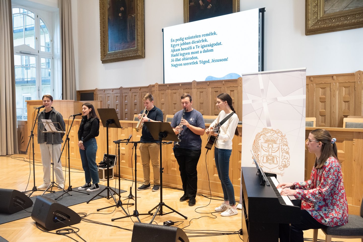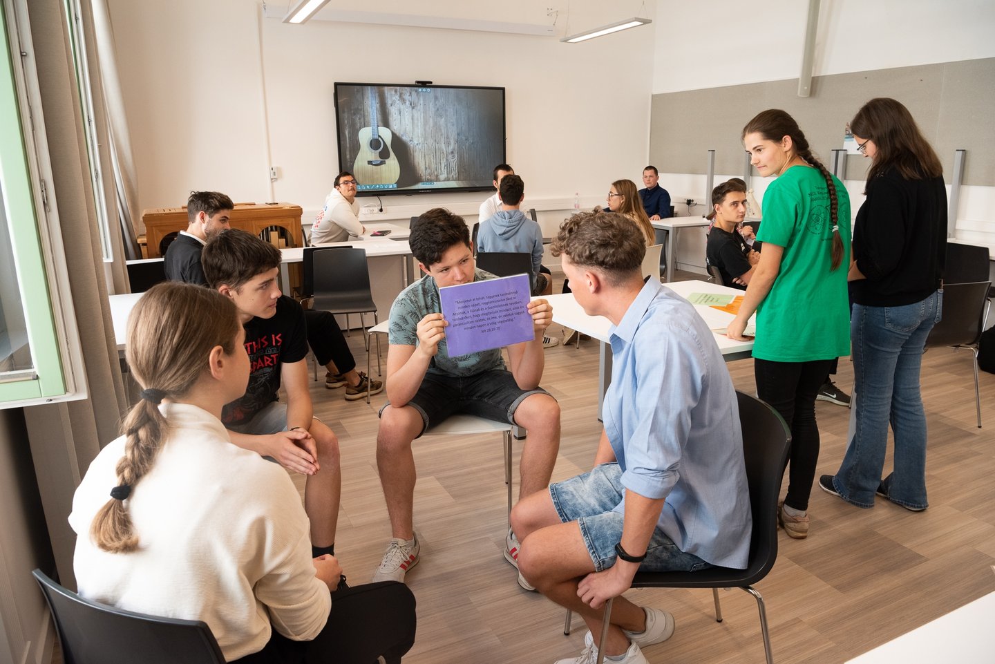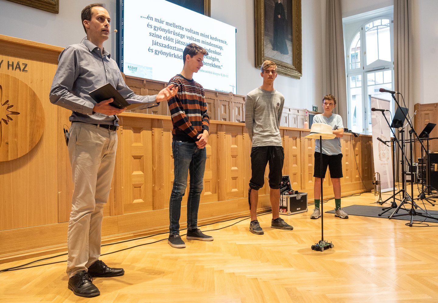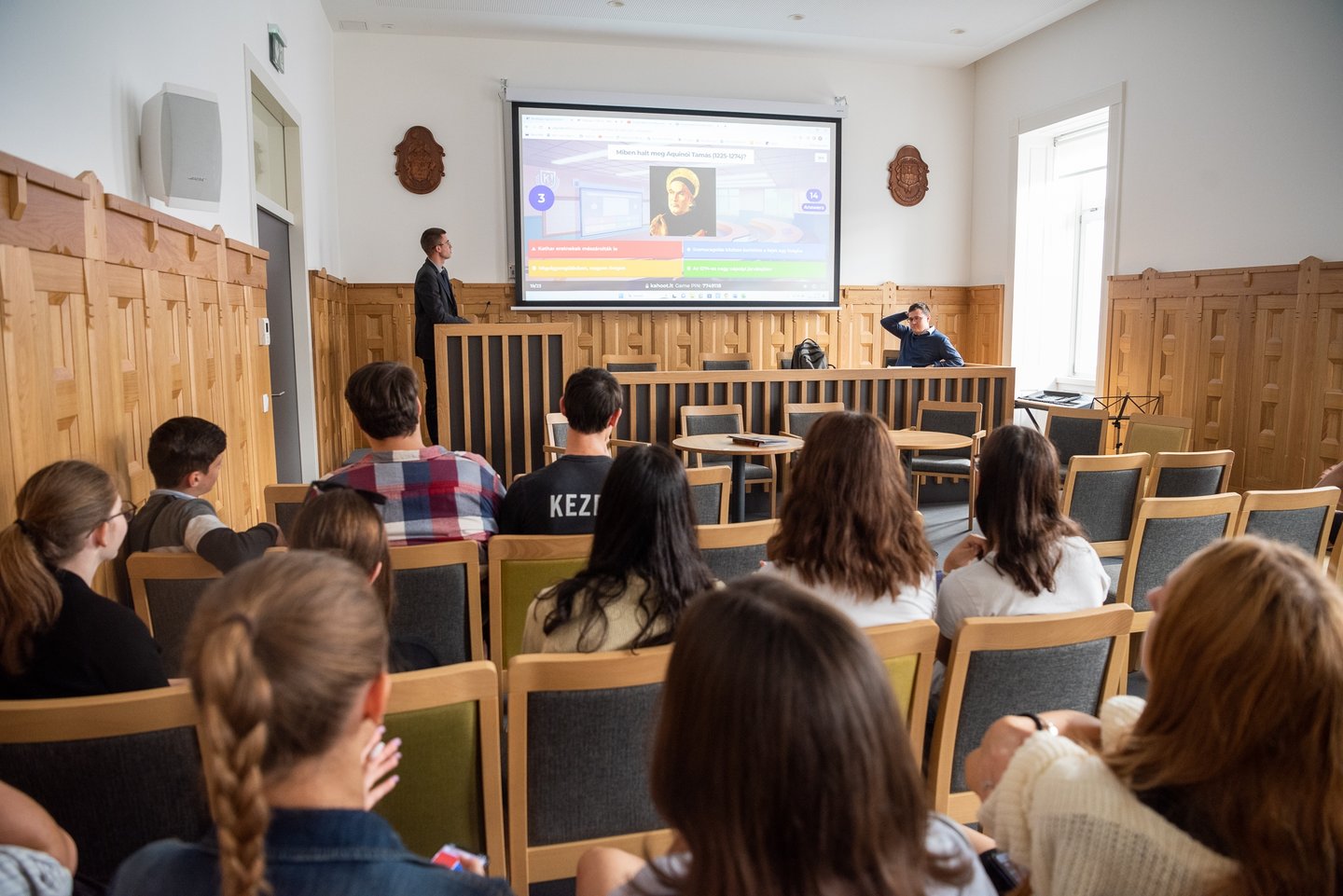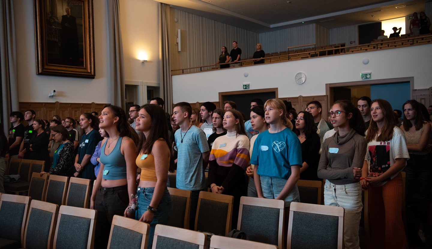 Az ifjúsági nap játékos, közös lezárására a díszteremben került sor, ahol a diákok testhelyzetükkel fejezhették ki mindazt, amit a délelőtt folyamán kaptak. A Ráday Ház végül helyben elkészített pizzaebéddel búcsúzott el tőlük.