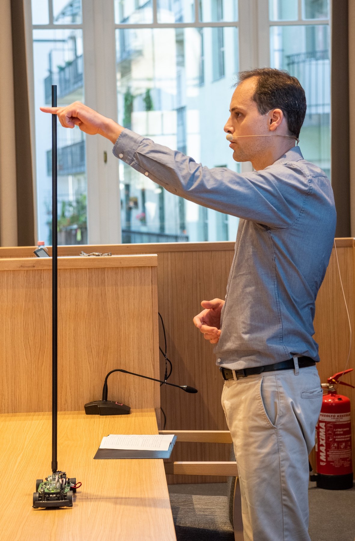 Mindezt egy mozgó kocsira rögzített inverz inga és néhány önkéntes diák segítségével szemléltette oly módon, hogy az inga rúdját egyensúlyban kellett tartani. „Számomra ez az eszköz valami többről beszél, mint puszta játékról. Olyasmit üzen, ami keresztyénségünk lényege. Olyan ez a szerkezet, mint amilyenek mi vagyunk Krisztus nélkül: nem tudunk egyensúlyba kerülni.” Jézus ereje azonban segít minket ebben, ezáltal leszünk képesek gyönyörűségére lenni.