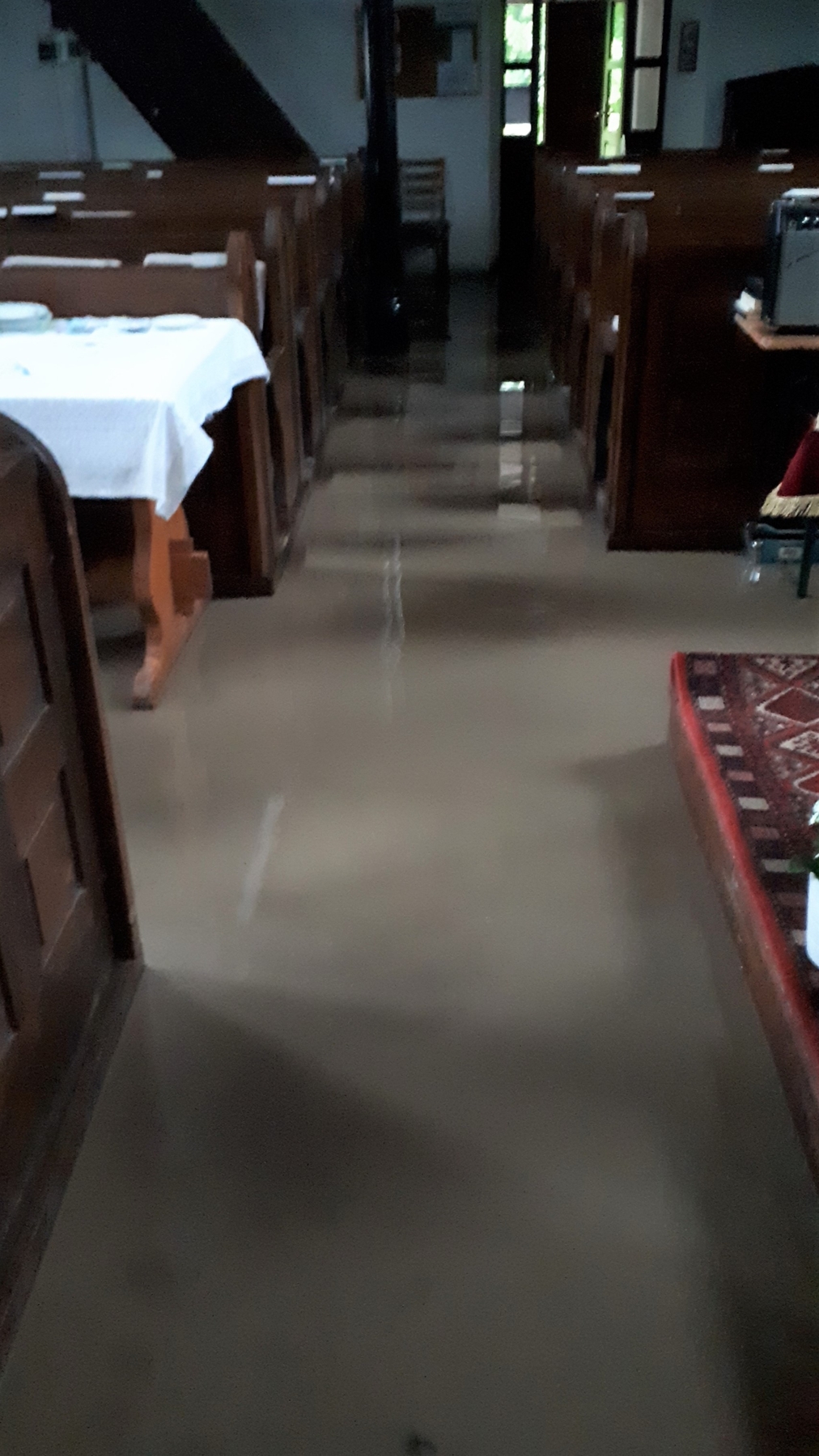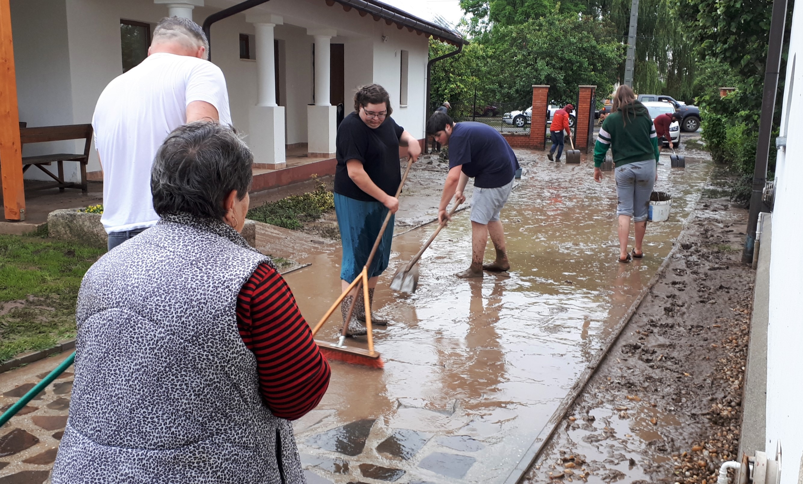 A Rákóczi utcában álló templomba is betört az esővíz, a kis gyülekezetből ezért azonnal ott termettek a segítő kezek, hogy kilapátolják a hordalékkal együtt. Ez utóbbi már nehezebb munka volt, mert az összeszerelt, masszív fapadokat egyben kellett felborogatni, hogy el tudják alóla takarítani az iszapot. A nemrégiben épült új parókia, ahol a négygyermekes lelkészcsalád lakik, csodával határos módon sértetlen maradt. „Nálunk pont a lábazat tetejéig ért a vízszint, 3 centin múlott, hogy nem tört be a lakásba. Az utca túloldalán mélyebben fekvő házakba viszont igen, bútorok mentek tönkre, pincéket és szépen gondozott kerteket árasztott el az iszap, autók csapódtak egymásnak a sodródó árban. Van, akinek 300 csirkéje pusztult el, de macskák, nyulak is odalettek. Egy falubeli családot a csecsemőjükkel együtt a tűzoltók mentettek ki, egy másik kisgyermekes családot az ablakon kellett kimenekíteni.”