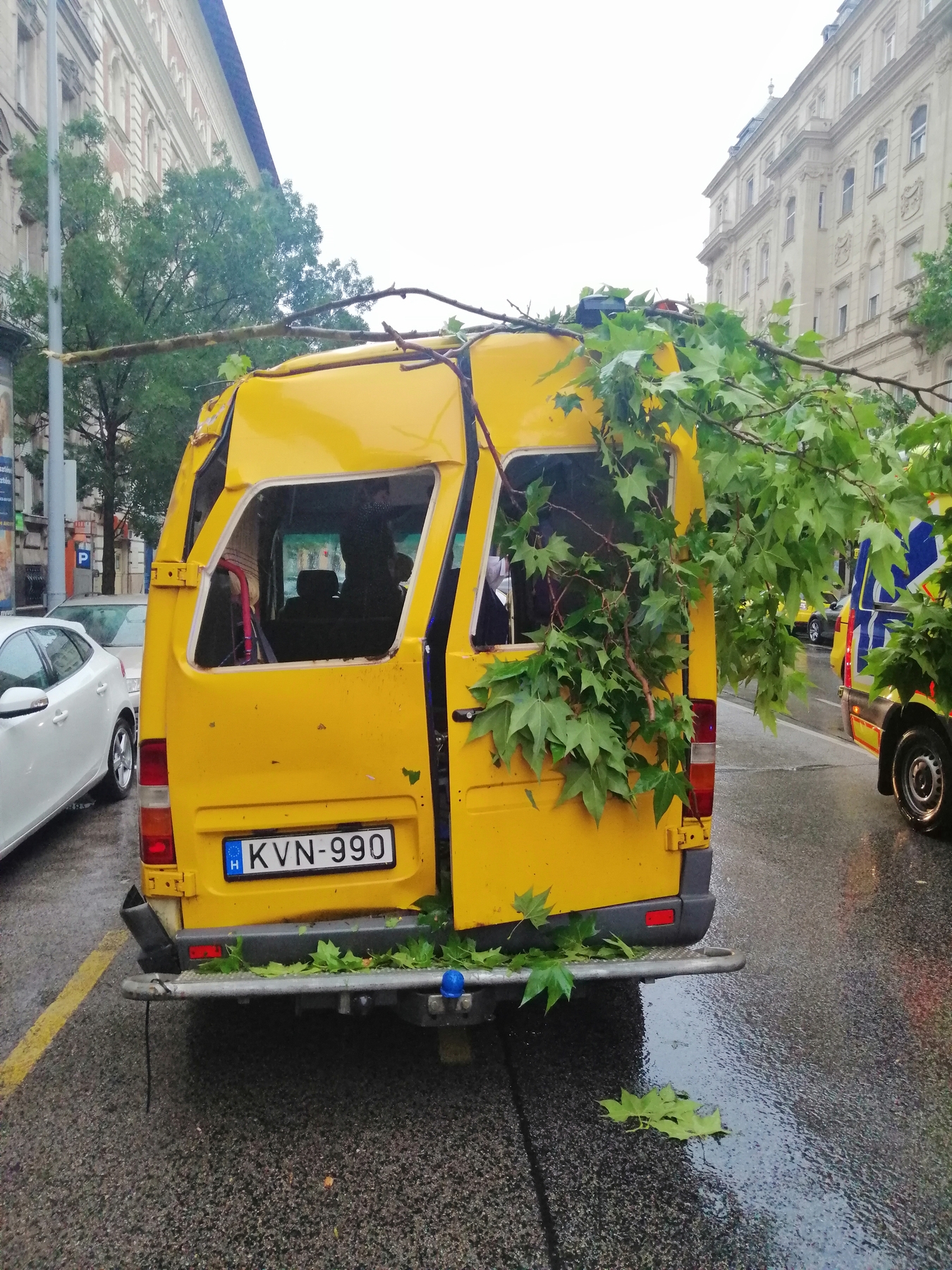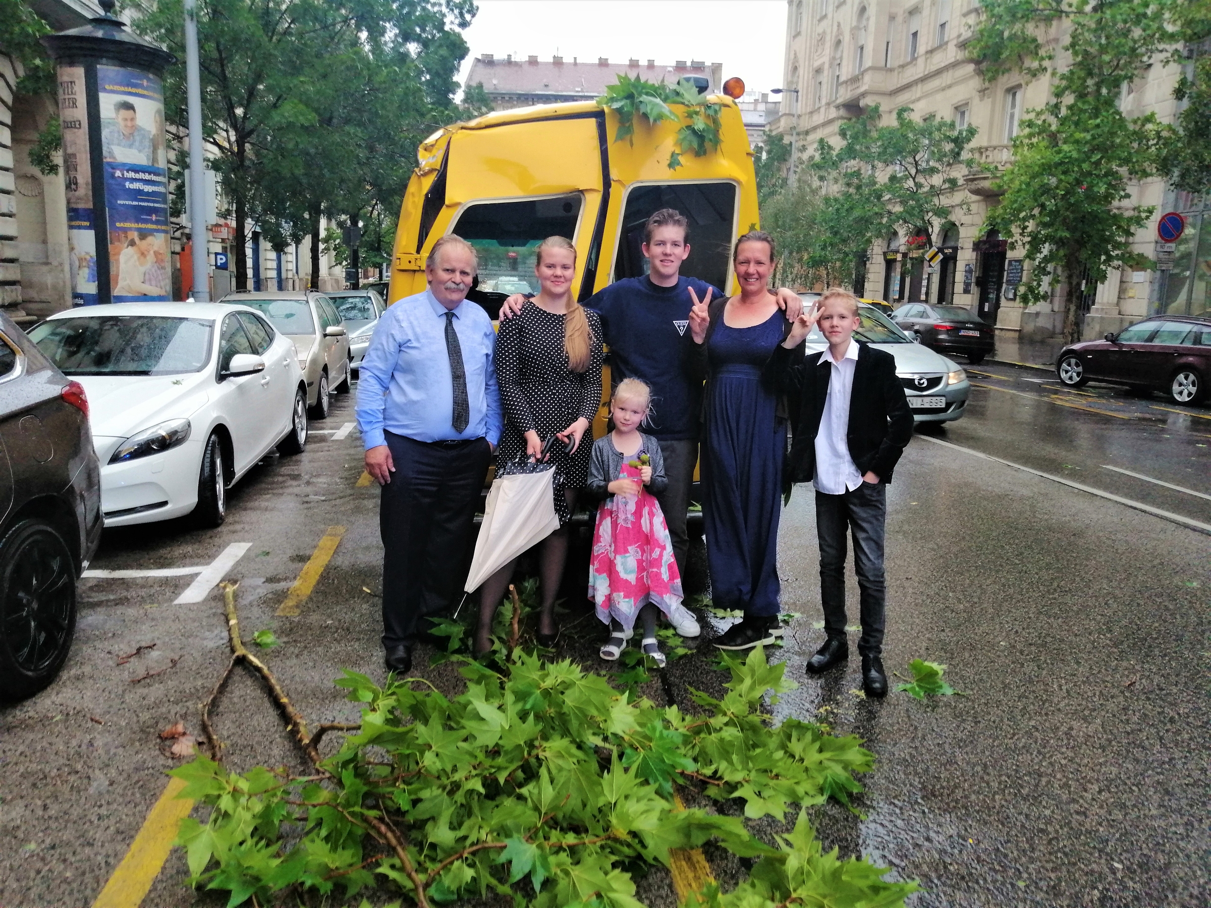 A sárga kisbusz, amelyben utaztak, egy leselejtezett németországi mentőautó volt, amelyet épp a katasztrófahelyzetek miatt erősítettek meg vasszerkezetekkel – tette hozzá. „Éppen költözésben vagyunk, a másik járművünk elromlott, ezért ezt kaptuk kölcsönbe. Ha nem ebben a kisbuszban utaztunk volna, valószínűleg nem éltük volna túl, ami történt. Hatalmas fa volt, az Alkotmány utca egyik járdájától a másikig elért. A mindennapjainkra rá is nyomja a bélyegét, az égdörgéstől például még mindig megijedünk.” A megmenekülésükért Istennek adtak hálát – idézte fel. „Szó szerint megtapasztaltuk annak az Igének az igazságát, amelyet a fiam az aznapi konfirmációján kapott: Ha Isten velünk, ki lehet ellenünk?”