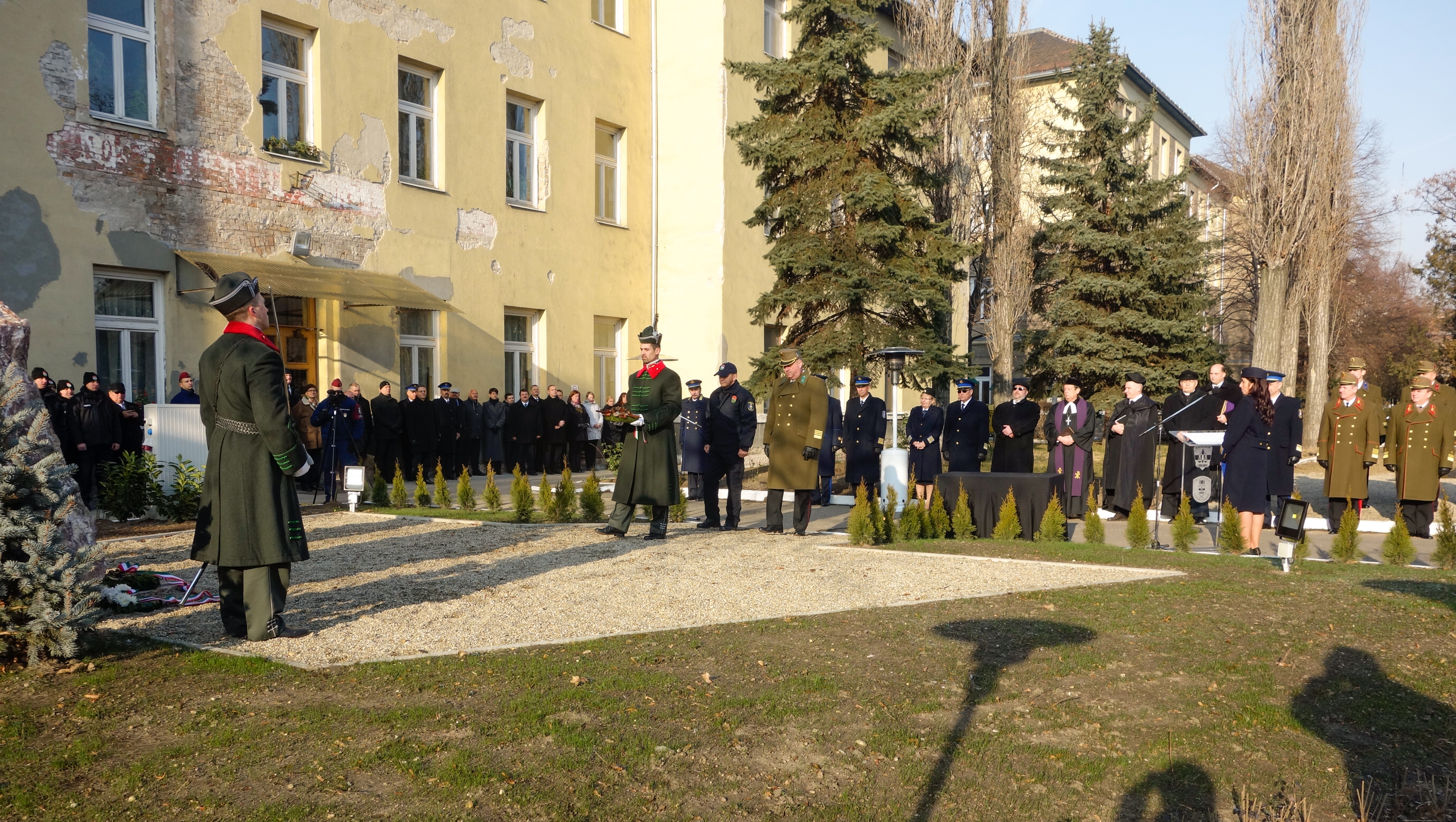 Bogárdi Szabó István református püspök azt mondta: az ország a háborúk és megszállások szörnyű emlékeivel és veszélyeivel van tele még ma is, amikor békében élhetünk. Hálásnak kell lennünk azoknak, akik számunkra nem láthatók a hétköznapokban, de teljesítik kötelességüket. – A régiek officiumnak nevezték a kötelességet, olyan megbízatásnak, amelynek betöltése Isten gondviselő munkáját szolgálja. Fejet hajtunk mindenki előtt, aki békénket és biztonságunkat őrzi, és ezt a tisztet élete feláldozásával tölti be. Hirdesse ez a kő az emléküket, önfeláldozásukat, hősiességüket – tette hozzá az egyházvezető.