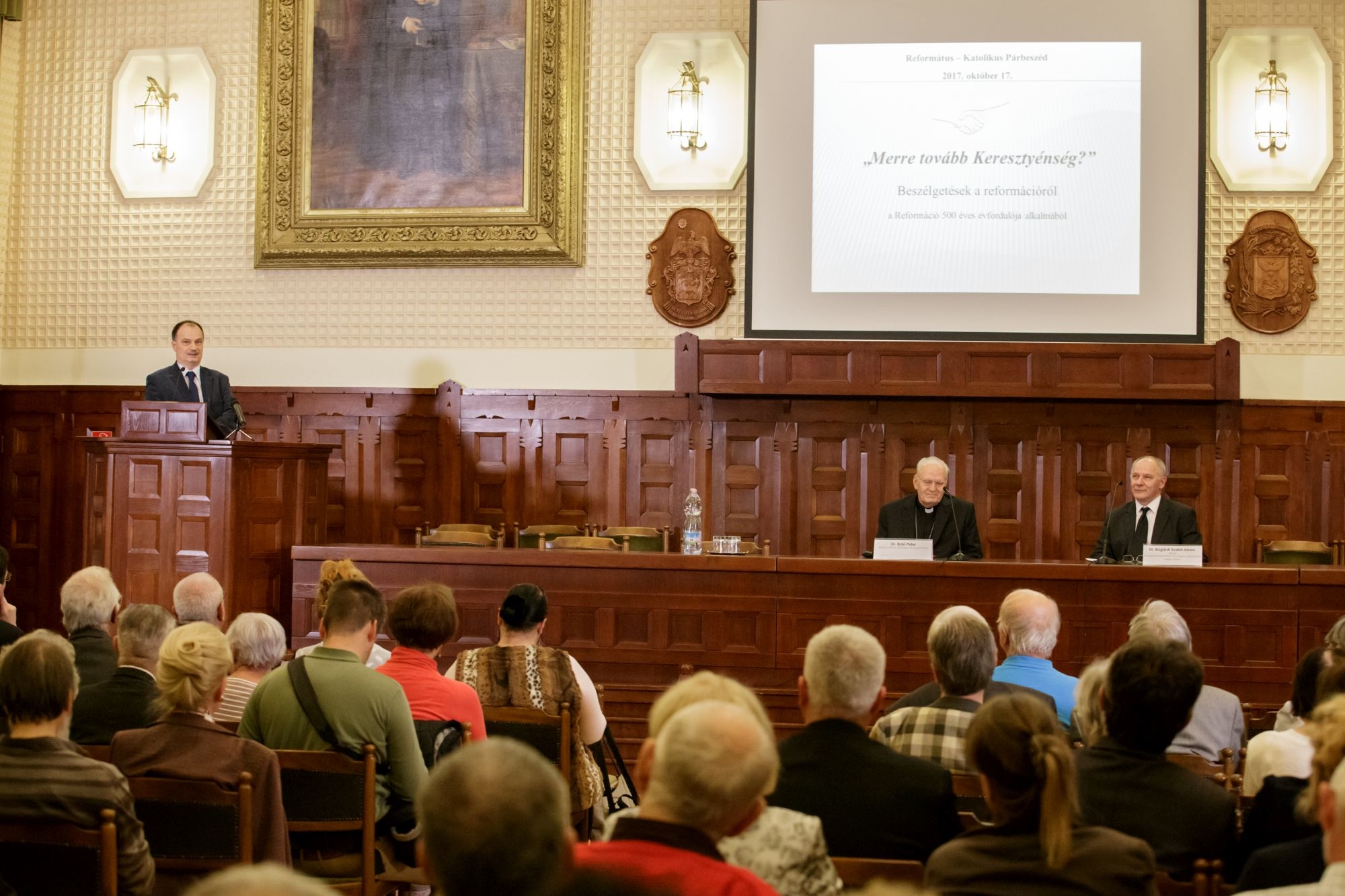 A reformáció kifejtette hatását a katolikus egyházra is, zsinati és egyházmegyei szinten egyaránt reagáltak a változó társadalmi igényekre. Erdő Péter úgy véli, nem feltétlenül kellett volna szakadáshoz vezetnie ennek a folyamatnak, a reformáció emlékévét is tanulságkereső jövőbetekintésnek fogja fel. „A régi elméleti ellentéteket is meg lehet haladni krisztusi szellemben” – zárta előadását a bíboros. Erdő Péter elismerte: katolikusok és protestánsok egyaránt igyekszünk egyre inkább megismerni Jézus tanítását. Ez a törekvés erősítheti kölcsönös kapcsolatainkat – legyen szó teológiai párbeszédről, közös bibliatanulmányozásról vagy közös tanúságtételről a szeretetszolgálatban és a tömegkommunikációban.