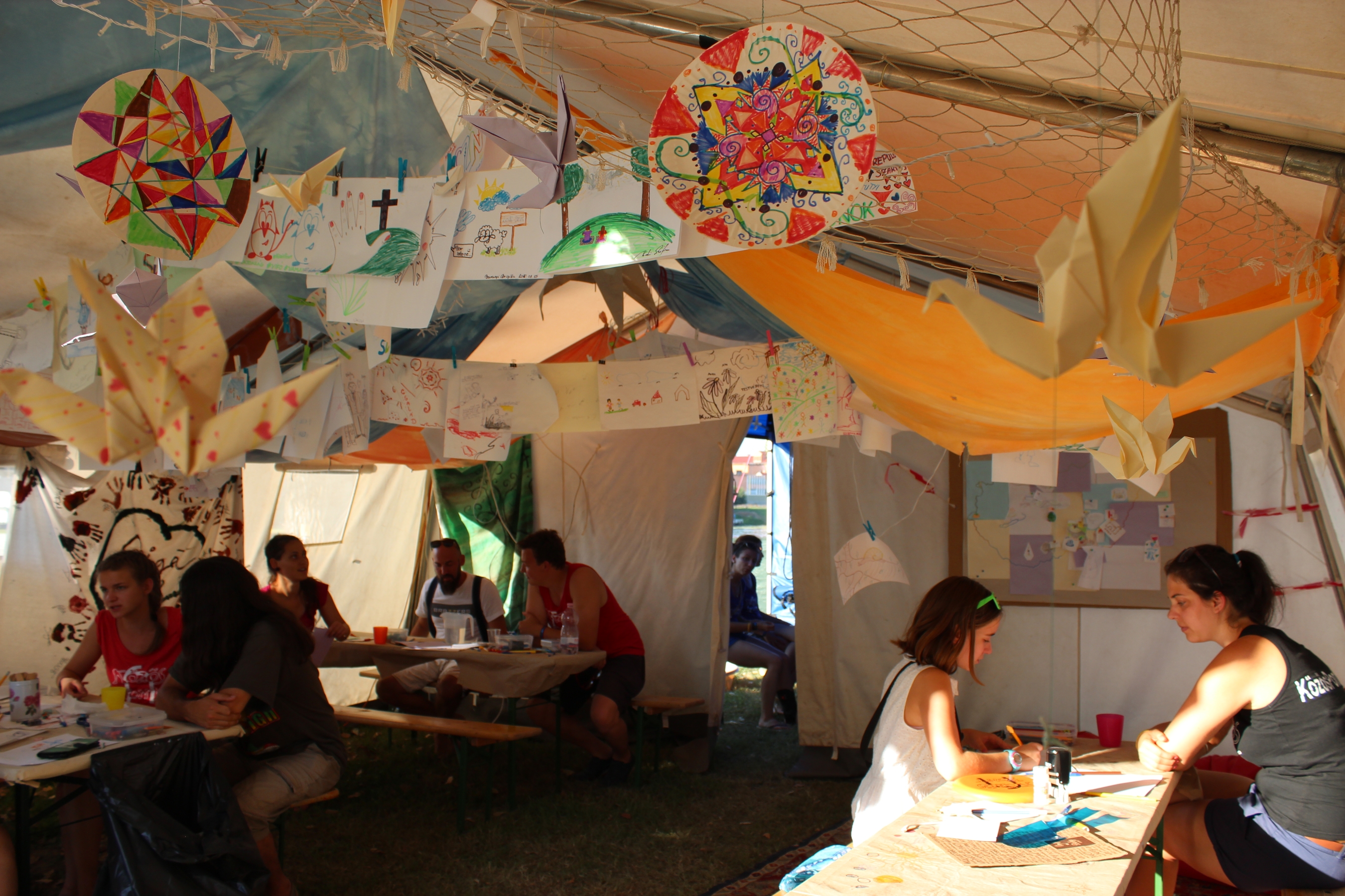 „A fiatalok ritkán érzik azt, hogy figyelnének rájuk, mi pedig ezt adjuk meg: jön valaki, és azt érzi, figyelünk rá, tíz percet, de akár két órát is” – mondja Gábor. A sátor idei SZIN-re összeállított programja a közösség körül forgott, mindennap más aspektusból: közösségben Istennel, a nemzettel, az egyházzal és a barátokkal. Ezekhez különféle feladatokat is kitaláltak, például egy csokiért a betérő fesztiválozó lerajzolhatta a barátait. De volt himnuszszavaló verseny, hitlabirintus, képeslapküldés olyan valakinek, aki nagyon hiányzik. A családdal kapcsolatban arról is beszélgettek a fesztiválozókkal, hogy kinek mi a szerepe, és még arra is motiválták őket, hogy ha a bulizás miatt nem beszéltek az anyukájukkal, akkor hívják fel gyorsan őt. „Ezek olyan feladatok, amelyekkel kicsalogatjuk a csigát a csigaházból” – folyatja Gábor. „De a lényeg, hogy beszélgessünk, és ha lehet, beszélgetünk hitéleti kérdésekről, egyházról is.” Utóbbi azért is fontos, mert sokaknak rossz élményük, véleményük van az egyházakról, de ezeket próbálják átfordítani, megváltoztatni – magyarázza a sátorvezető.