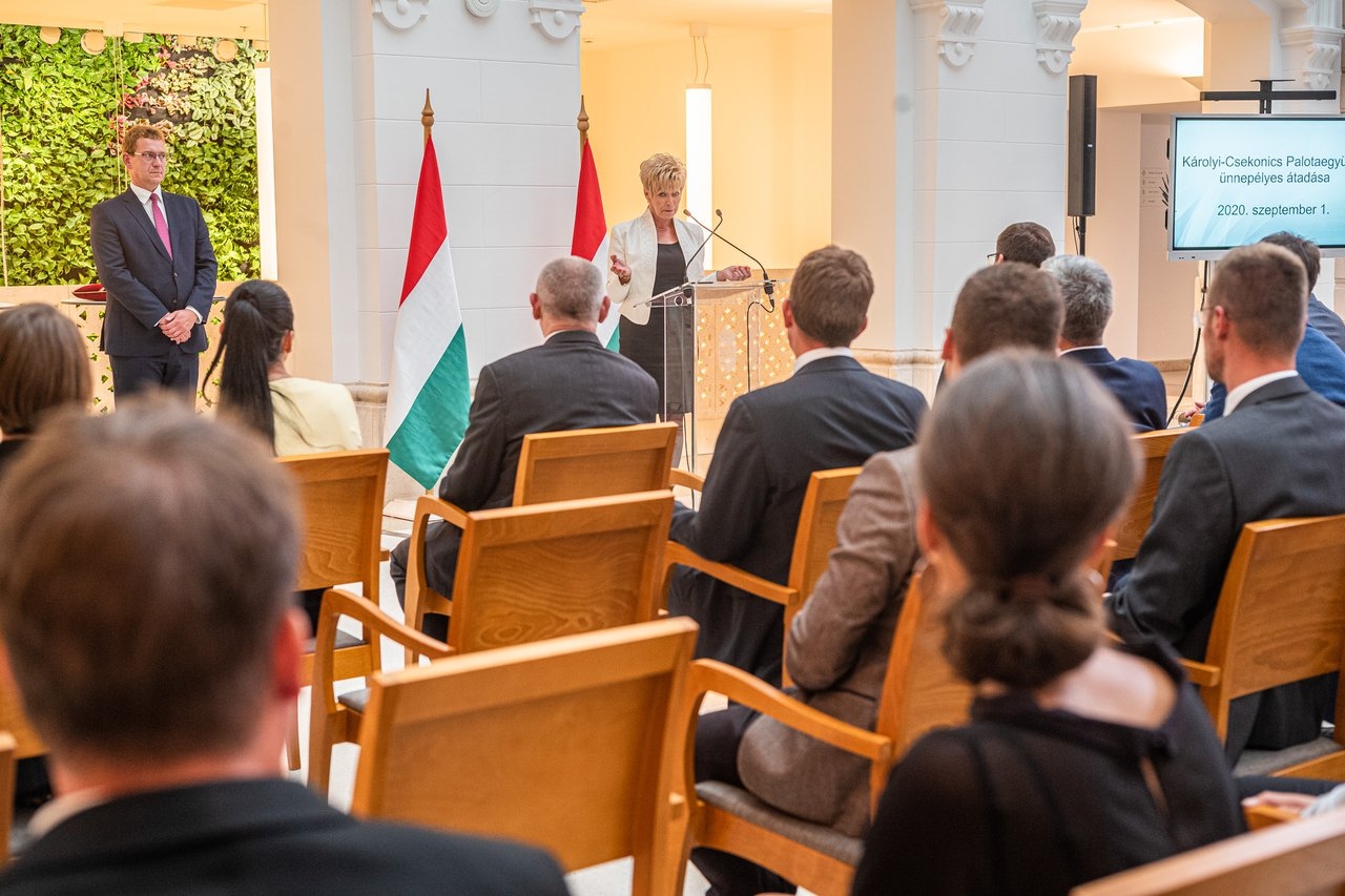 Czine Ágnes, az egyetem rektori feladatokkal megbízott rektorhelyettese kifejtette, a palotaegyüttes kilencszáz hallgatónak biztosítja a 21. századi oktatást. Az épület nemcsak a neorokokó stílus őrzője, hanem a modern belsőépítészetnek is teret ad, erre példa a több emeletnyi magasságban és mélységben végigfutó zöldfal. A felújított palotaegyüttes így a régi és modern értékeket ötvözi egymással.