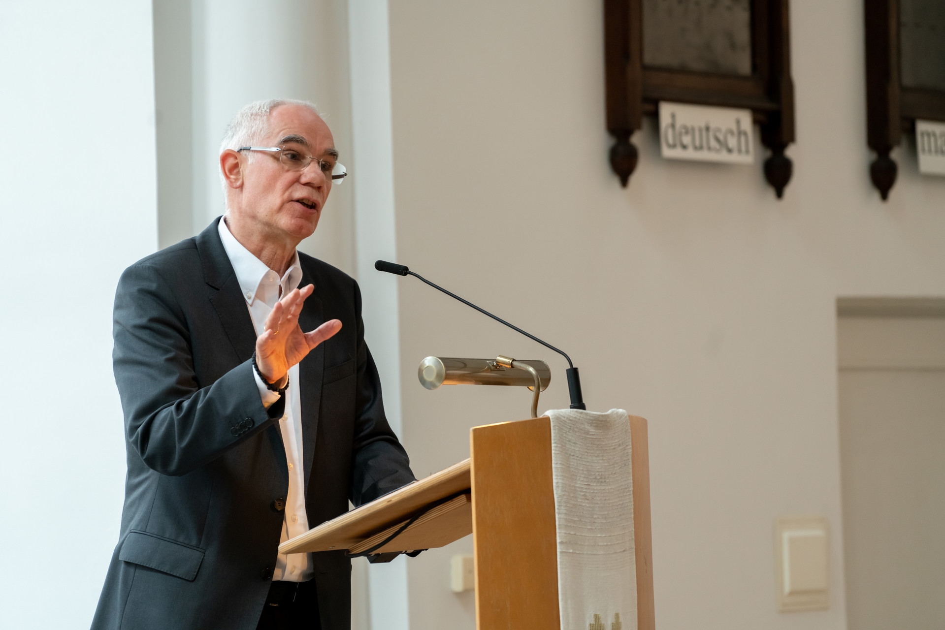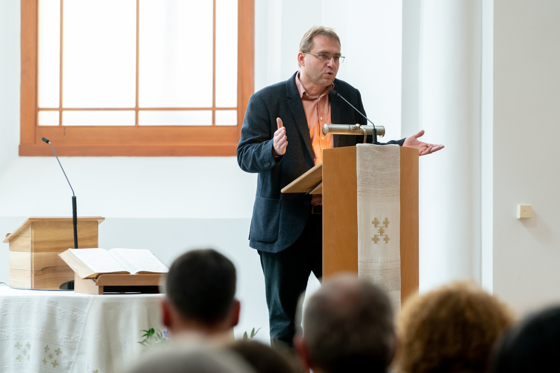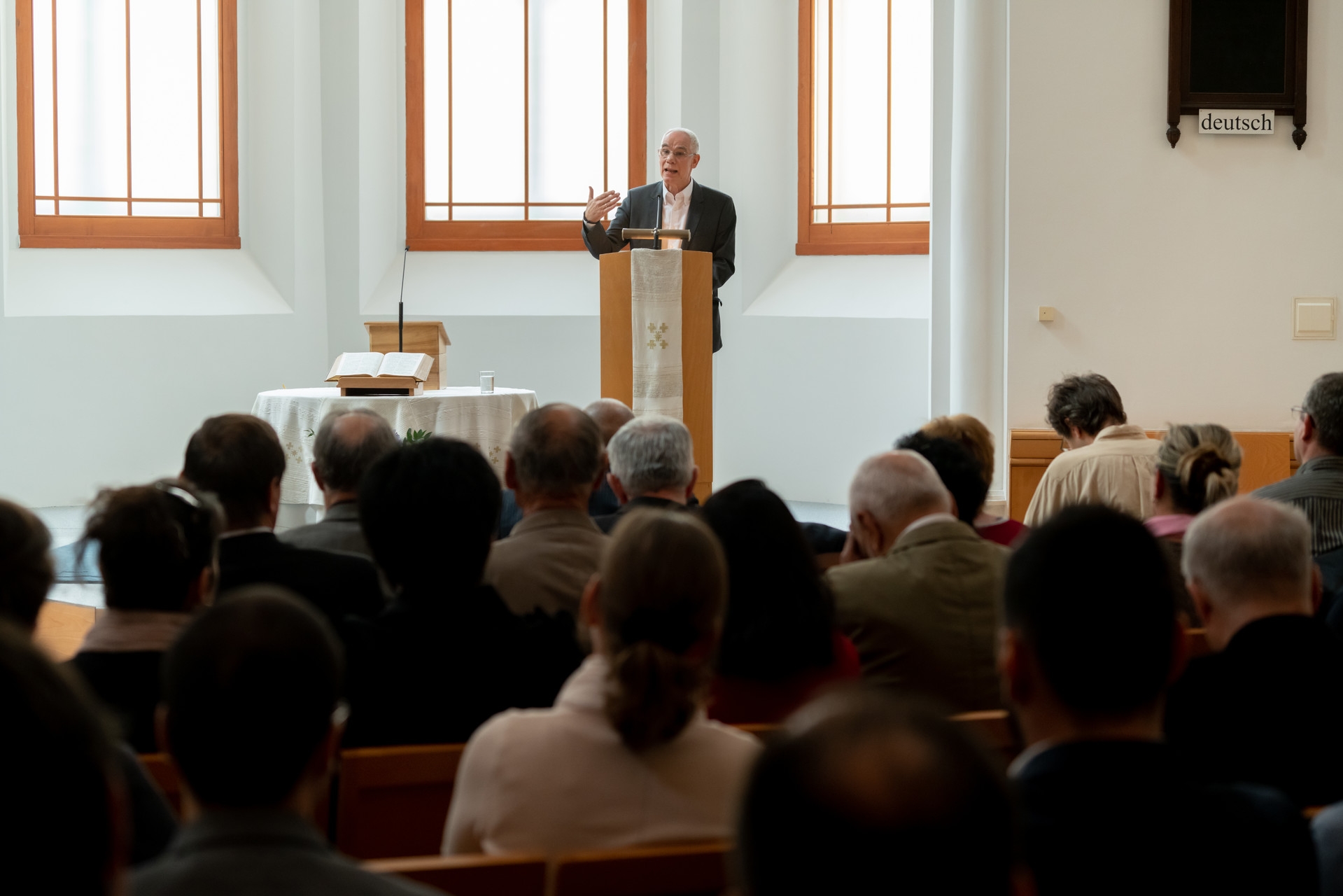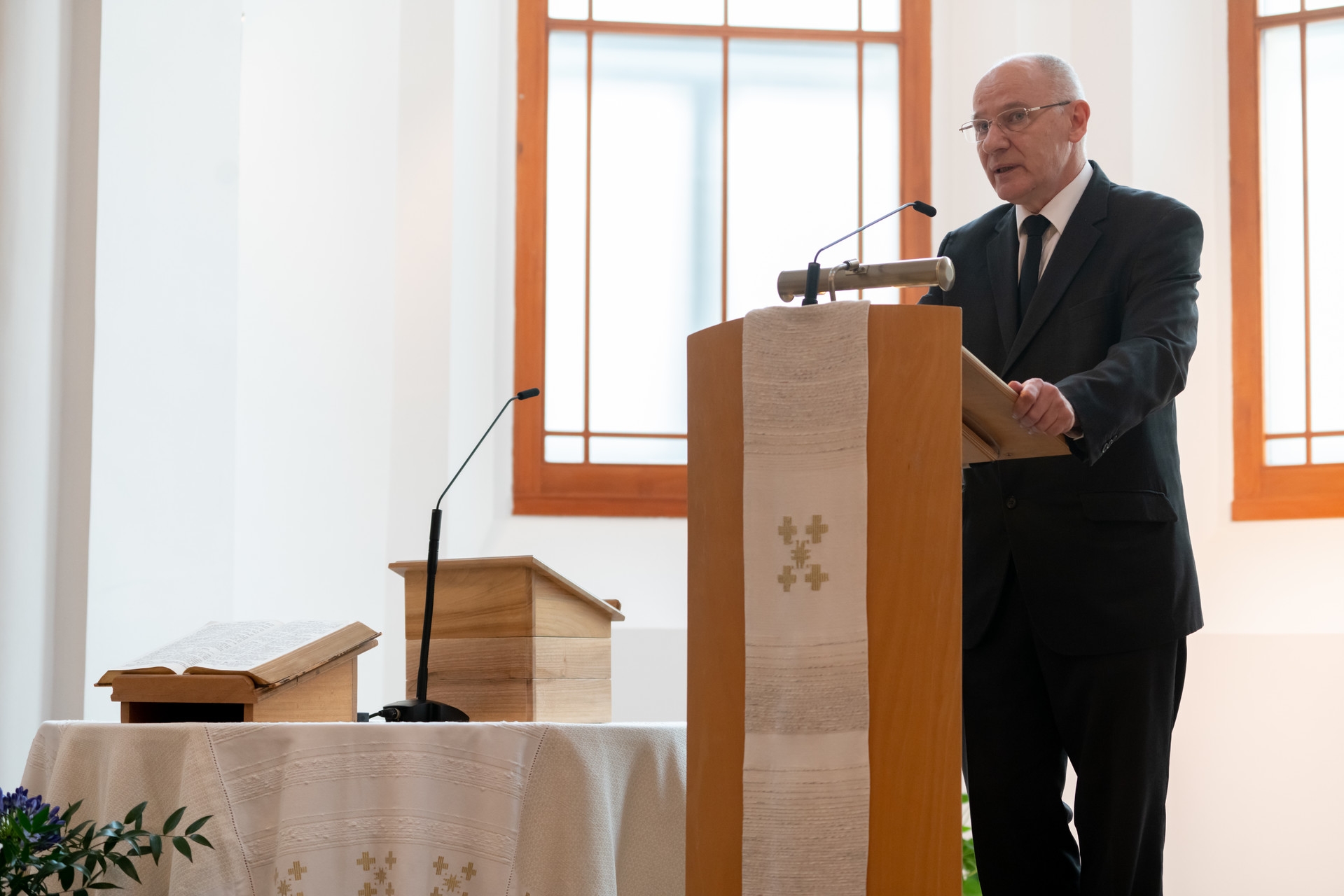 „Nem csak az időbeliség szempontjából kell nagypéntekről, a feltámadásról és pünkösdről beszélnünk” – mondta a németajkú gyülekezet lelkipásztora. „A három ünnepnap folyamatos jelenlét az életünkben, a hozzájuk köthető üzenetek meghatározzák a mindennapjainkat. Nagypéntekből fakad például a legyőzöttek, a vesztesek iránti figyelem; valamint a szociális és mentális felelősségünk.” Vályi Nagy Ervin gondolatait idézve kifejtette: nekünk az örökkévalóság mércéjével kell szemlélnünk a világot, nem elmerülve benne. „Jézus is a part mentén, a hajóról tanította a parton figyelő tömeget: a hangja még tisztán érthető volt, de nem szippantotta magába a tömeg. Ez legyen számunkra a tanítás helye” – jelentette ki.