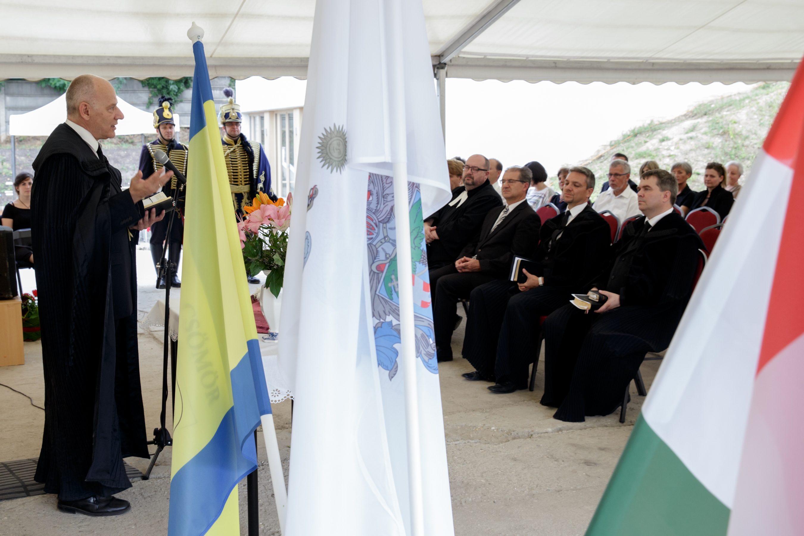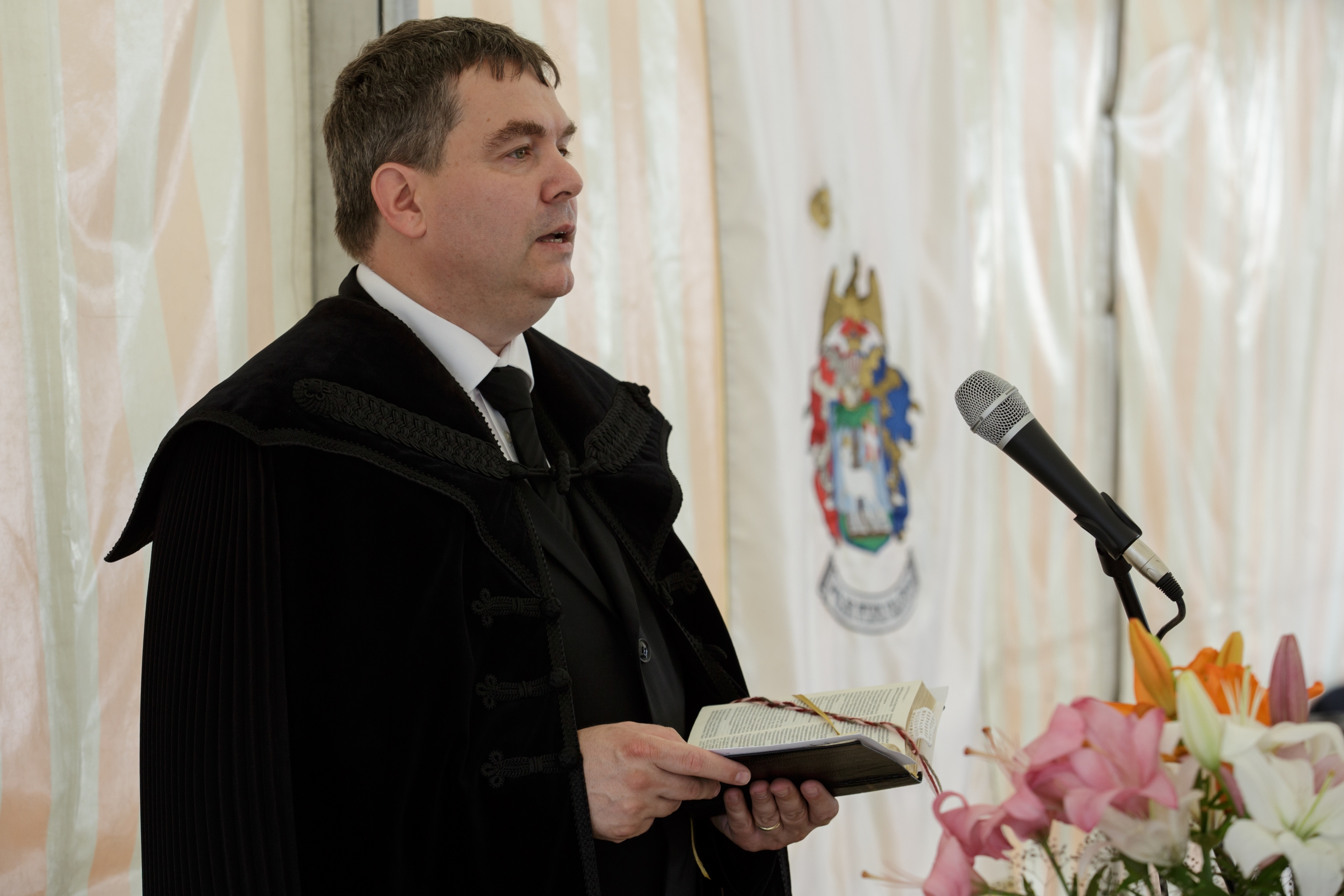 Ezen a területen, ahol most állunk, még látni a régi világ egy-egy darabját – utalt a még látható építési betondarabokra. „Amikor legközelebb eljövünk, már a templom felszentelésére, itt minden ki lesz cserélve. Azt kívánom, hogy mi magunk is, akik mindennek megélői, támogatói és érette imádkozói vagyunk, kicserélődjünk: reménység ellen remélőkké. Magunk útján járók helyett Isten útjára meghívottakká. Keresztelő János, amikor látja Jézust, Isten bárányát, ezt mondja: nékem alább kell szállanom, néki feljebb kell emeltetnie! A parókiánál, a gyülekezeti háznál nemcsak léptékében, hanem jelentőségében is nagyobb fog itt épülni, de a templomnál is nagyobb van jelen: maga az üdvözítő Úr Jézus Krisztus, akinek kegyelmére, szeretetére és dicsőítésére elhívott minket az Isten” – zárta szavait a református püspök.
