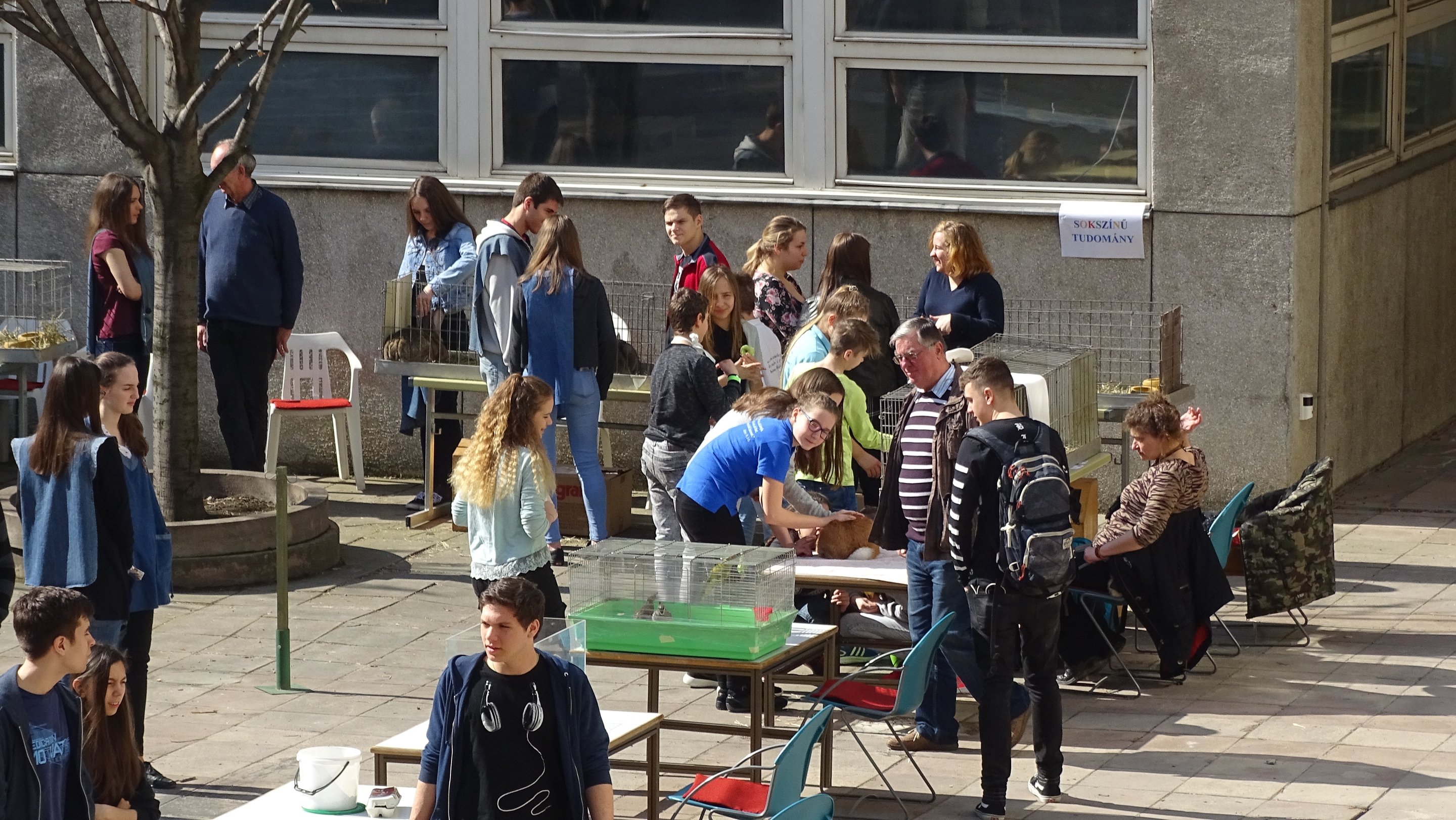Az előkészített asztaloknál diákjaink megismerkedhettek négy magyar óriásnyúllal, amelyek egyenként közel nyolc kilogrammot nyomtak. Nagy méretük ellenére nagyon békésen tűrték a diákok simogatását egész délelőtt. De a törpenyúl és lógófülű óriás nyúl is nagy rajongótábort gyűjtött magának a délelőtt folyamán. A ketrecekben sokféle galambot is meg lehetett tekinteni, valamint két védett szárazföldi (görög) teknős is bemutatkozott.