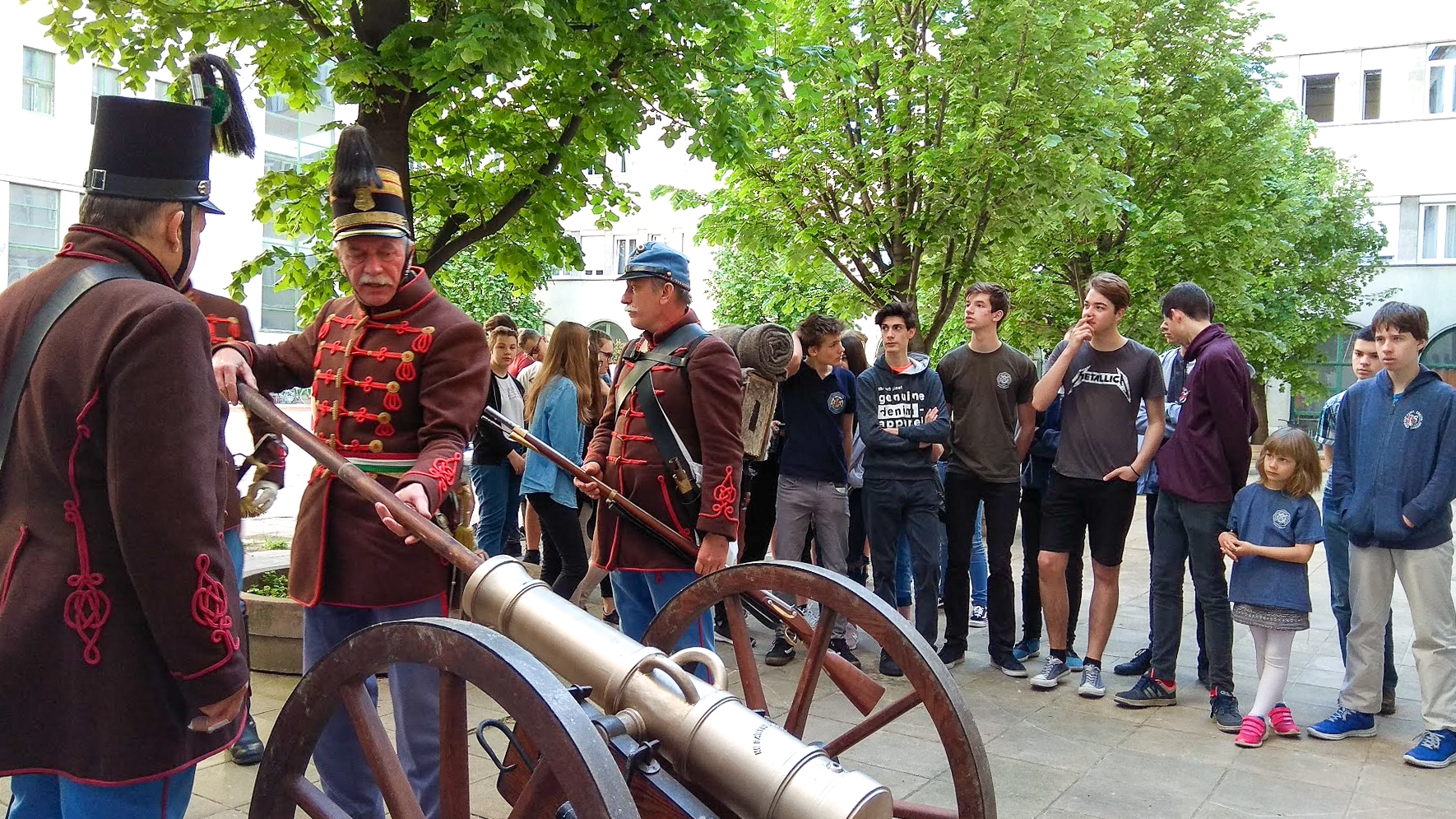Ennek nyomán, éppen a gimnázium udvarán állomásozó BKHE 2-ik Budai Honvédzászlóalj, Berlinger Gábor hagyományőrző százados, zászlóaljparancsnok utasítására, kidoboltatta a felhívást, hogy veszélyben a haza, most kell katonának beállni! A diákok szorgalmasan jelentkeznek is a feladatra, besorozzák az alkalmas fiatalokat és felkészítik a honvédzászlóaljba jelentkezőket. A háttérből felhangzanak a közismert Kossuth-nóták, amelyeket a Magyar Honvédség Budapest Helyőrség Zenekara, Baczkó István őrnagy karmester vezényletével prezentált magas színvonalon, megjelenítve a hivatásos, napjainkban is a Haza védelmét ellátó magyar katonát.