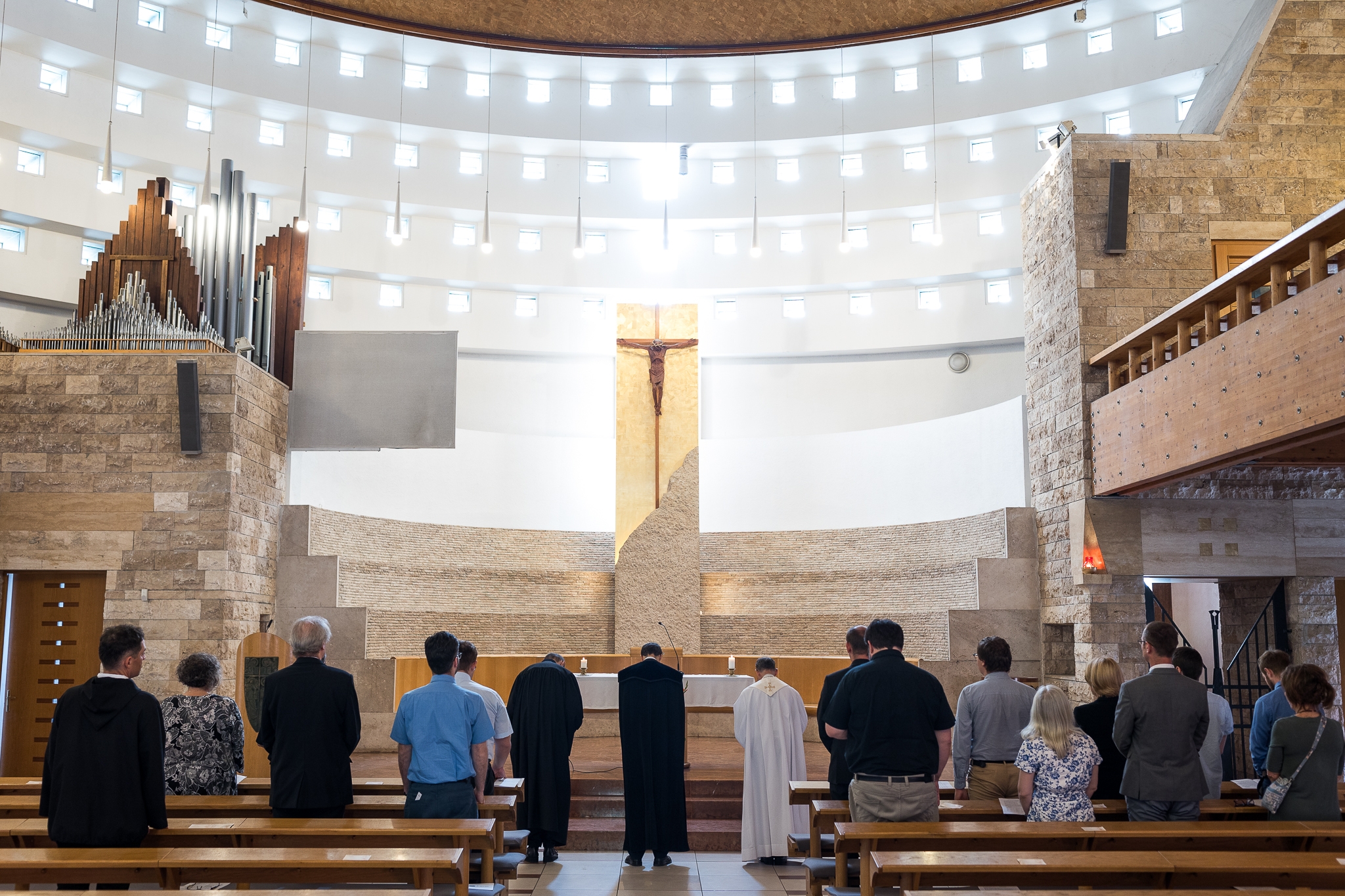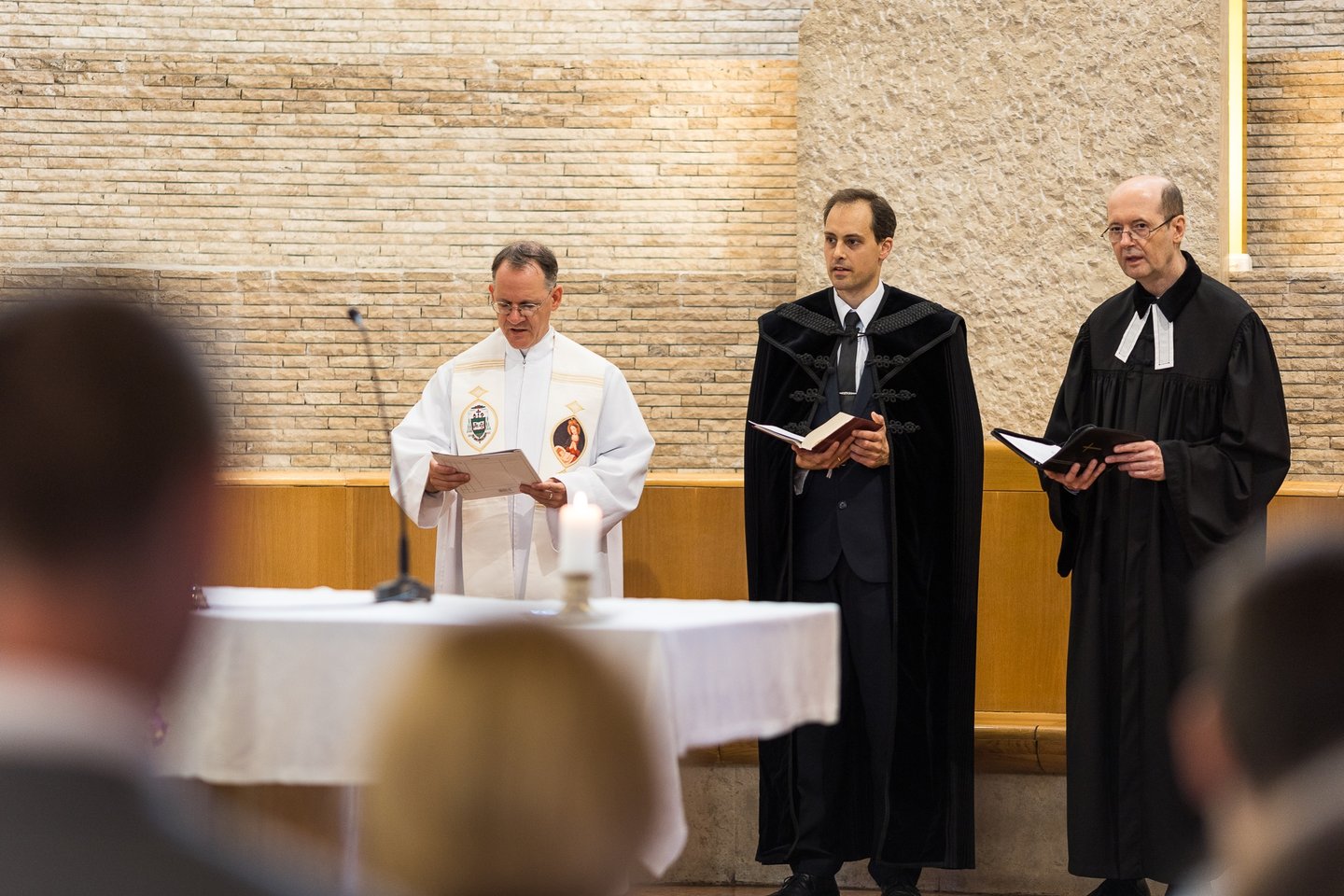 A következő nap reggelén a három felekezet egyetemi lelkészének szolgálatával tartott ökumenikus áhítaton lehettek közösségben a püspöki hivatalok munkatársai a Magyar Szentek Templomában. Héray András római katolikus egyetemi lelkész Mt 13,36-43 alapján hangsúlyozta, hogy Krisztus barátaiként kell, hogy fülünk legyen a hallásra, hogy átragyoghassuk a keresztség kegyelmét. Dr. Csermely Péter evangélikus egyetemi lelkész 2Móz 33-34 válogatott versei alapján arról beszélt, hogy bár az Istennel való találkozás élményéből nehéz visszatérni a hétköznapokba a mediátor szerepében hirdetni kell az kegyelmet, amit Isten azokért ad, akikért szolgáit szolgálatra hívta. Németh Balázs református egyetemi lelkész Róm 8,1-4 alapján azzal bíztatta a jelenlévőket, hogy a Krisztus feltámadása és bennünk végzett munkája nyomán az élet törvénye felülírja a halál örök törvényszerűségét is.