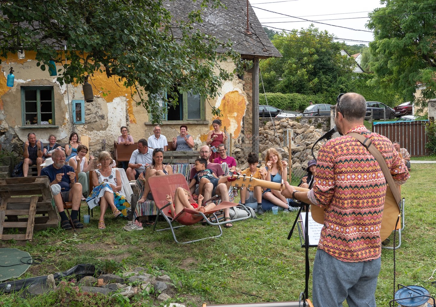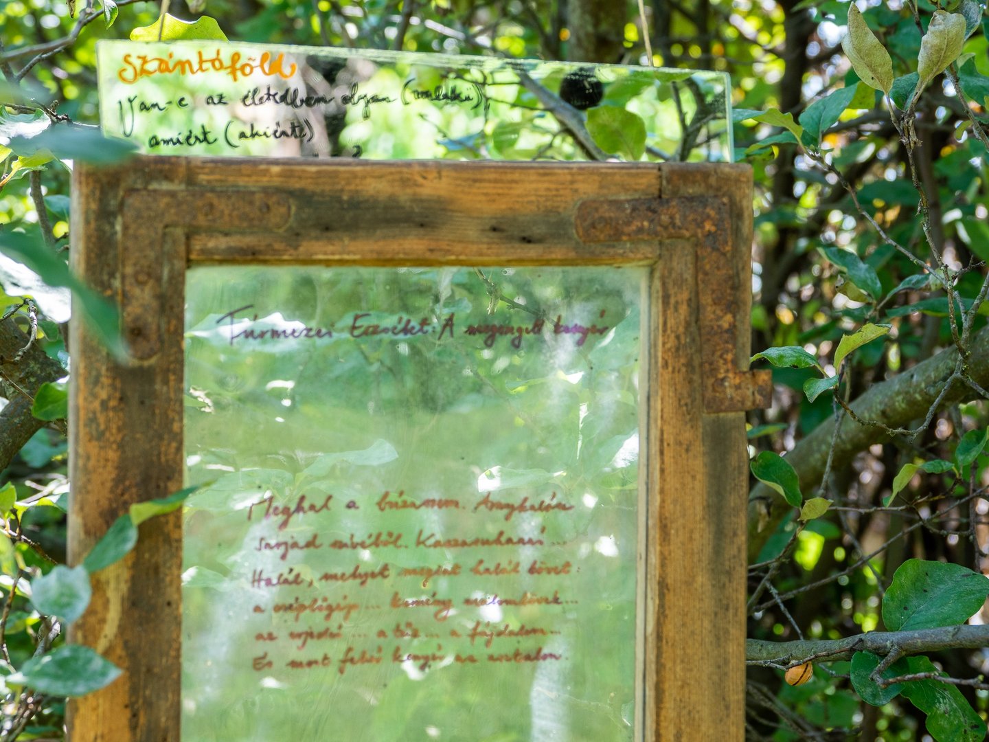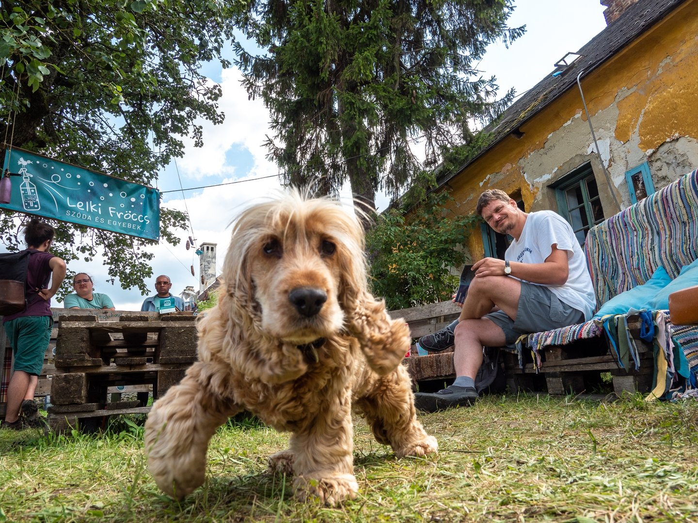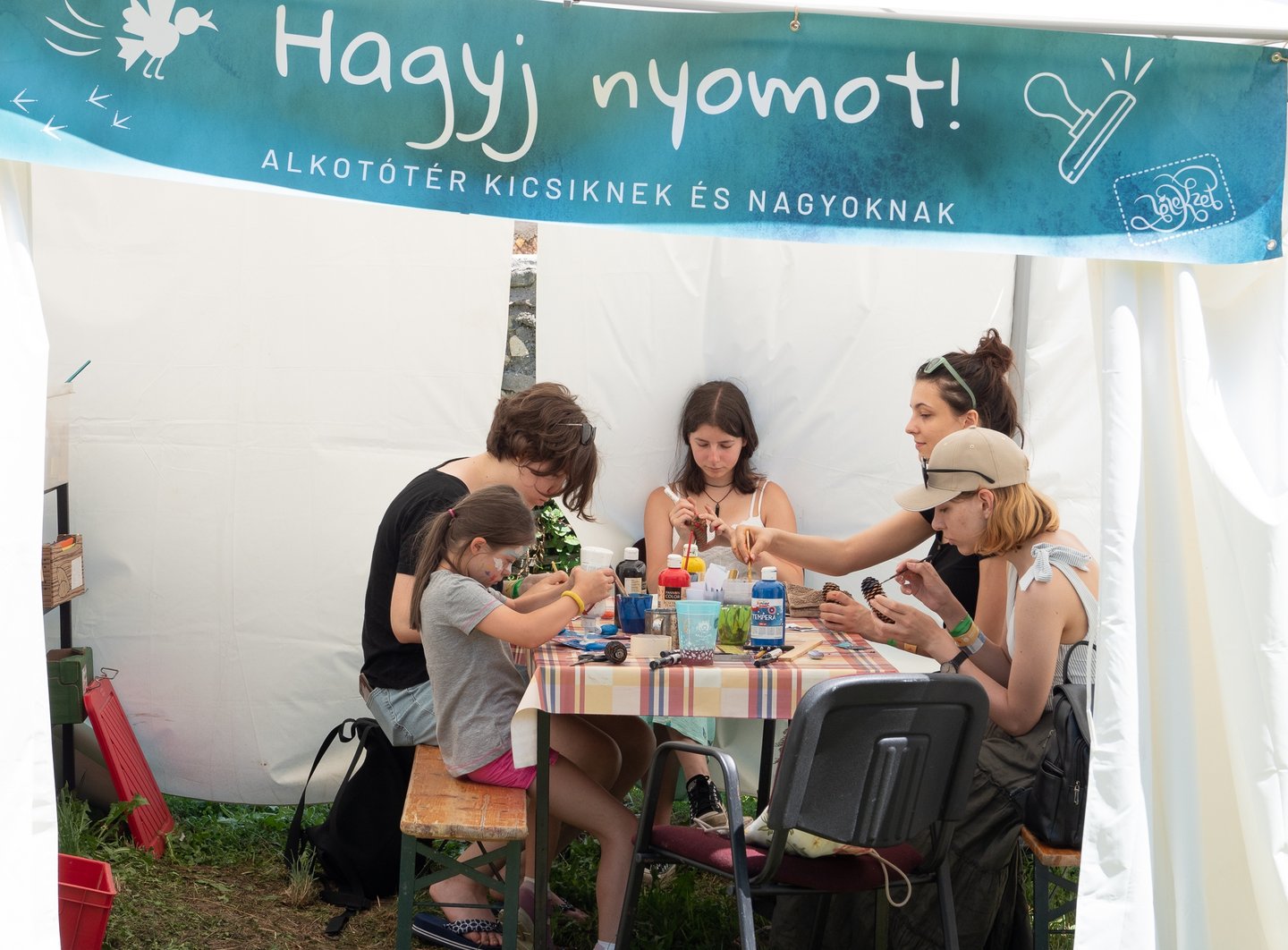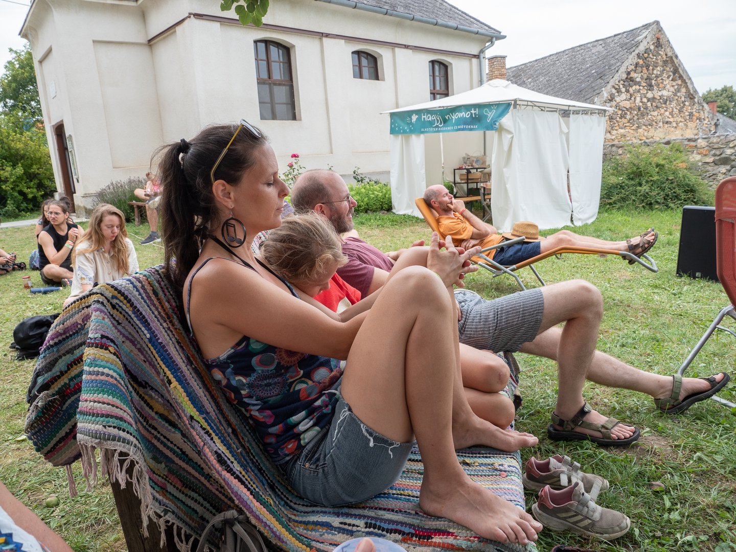 Az udvaron verses imaösvény vezet végig. Te hol vagy otthon leginkább? – Olvasom az első állomás tükörlapján. A gyerekek kavicsot vagy tobozt festenek, míg a felnőttek a kereveten pihennek egy pohár frissítő szódával a kezükben.