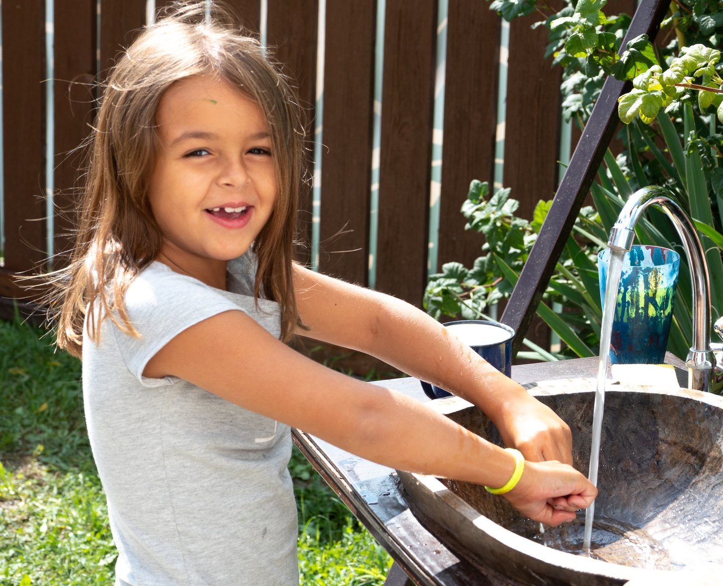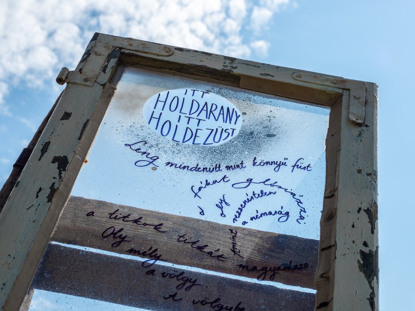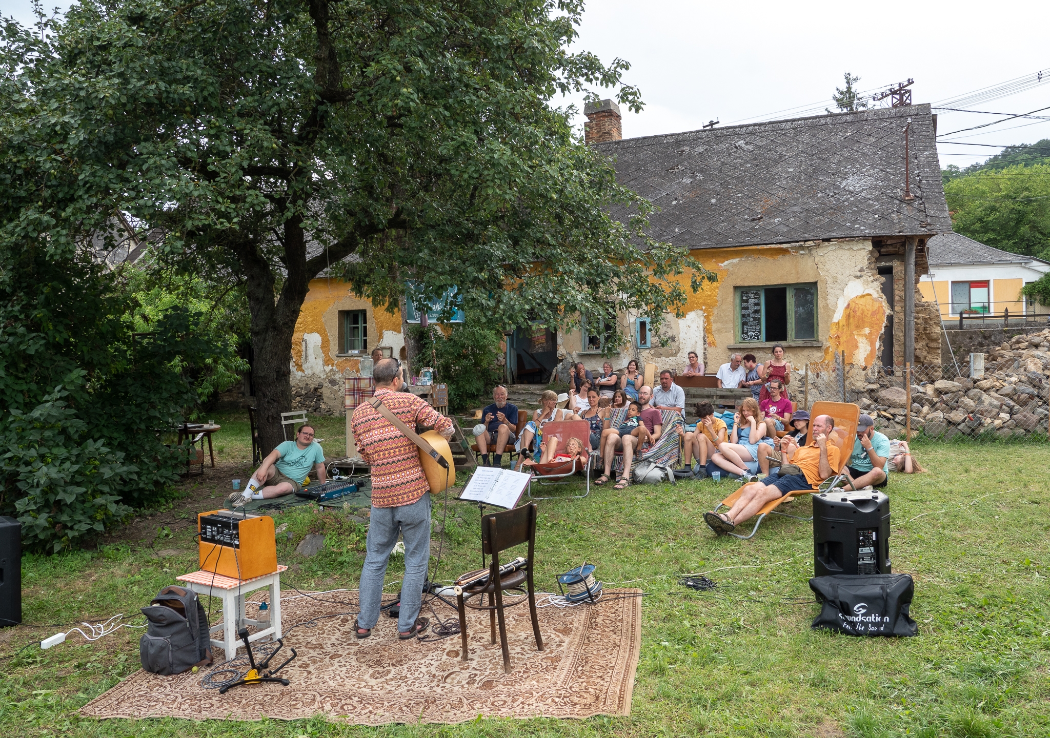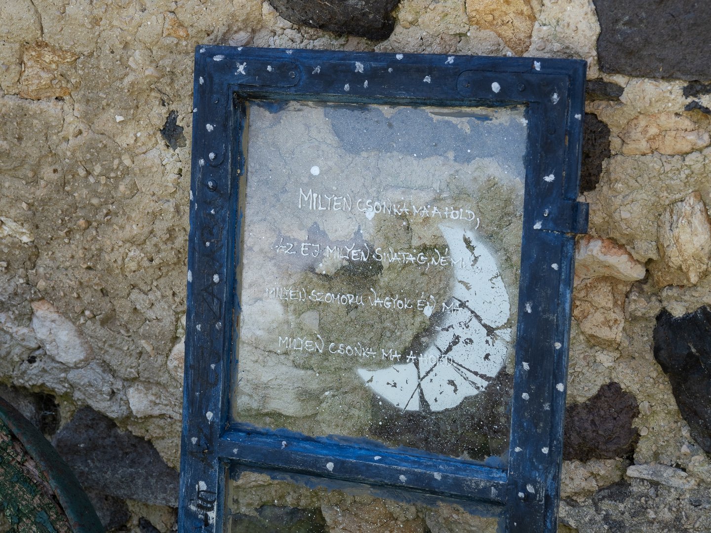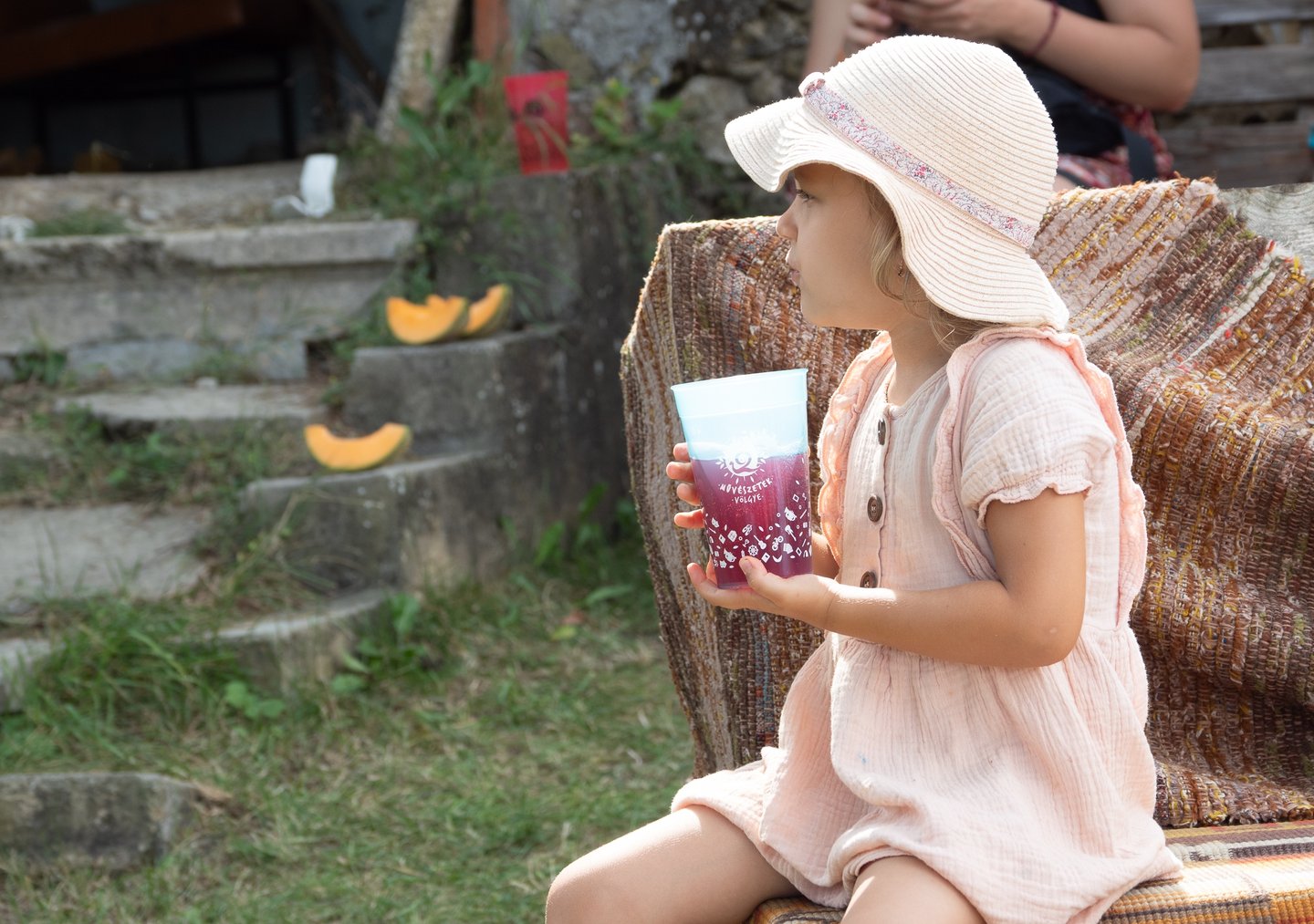 Az udvaron verses imaösvény vezet végig. Te hol vagy otthon leginkább? – Olvasom az első állomás tükörlapján. A gyerekek kavicsot vagy tobozt festenek, míg a felnőttek a kereveten pihennek egy pohár frissítő szódával a kezükben.