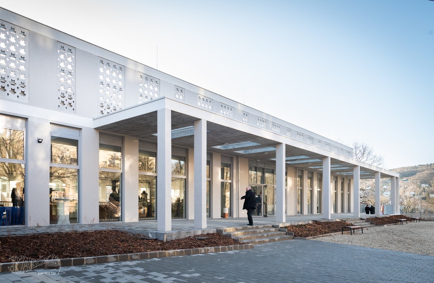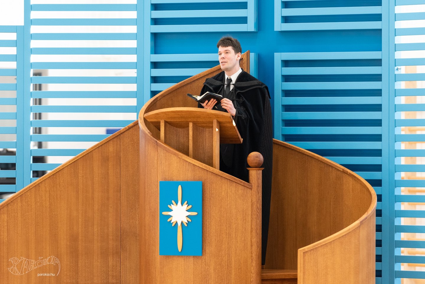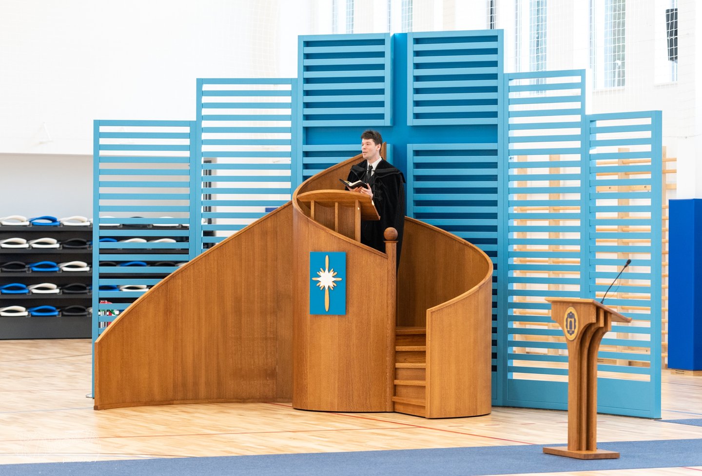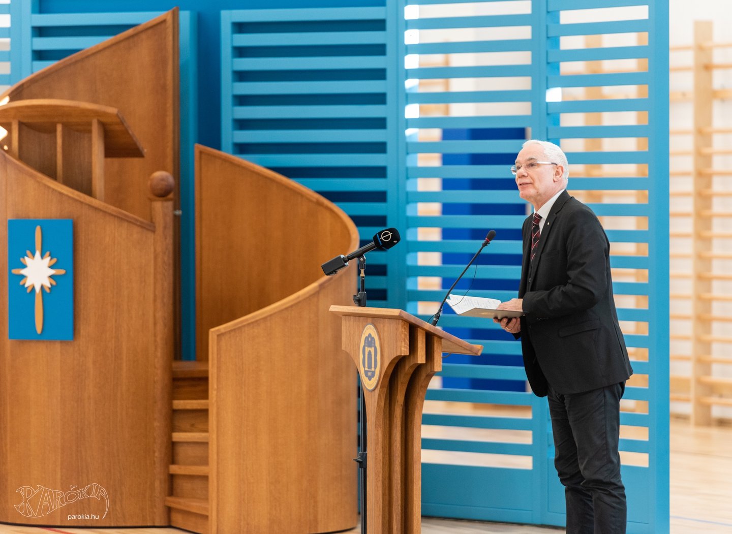 A püspök kifejtette: a kereszt szárnyai a Krisztusban kiteljesedő életünkre utalnak, melyekbe egyaránt belefér az örömünk és a bánatunk is. A függőleges dimenzió pedig a földben gyökerezik, ahonnan jövünk, és Isten felé mutat, ahonnan az erőt kapjuk az élethez. „Örülök, hogy ez a tornacsarnok egyszerre lesz a test és a lélek otthona, és hogy gyakran látni fogjátok egyházunk szimbólumát, a keresztet a csillagon. Kívánom, hogy ha rátekintetek, mindig az életnek arra a gazdagságára gondoljatok, amely Isten ajándéka!”