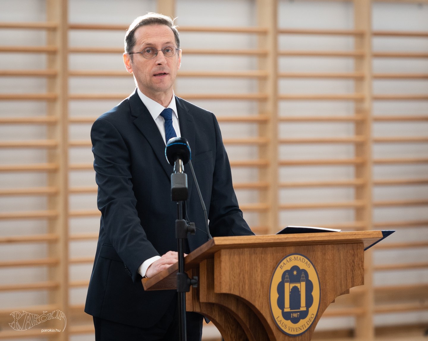 Magyarország Kormánya részéről Varga Mihály köszöntette az ünnepségen résztvevőket. A pénzügyminiszter elmondta: a tornacsarnok megépítése 2,8 milliárd forintos állami támogatásból valósult meg. „Nemrég az iskola még egy olyan család volt, amely kinőtte az otthonát, és az ünnepek alkalmával csak a rokonoknál tudott vendégeket fogadni. A mai napon felkerült a pont az i-re, haza lehet költöztetni az ünnepeket, és a hétköznapok is jóval kényelmesebbek lesznek” – mondta. Hozzátette: a Baár–Madas hazánk legjobb református oktatási intézménye – országos összesítésben a 26. a középiskolák között –, ezért ideje volt, hogy az itt folyó magas szintű szellemi tevékenységekhez méltó tornacsarnok álljon a diákok és pedagógusaik rendelkezésére.