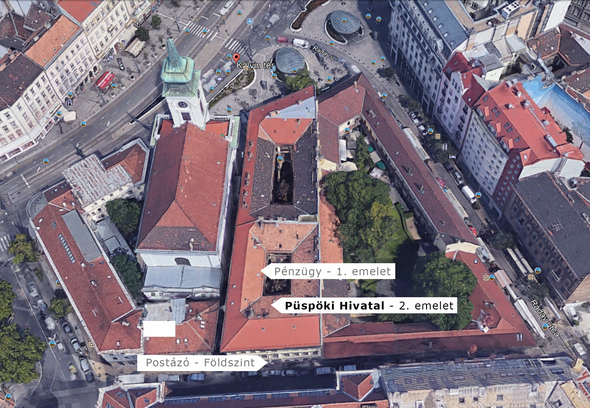 Az az épületegyüttes, ahová a hivatal is költözött, a Kálvin tér, a Lónyay utca és a Ráday utca között található. A Lónyay utcáig tartó Kálvin tér 7. a Kálvin Téri Református Egyházközség tulajdona, itt van az egyházközség hivatala, a szolgálati lakások, illetve maga a templom a kapcsolódó termeivel. A Kálvin tér 8. és 9. számú épülettömbök hátsó oldala a Török Pál utcára néz. A Kálvin tér 8.-nak két udvara van, a kettes udvar a Török Pál utca 4. felől közelíthető meg, ide költözött a Püspöki Hivatal: a földszintre a postázó, az első emeletre a pénzügy, a második emeletre a püspöki, főgondnoki és főjegyzői irodák. A Kálvin térhez közelebb eső udvar első emeletére a Parókia portál szerkesztősége, a Török Pál utca 6. alatti Adna Kávézó egykori helyiségeibe pedig az egyházkerületi támogató csoport került.