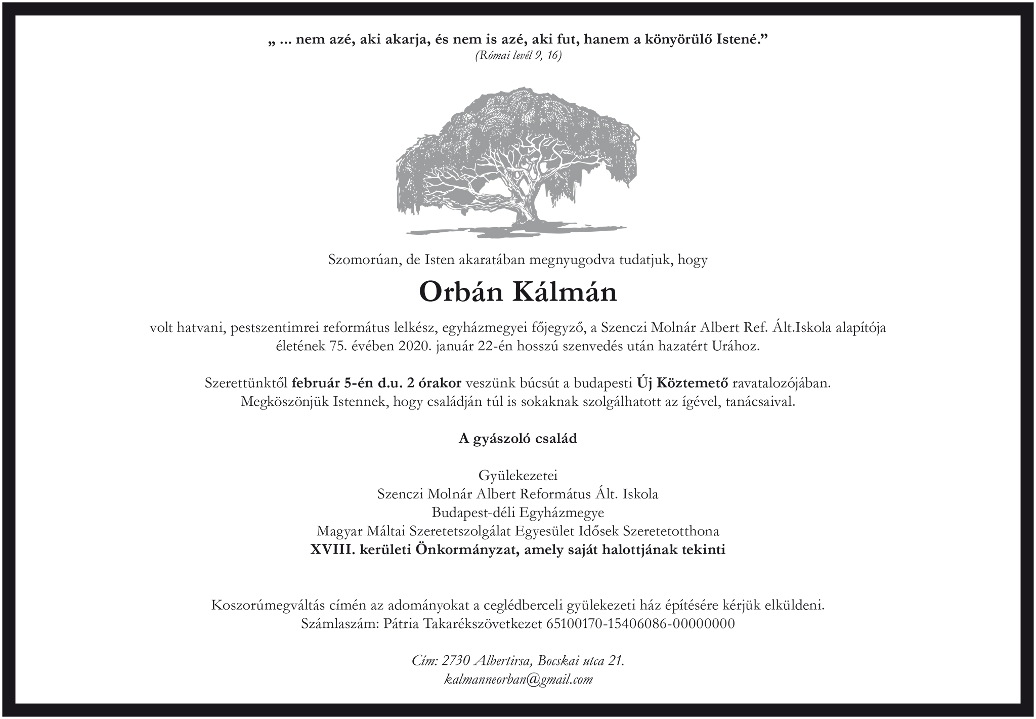 Egykori hatvani, pestszentimrei református lelkész, egyházmegyei főjegyző, a Szenczi Molnár Albert Ref. Ált.Iskola alapítója, életének 75. évében 2020. január 22-én hosszú szenvedés után hazatért Urához.