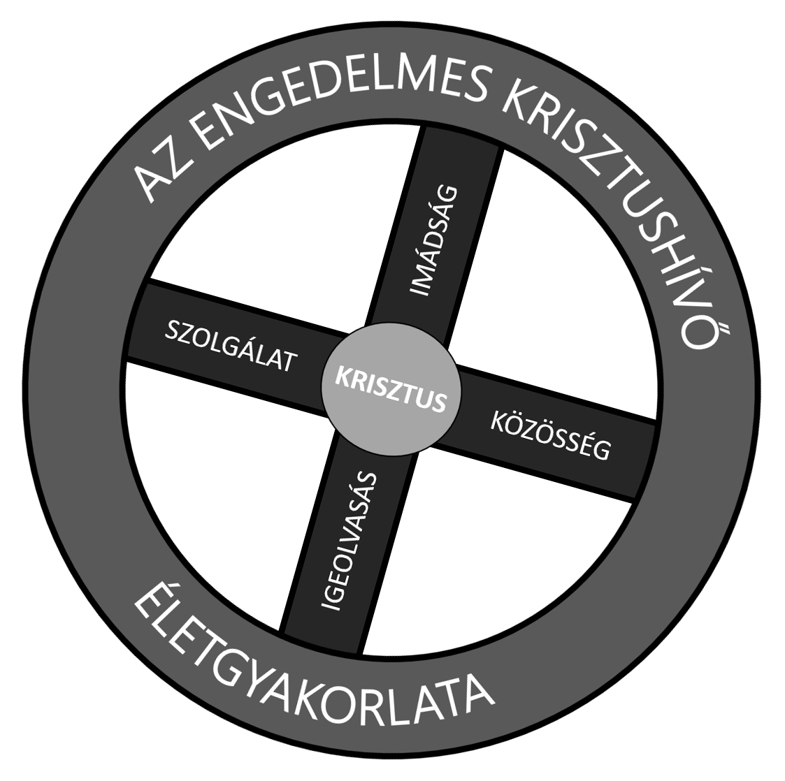 Közösen kezdjük a „működőképes keresztyénség kerekével” a délelőttöt: igeolvasás, imádság, közösség, szolgálat. Rajzolom az utakat, melyek minden keresztyén útjai. S az utak kereszteződnek, s összeköttetésbe kerülnek a középponttal, s már egy kerék küllői. A kerékagy maga Krisztus. S hogy „ne legyen szúrós, sem döcögős” a négy küllőn forgó kerék kap egy „abroncsot”, mely az ENGEDELMES ÉLETVITEL. S máris négy csoport tárgyalja – ki-ki maga választása szerint – neki hol is vannak elakadásai, s hol lát lehetőségeket. Az összegzés máris mindenkit megmozgat, szinte érezzük, hogy bemozdult a kerék…