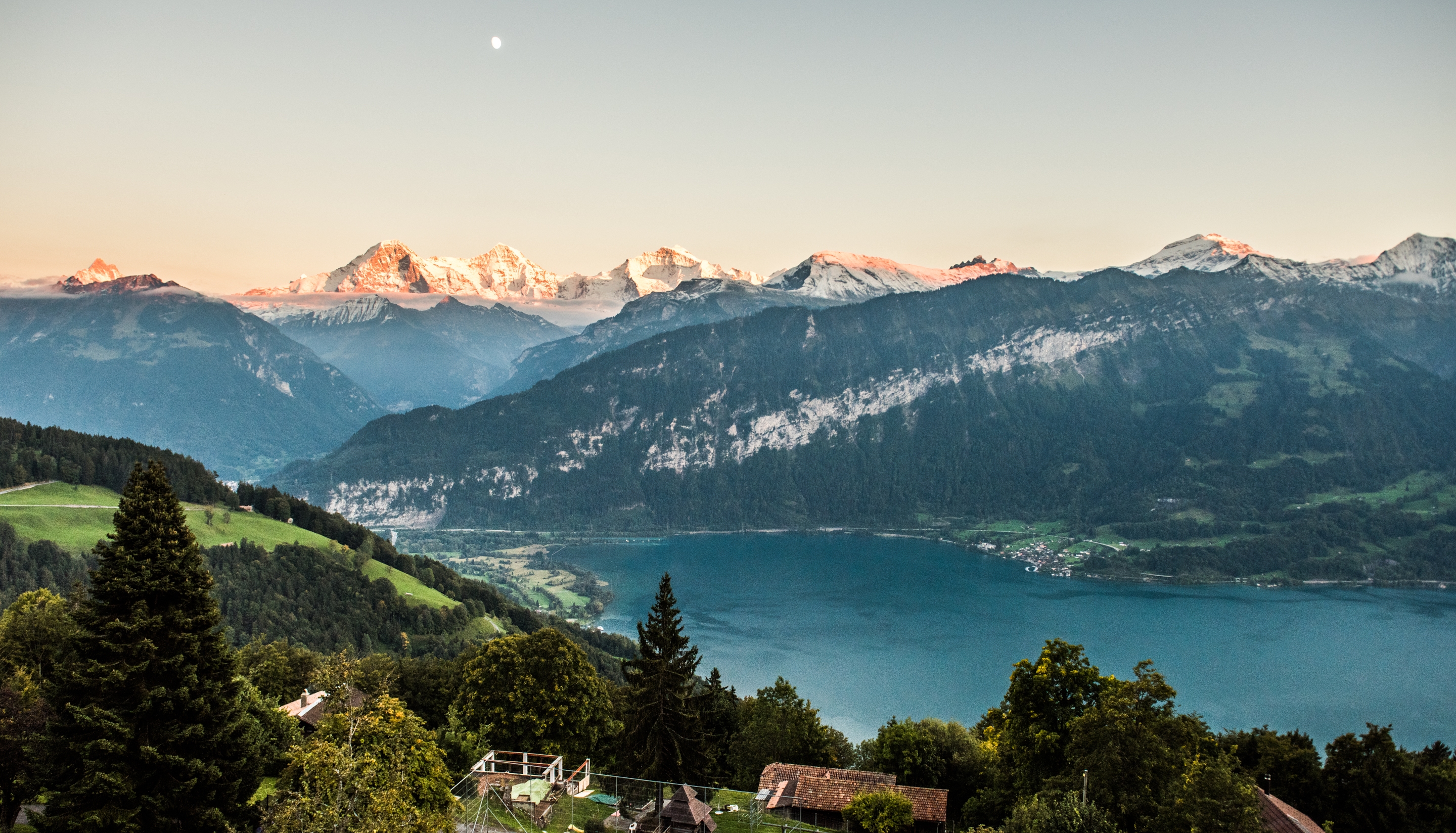 Nem győzünk betelni vele, s ahogy ebéd után lemegyünk a Thun tóhoz minden kanyarulatnál feltekintünk a hatalmas csúcsokra. Kristálytisztán vár a tó, a kivételes nyári melegben mindenféle jármű hasítja a vizet, a levegőben rajban szállnak a sárkányrepülők. Megkóstoljuk a málnás szeletet a helyi pékségben, s iszunk a hegyi forrásból. Sok áldása van a hegyeknek…