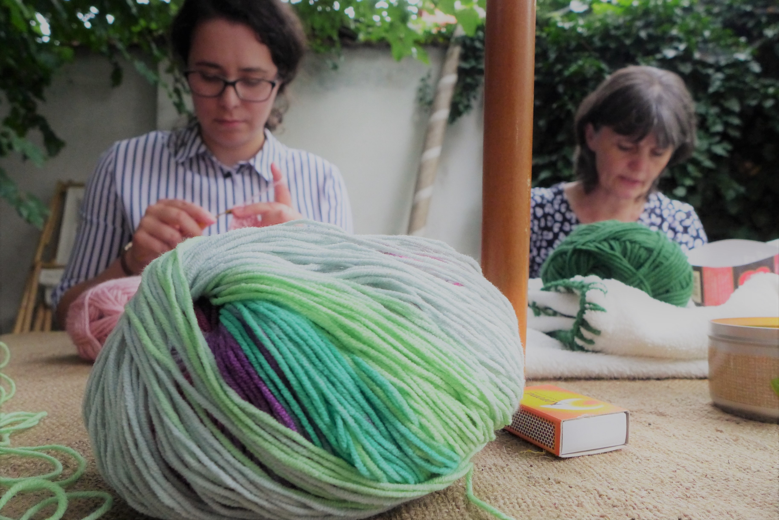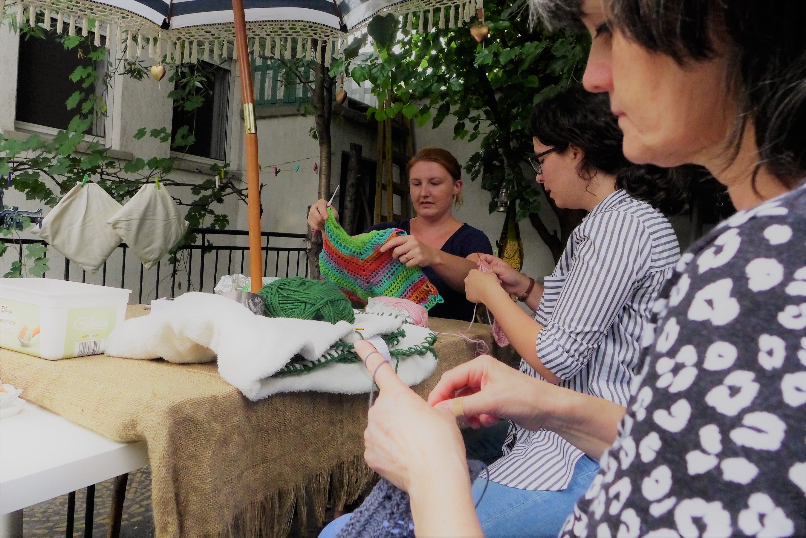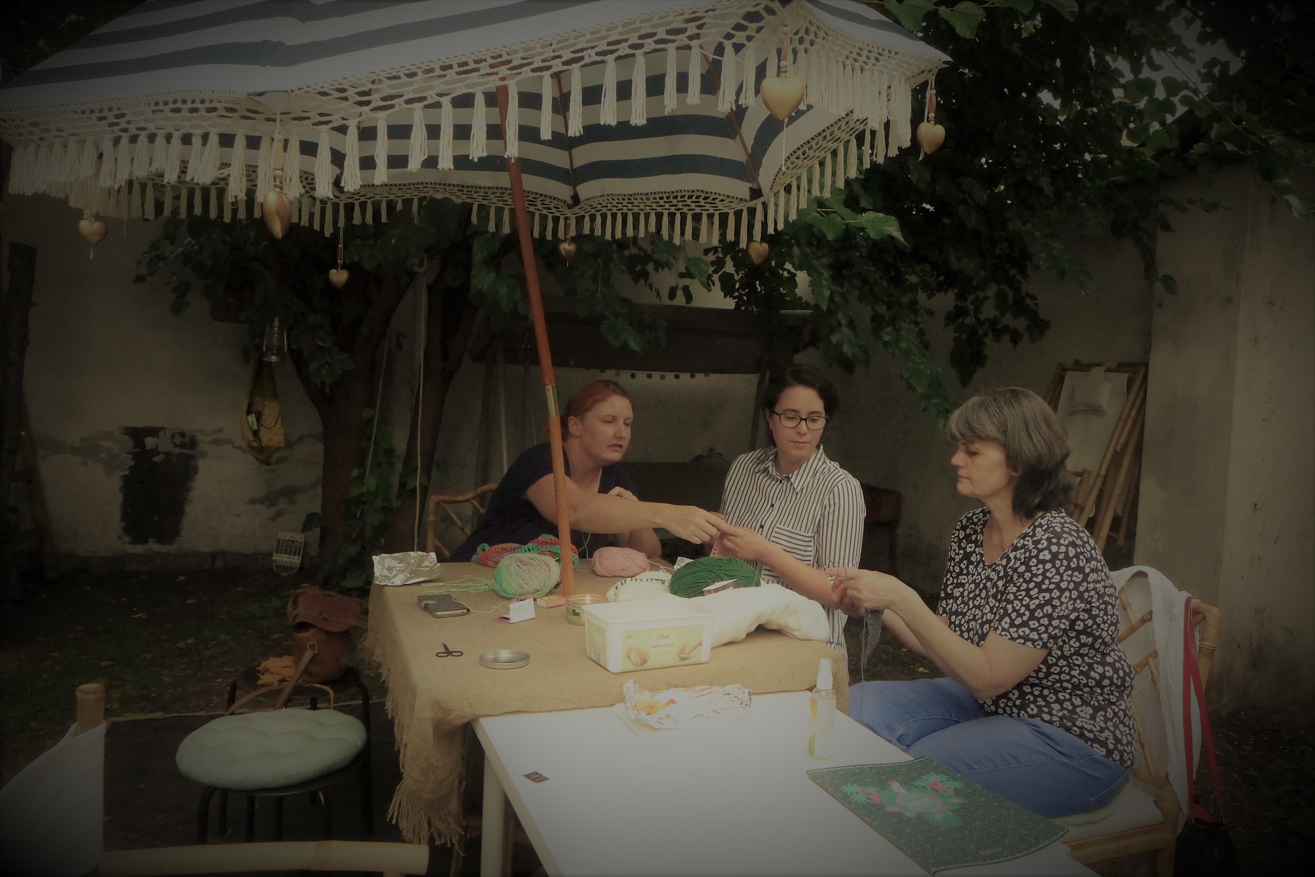 Ez az egyik legszebb templomkert és parókiaudvar, amit valaha láttam, állapítom meg magamban, ahogy belépek a Külső-Üllői Úti Református Gyülekezet nagykapuján. Az udvar minden szeglete arról árulkodik, hogy valaki különleges érzékkel látja a benne rejlő lehetőségeket. Kiss Enikő lelkészné vezet körbe, lelkesedéssel beszél a sziklakertről, a füvesítésről, a virágágyásokról és -szigetekről, az elkészült kerti székekről és asztalokról, a fontolgatott rózsalugasról, illatos loncról és lila akácról, amely végképp körbeölelné és bódító illattal árasztaná el a hátsó kis udvart, amelynek közepén csinos napernyő alatt foglalunk helyet. Most vette kezdetét a fonó – modern, nagyvárosias környezetben mintegy oázisként a város és a hétköznapok forgatagában. Ezt erősítik meg a horgolással foglalatoskodó lányok, asszonyok is – van köztük, aki először ismerkedik a különböző fogásokkal, a többiek szintén itt tanulták meg az egyszerűbb technikát vagy elevenítették fel a feledés homályába vesző ismereteiket.