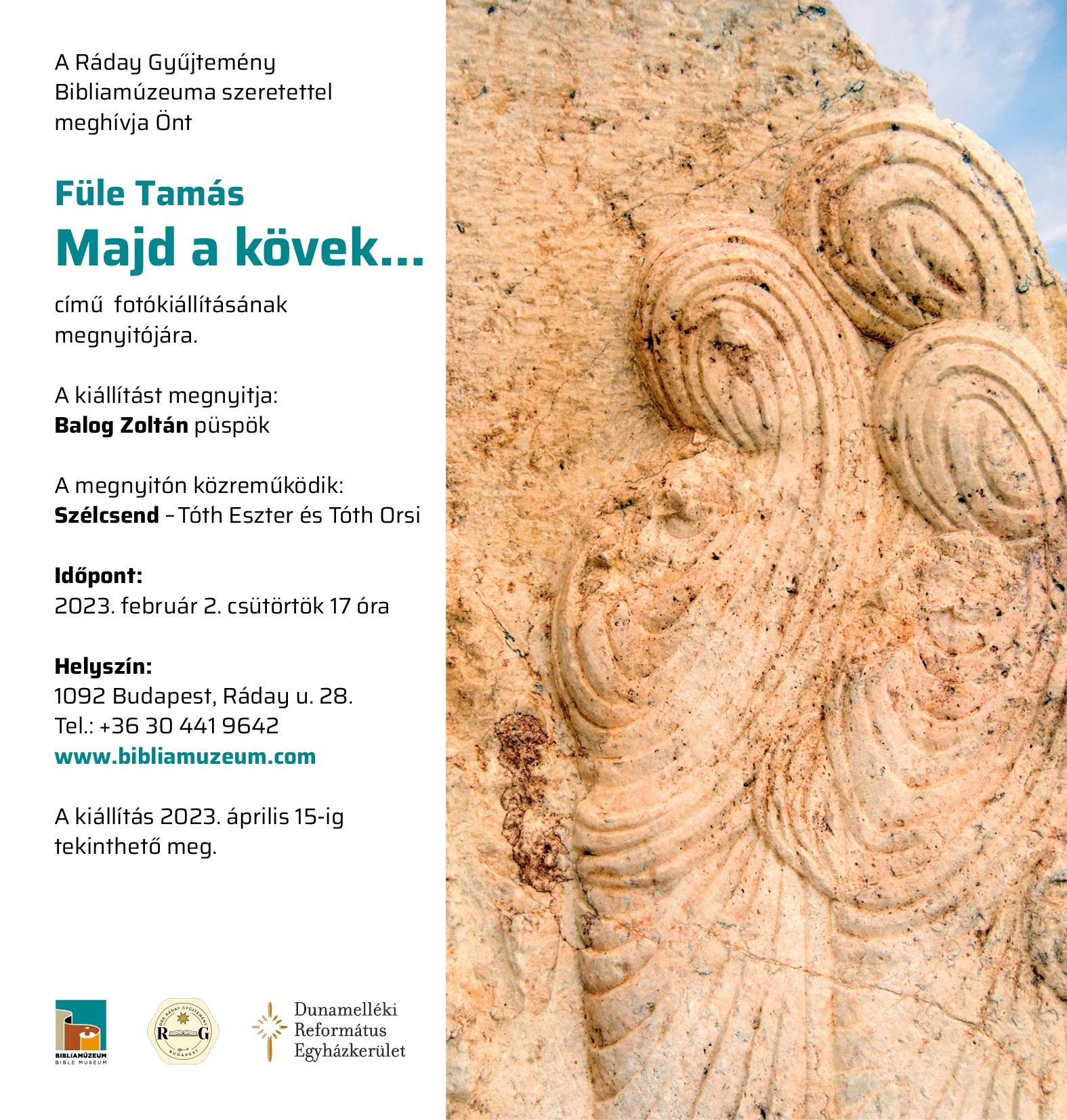 A kortárs szövegírók reflexióival kiegészült Majd a kövek… című kiállítást 2023. február 2-án, csütörtökön du. 17 órakor Balog Zoltán dunamelléki püspök, a Zsinat lelkészi elnöke nyitja meg a budapesti Bibliamúzeum földszinti kiállítótermében (1092 Budapest, Ráday utca 28).