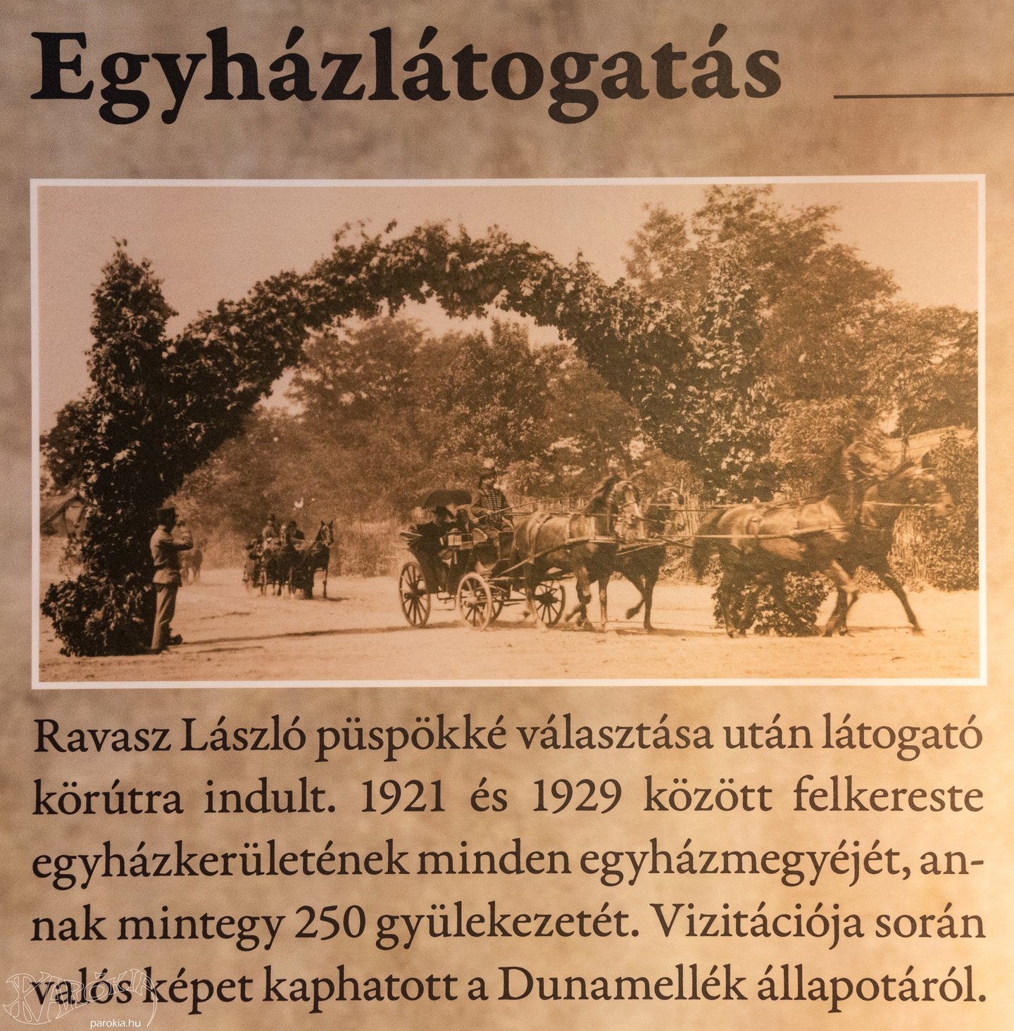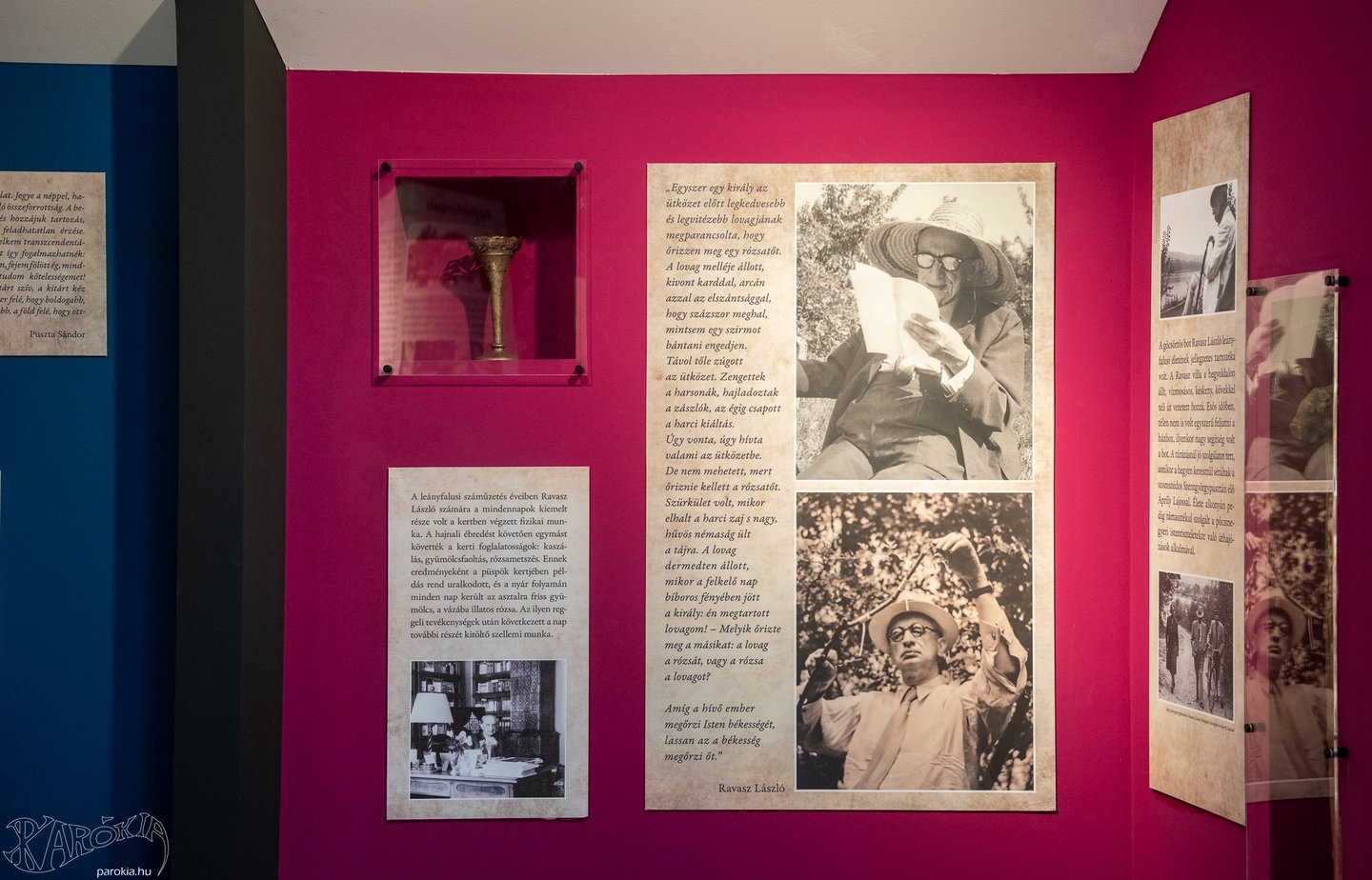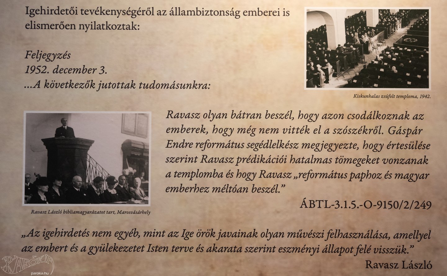 Ravasz László a nagyközönség számára kevésbé ismert fényképeken és filmhíradós felvételen jelenik meg, igehirdetéseibe bele lehet hallgatni, és meghatározó tárgyai közül is láthatunk néhány becses darabot: jellegzetes kalapját, túrabotját, kedvenc vázáját – melybe minden reggel friss rózsákat tett –, és az eddig a Terror Háza Múzeumban őrzött palástját.