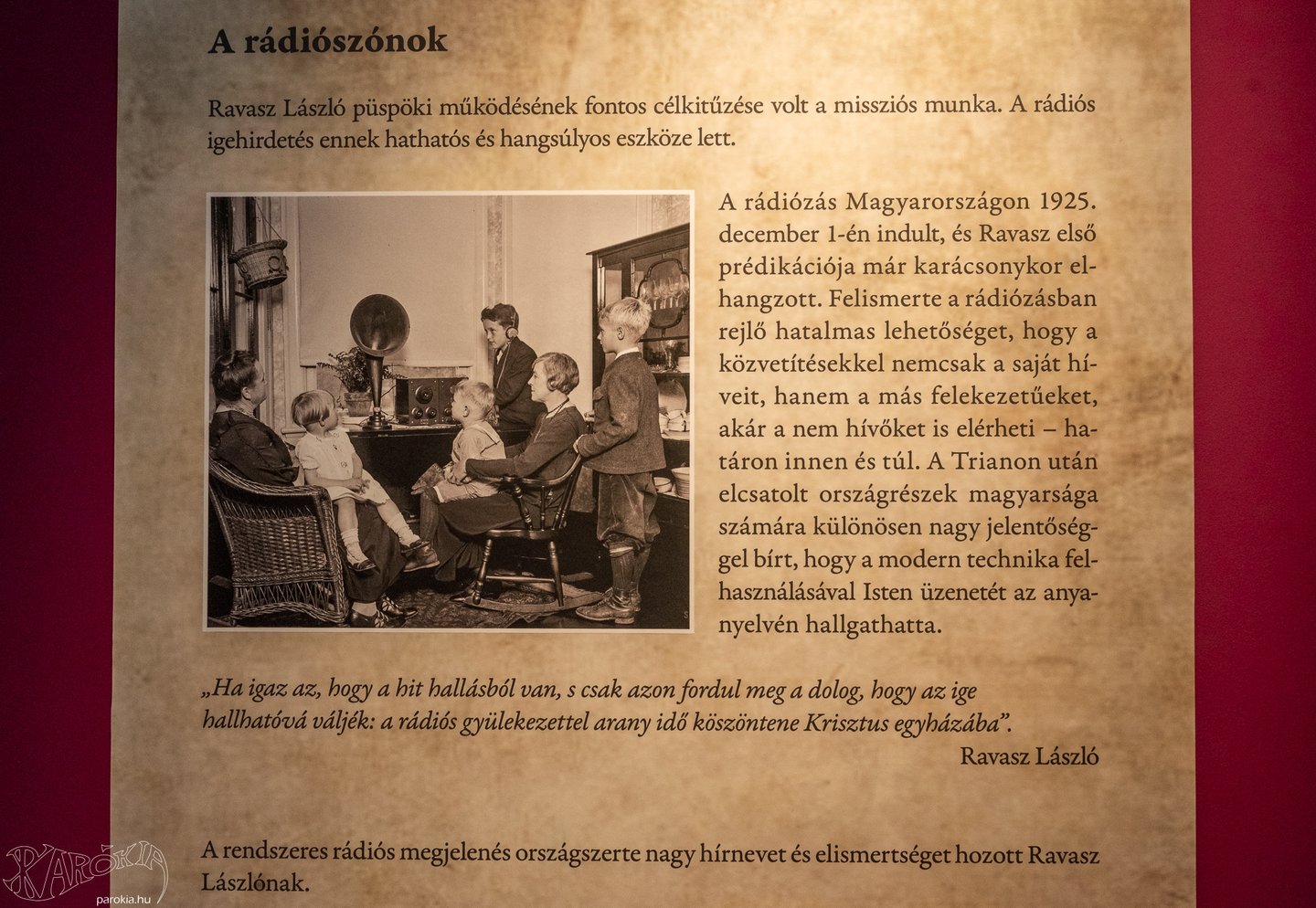 Hangja úgy szólal meg az ötvenhatos eseményeket idéző szobában, hogy az a napjainkban dúló háború harci zajában is eligazítást ad. „A rádió 1925-ben kezdte sugározni műsorát, nagyapám már annak az évnek a karácsonyán a rádióban prédikált. Trianon után öt évvel az, hogy a határokon túlra egy magyar hang átment, és olyat tudott mondani, ami az akkori embereknek fontos volt, rengeteget számított. Nem kevésbé volt hatásos az 1956. novemberi rádióbeszéde sem. Hétéves voltam, amikor ezt elmondta, emlékszem, a mi budapesti lakásunkban vették fel. Amikor utána ismét a Kálvin téren prédikált, rengetegen voltak kíváncsiak az igehirdetésére. Egyébként a színinövendékeknek azt tanácsolták, ha szép magyar beszédet akarnak hallani, menjenek el a Kálvin téri templomba, és hallgassák meg Ravasz László igehirdetéseit.”