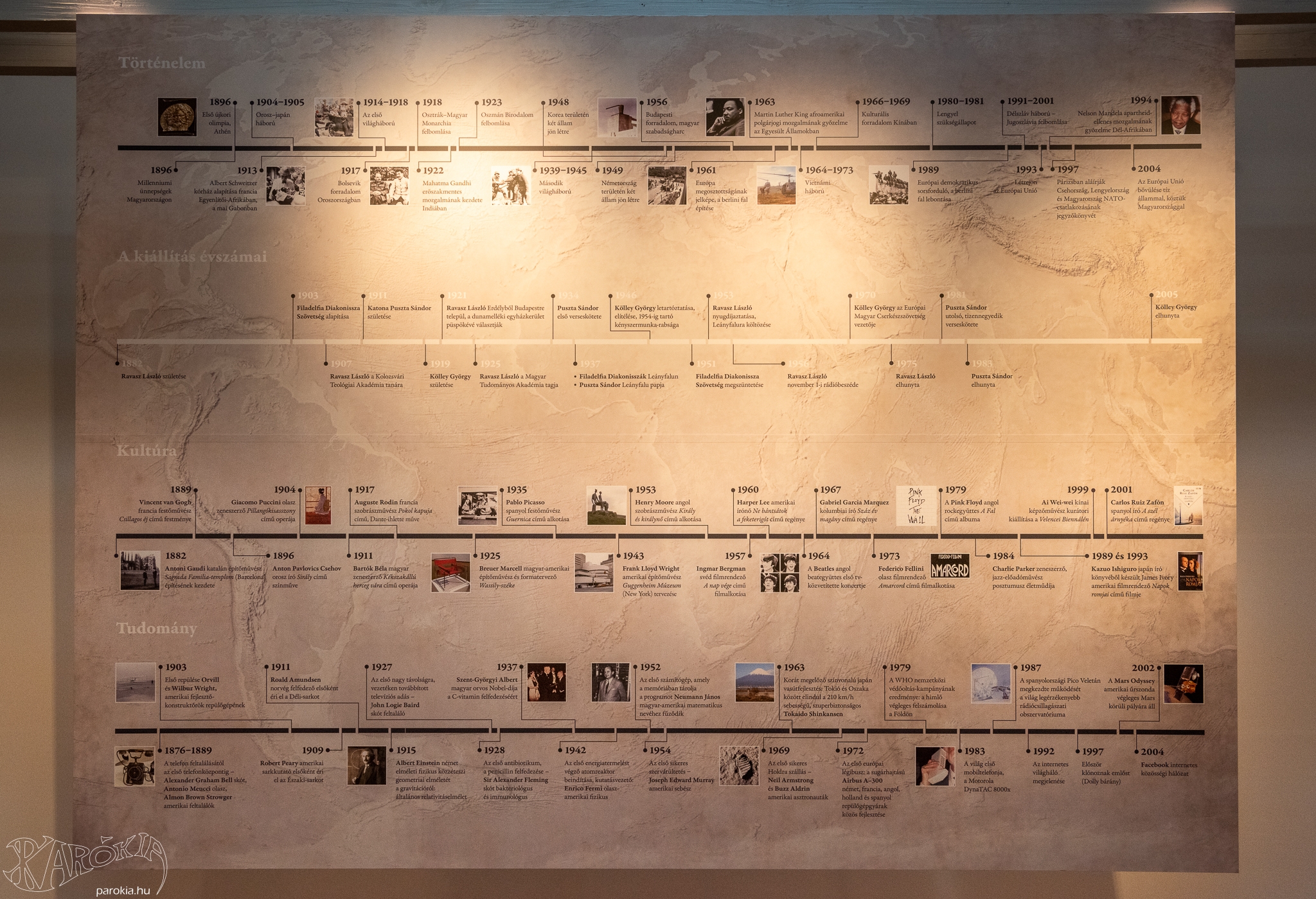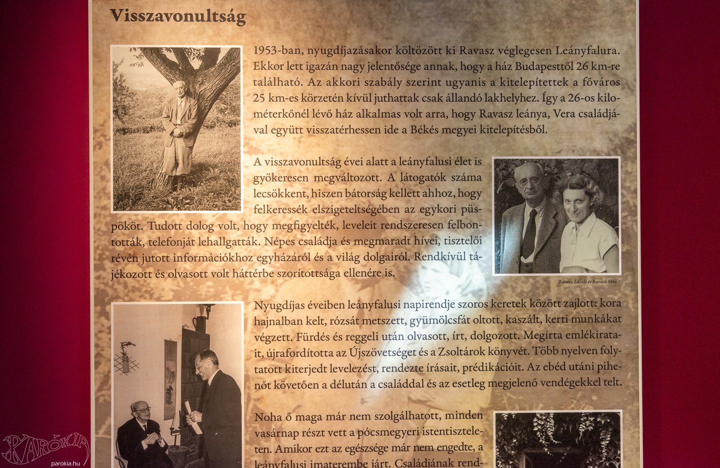 Míg Európában a Beatles, Amerikában Martin Luther King, a Holdon pedig az első ember írta be magát az emberiség történelemkönyvébe, addig a Dunakanyar ékszerdobozának tartott kis üdülőfaluban látszólag kis dolgok történtek. Pedig nagy formátumú emberek éltek ott is, és bár tetteiktől nem volt hangos a világsajtó, fiatalok és idősek életére egyaránt jelentős hatással voltak a kommunizmus egyházellenes légkörében. Valódi lélekőrzők voltak, akiknek a nemrégiben Leányfalun megnyílt Ravasz László Emlékház, Egyházi Gyűjtemény és Rendezvényközpontban megtekinthető kiállítással állítanak emléket. A barangolást bárhol elkezdhetjük, bár a kiállítótérbe lépve elsőre talán épp a szemközti fal idővonala hívja fel magára leginkább a figyelmet. Az utókor szemében már a legnagyobbak között kerültek fel a térképre az egykor Leányfalun és környékén élő, dolgozó, szolgálatot teljesítő egyházi személyiségek.