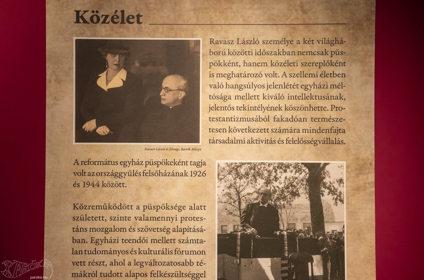 A kurátorok persze azzal is tisztában vannak: családtagként ők maguk sem adhatnak olyan elfogulatlan képet Ravasz Lászlóról, mint egy, a korszakot jól ismerő szakember. Ezért is alakítottak ki egy olyan állandó kiállítási egységet a róla elnevezett emlékház földszintjén, amely a püspök életében meghatározó történelmi eseményeket és ezekben az ő szerepvállalását mutatja be. A Csűrös András egyháztörténész által összeállított történelmi tablókon az erdélyi évek, köztük az első, majd a második világháború, valamint 1956 is szerepel.
