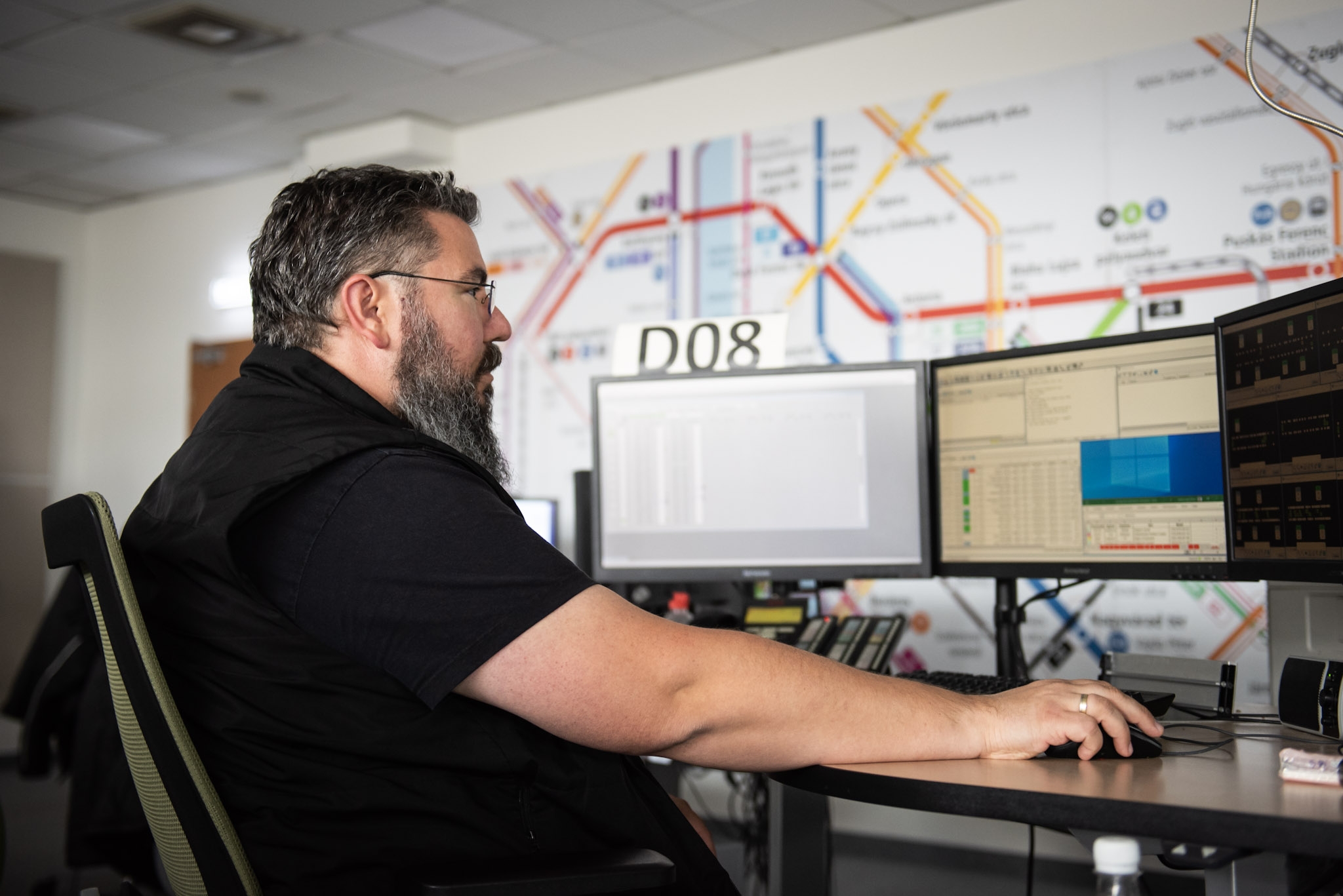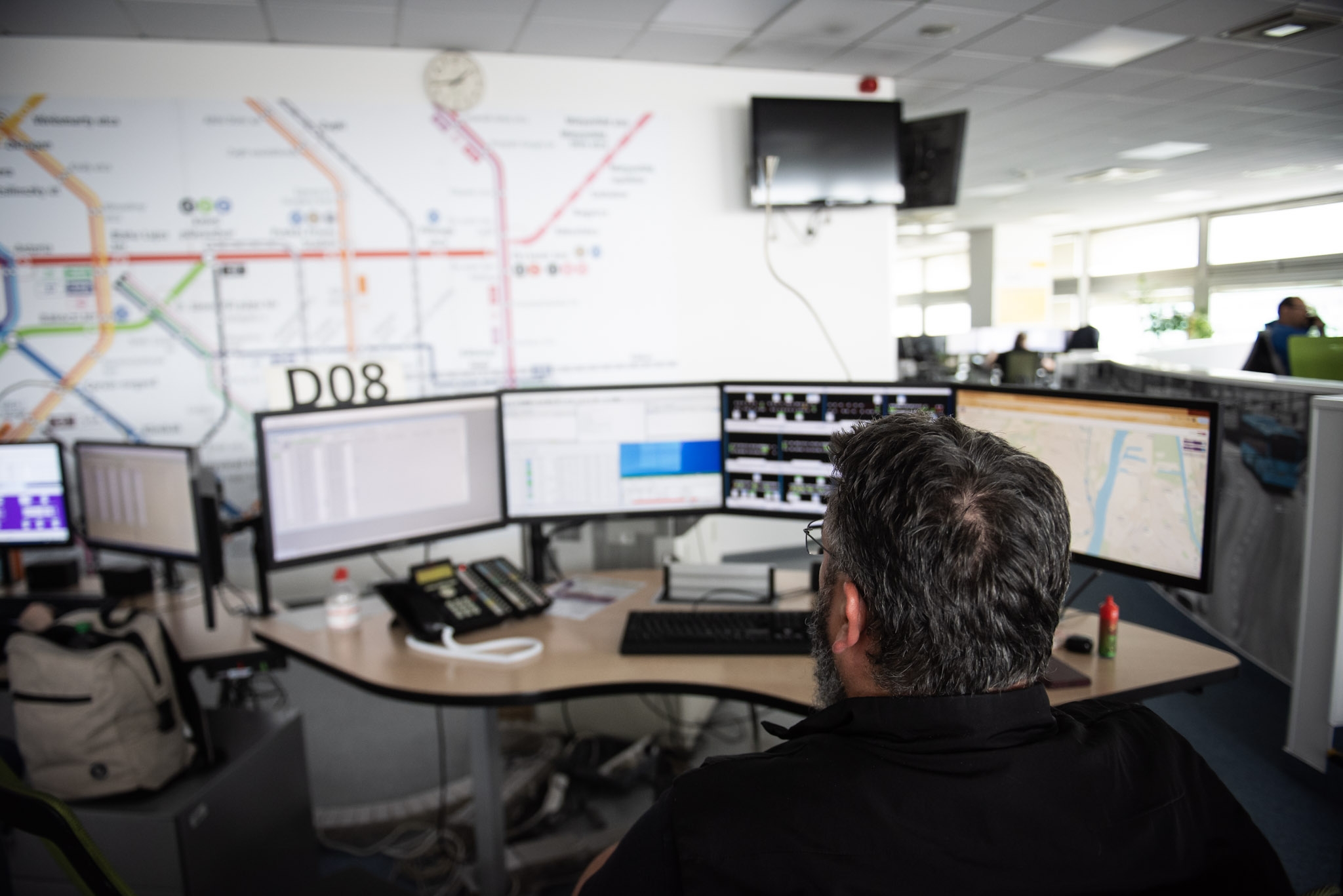„Készülj fel, mert ha zűrös napot fogunk ki, lehet, hozzád sem tudok majd szólni!” – jelezte Tibor interjúnk egyeztetésekor, és bevallom, nem is tudnám máshogyan elképzelni a BKK FUTÁR Központját. A fővárosi tömegközlekedés agyaként funkcionáló épületből – minden műszakot beleszámítva – nagyjából 60-70 fő irányít csúcsidőben 1500-1700 járművet, melyek naponta 2 millió 320 ezer utast szállítanak. Már elképzeltem, ahogyan a menetirányító diszpécserek egymást túlharsogva próbálnak megoldani egy-egy fennakadást, de ott jártamkor szokatlan nyugalom fogadott: igaz, a délelőttös műszak végén pillanthattam be a kulisszák mögé, és Tibor szerint is „nagyon nem szokványosan nyugodt időszakban” láthattam őket munka közben. Beszélgetésünkre azért már munka után került sor.