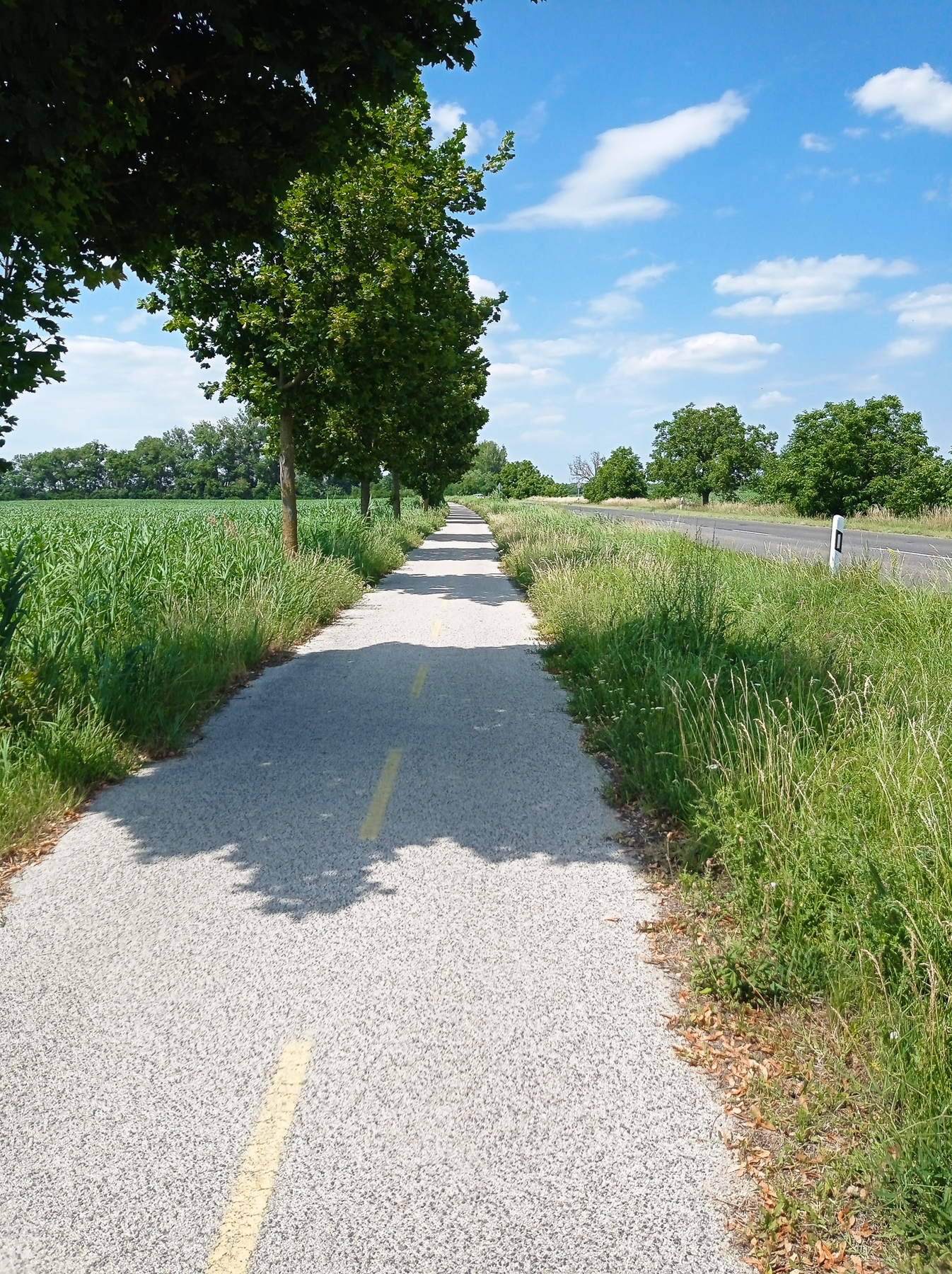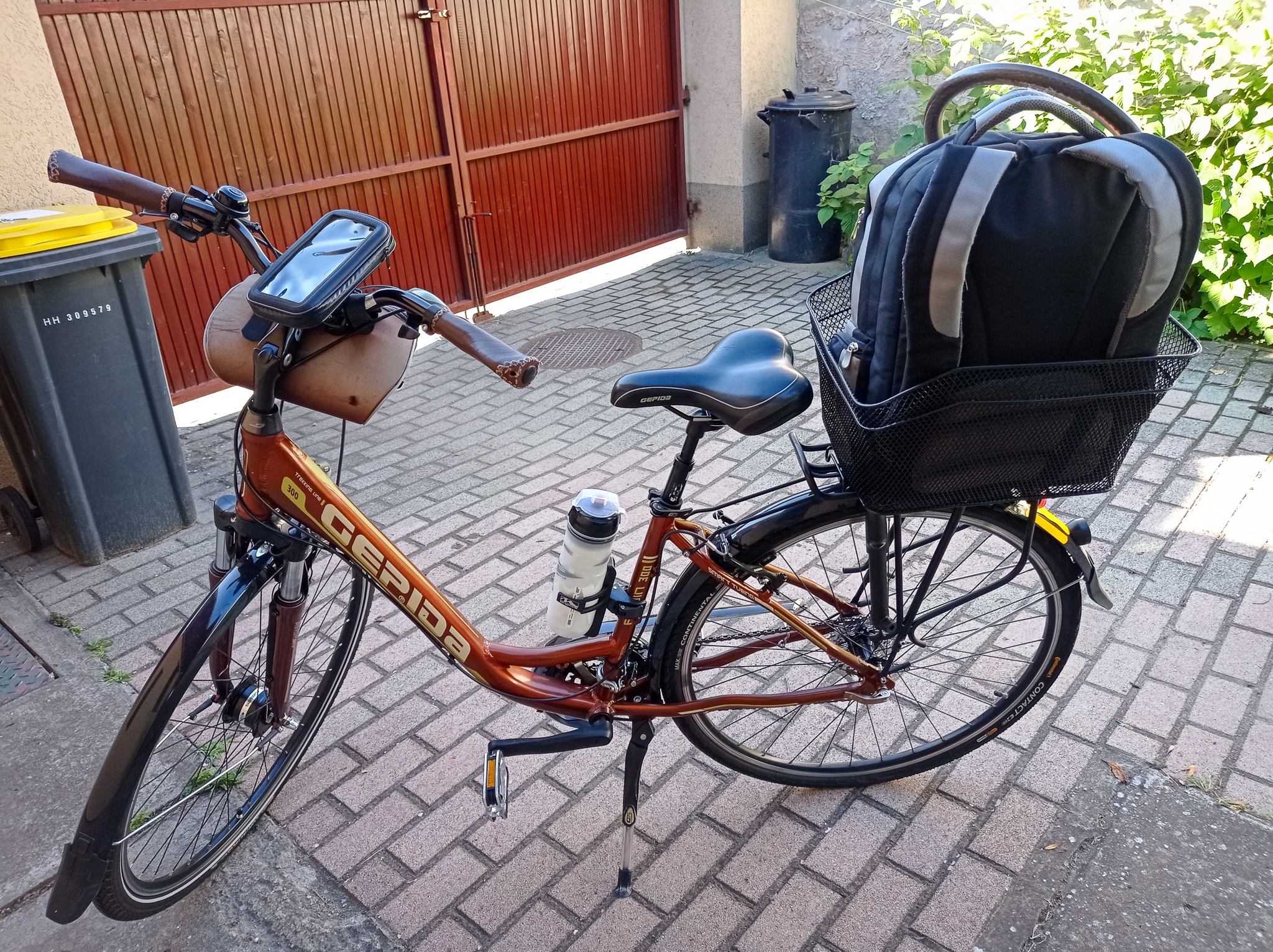 Gumibelsőt, javítókészletet, olajat, csavarhúzót visz-e magával? – folytatom a praktikus kérdéseket. Gumibelsőt nem, mert a szerelője masszív gumit tett a kerékpárra. Az út előtt ugyanis nagyszervízen esett át a jármű. Két szimpla csavarkulcsot azért elvitt magával, de most nem volt szükség javításra. Pedig a terep elég változatos, kétszer földúton is kellett mennie. Nagyszentjános és Ács között a vasút és a kukoricatáblák között vitt a földút, kitáblázva, mint a nemzetközi EuroVelo útvonal része. Komárom előtt is volt egy hasonló szakasz, ami pedig egy erdőn át vezetett. „Sáros, kátyús, és fakitermelés miatt fűrészporos, faforgácsos volt az út. Pedig az erdő klassz volt, de az út nagyon rossz minőségű.” Damásdi Dénesné Judit hozzáteszi: nem félt az útja során, de itt azért megfordult a fejében, hogy ha bármi történne vele, ugyan kihez tudna fordulni segítségért.