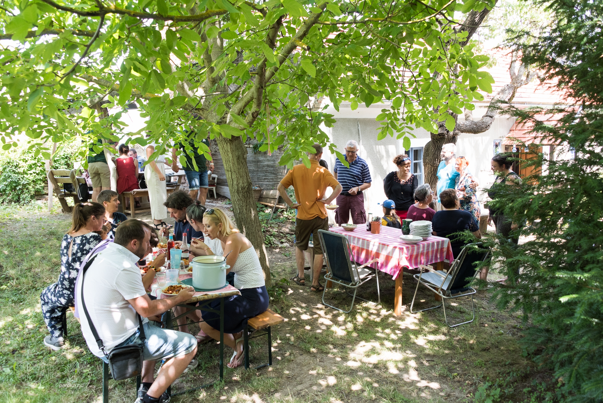 „Ha nincs a kezedben semmi, valamit elfelejtettél” – mondja nevetve a házigazda, ahogy felnyalábolja a „női napozót” körülkerítő futónövény levágott indáit. Szabó György végigkalauzol a hosszú udvaron, amely egészen felnyúlik a „hegyoldalon” és az erdőben ér véget. Építészként fiatalkora óta nagy álma volt, hogy legyen egy parasztházuk, amelyet felújíthatnak és megmenthetnek, mielőtt az végképp az enyészeté lesz. „Ezek a házak őriznek valamit a régi világból, ami megőrzésre méltó” – mondja, bár ebben a környezetben nem szükséges a magyarázat.