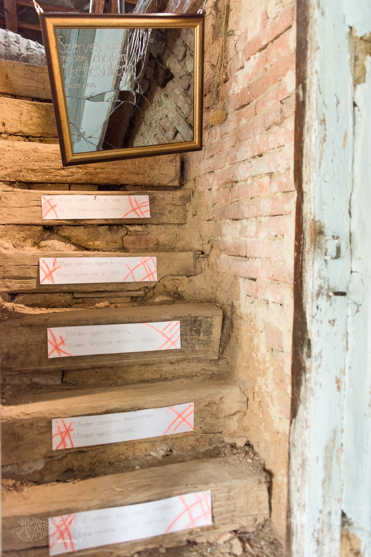 Az első állomás érdekes módon a padlásfeljáró volt, amit ajtó takart el a kicsiny ház folyosóján. Nem volt egyértelmű számomra, hogy ezt az ajtót ki lehet, „ki kell” nyitni. Láttam, akik betévedtek, maguk is bizonytalanok voltak ebben. Aztán rájöttem, miért nem volt kötelező a betekintés: az ajtó mögött összetört tükör nézett vissza rám. Pontosabban, az összetört énem tükörképét láttam magam előtt. A tükrön ezt olvastam: sérült vagyok és sérülést okozok.