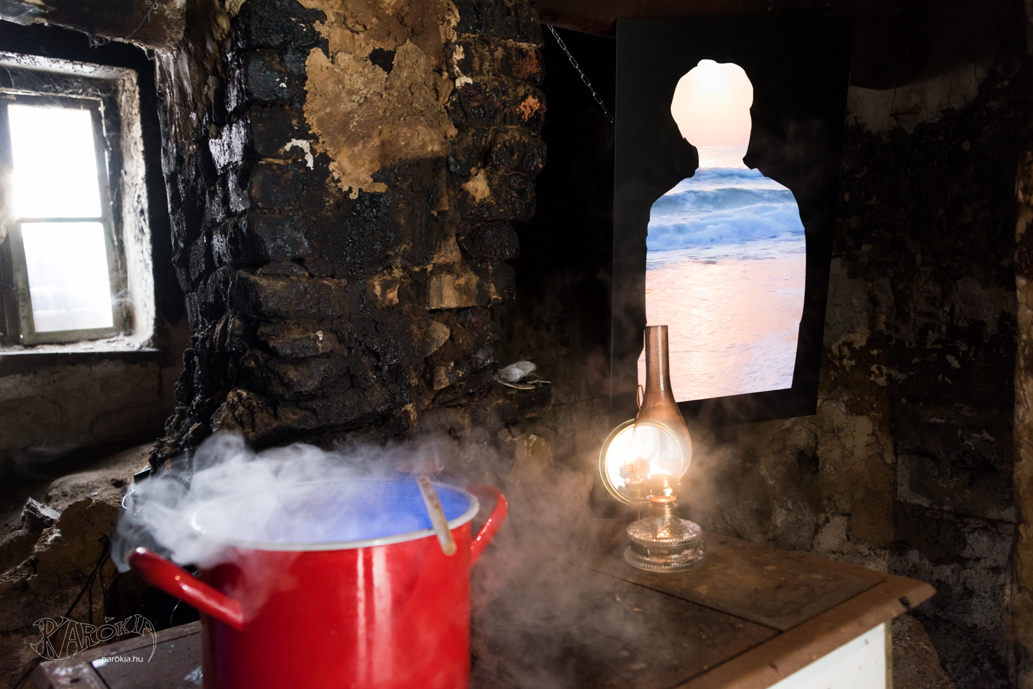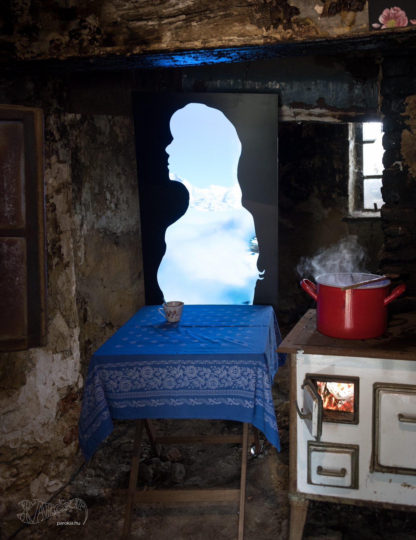 Továbblépve, a harmadik állomás döbbentett meg. A komor, sötét konyhában régi sparheltet láttam, rajta szép, piros fazékkal, amelyből nem igazi gőz jött ki. A fazék alatt a sparhelt tűzhelyére lettem figyelmes: csak egy digitális képernyő volt ott, amin „lobogott a tűz”. Mind a gőz és a tűz hamis volt, odaképzelt, odaálmodott.