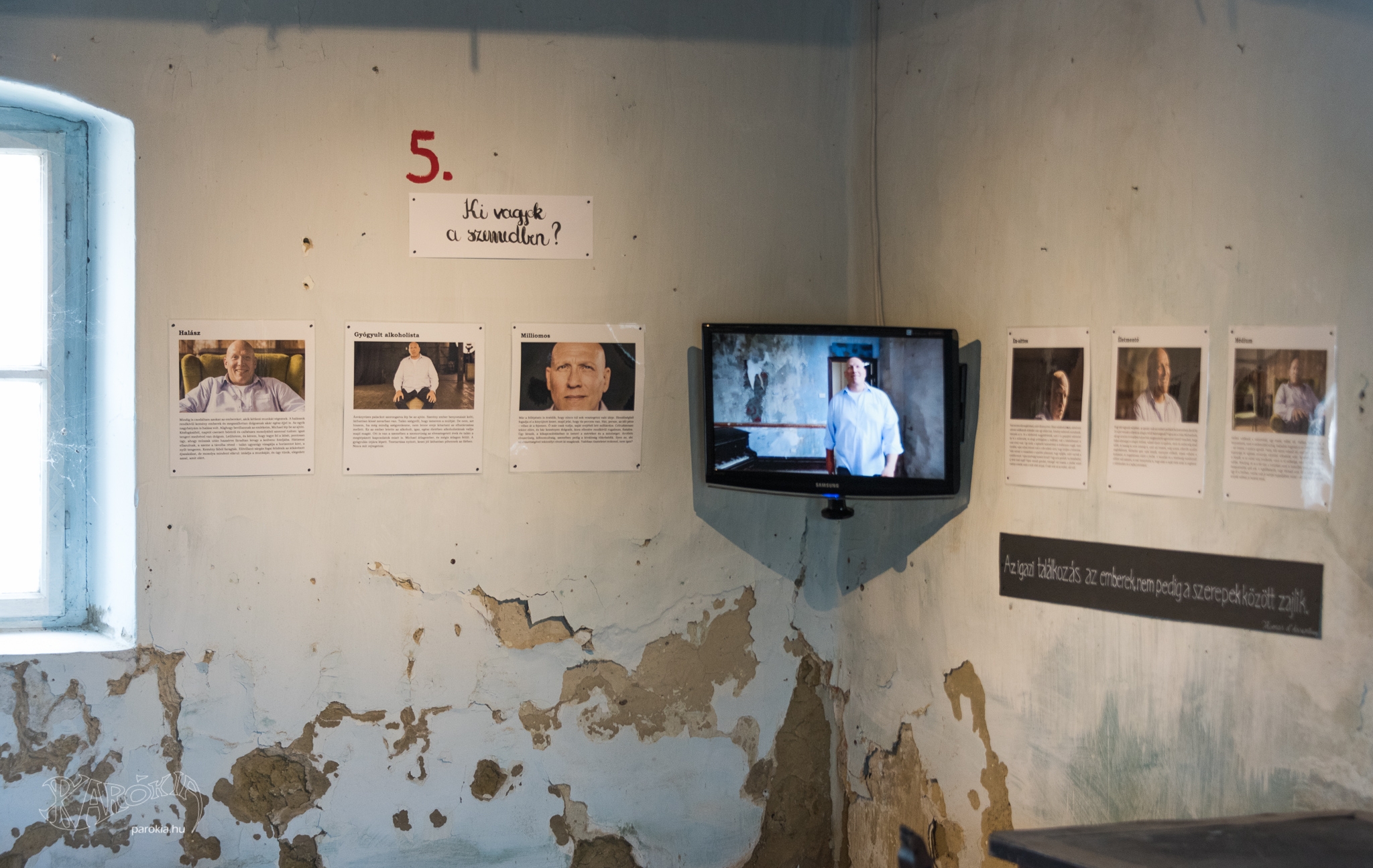 A következő szobába átlépve érdekes kísérletről olvastam az egyik saroknál. Hat fényképészt kértek föl arra, hogy egy férfiről készítsenek képeket. Az alanyról azt mondták, hogy halász, médium, milliomos, börtönviselt elítélt, életmentő, szabadult alkoholista – azaz, mind a hat fényképésznek mást mondtak erről a férfiről. A feladatuk annyi volt, hogy az elmondott élettörténet alapján készítsenek portrét róla. Félelmetes volt látni, mennyire találó volt az adott beállítás. A halásznak mondott alanyt vidámnak, életszeretőnek láttam, míg az exsittes mintha meg akart volna verni. Pedig ugyanazt az embert ábrázolták a képek, csak hat megközelítésben. Kiderült: egymás megítélésében nagyon nagy szerepet játszik a mi lencsénk, beállításunk. E lencsével, látásmóddal életet védhetünk és pusztíthatunk.