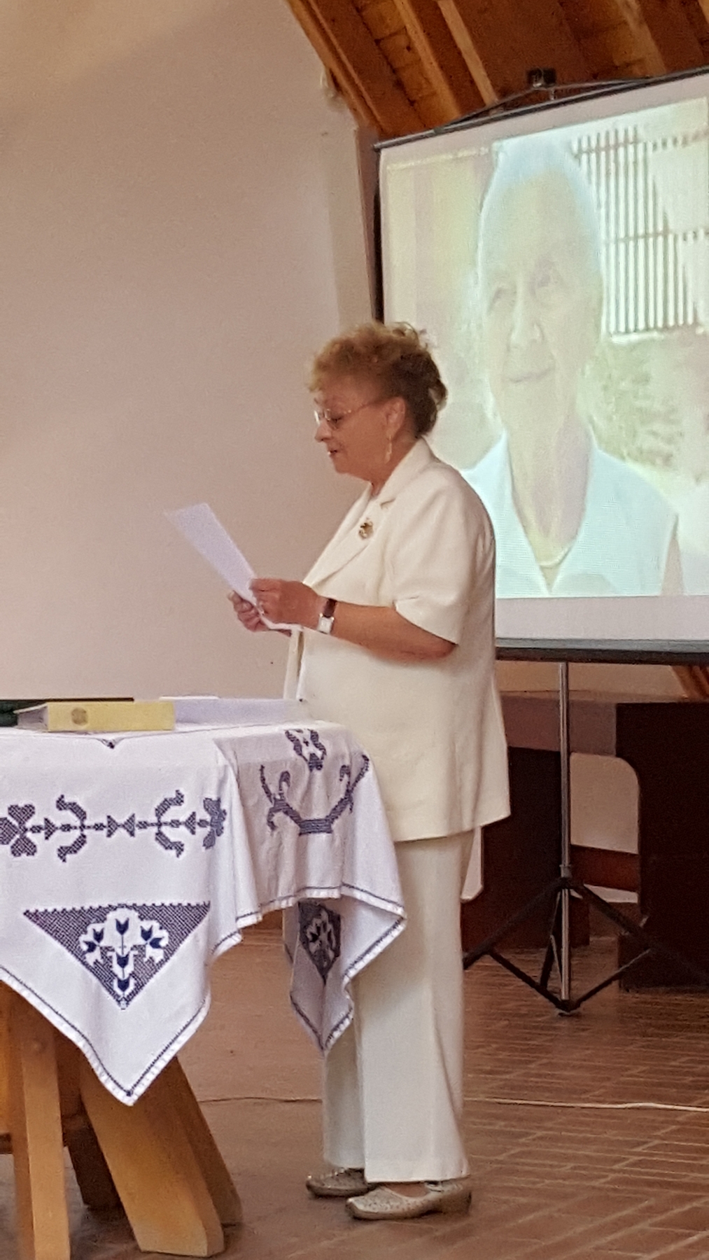 Szénásiné Jutka néni (a monitoron látható) – aki kezdetektől áldott vezetője volt a Dunamelléki Nőszövetségnek – küldte el az elmúlt két és fél évtizedről szóló megemlékezését. Vannak olyan gyülekezetek, ahol már valóban ennyi ideje működik is a nőszövetségi szolgálat. Vogelné Ilcsi néni beszámolója, különleges fényképalbumai megőrizték a kezdeteket. Istennek legyen hála minden utat törő, hűséges szolgálóért! Pilder Mária hitvallását is hallhattuk, aki Erdélyből hozta át valamikor – Ravasz László püspök kérésére és támogatásával – a női munka ilyen felépítésének modelljét. Hogy mi a Nőszövetség célja? „A nőket Krisztus köré gyűjteni, hogy Krisztus megtalálhassa őket, hogy azután teremjék a megtérés gyümölcseit egyházunkban a presbitérium mellett.” Kiderült: a nőszövetségi munka már akkor kiteljesedett Kárpát-medence-szerte, amikor még nem volt könnyű utazni sem. Félelmetes és megindító történeteket hallhattunk ezekről az utakról.