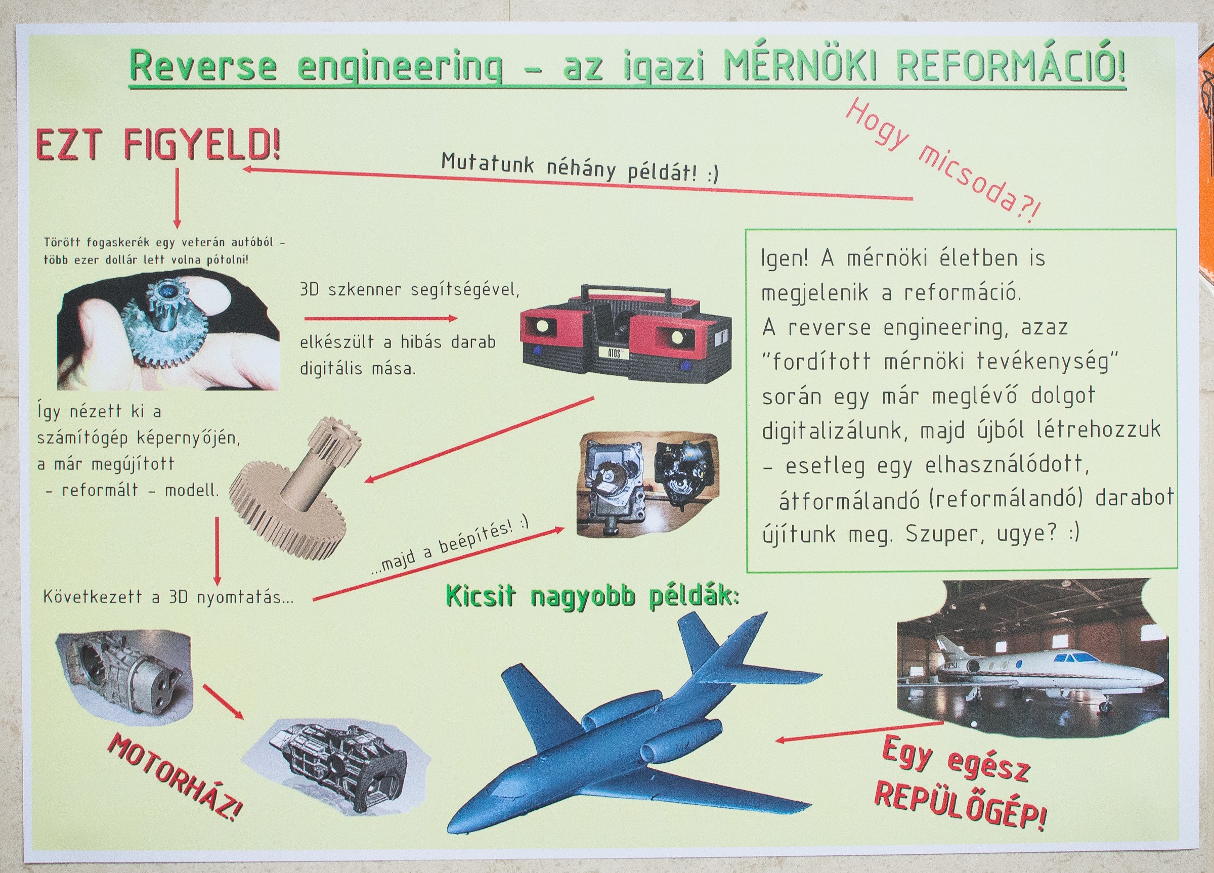„Mivel ez az alkatrész egy veterán autó motorjába került, a pótlása nagyon drága lett volna. Ezért sokkal egyszerűbben kellett helyettesíteni. Egy ún. 3D-szkenneléssel felvitték egy számítógépes felületre a fogaskerék modelljét, majd megvizsgálták, hogyan lehetne eredeti formájára visszaállítani. Miután újratervezték, szintén 3D-s technológiával nyomtattak belőle egy prototípust. Ezután ellenőrizték, hogy tényleg jól működik-e, majd miután ez bebizonyosodott, egy másik technológiával, tartósabb anyagból is megalkották ezt az alkatrészt, és végül sikeresen pótolták vele az autóból hiányzó elemet. Ezzel nem pusztán lemásolták az eredeti alkatrészt, hanem ki is javították a hibáit, végül megalkották az eredeti, tökéletes formáját. Ez a kicsi alkatrész jól példázza, mit jelent komplex építményeket, házakat, akár egyházakat is megreformálni.”