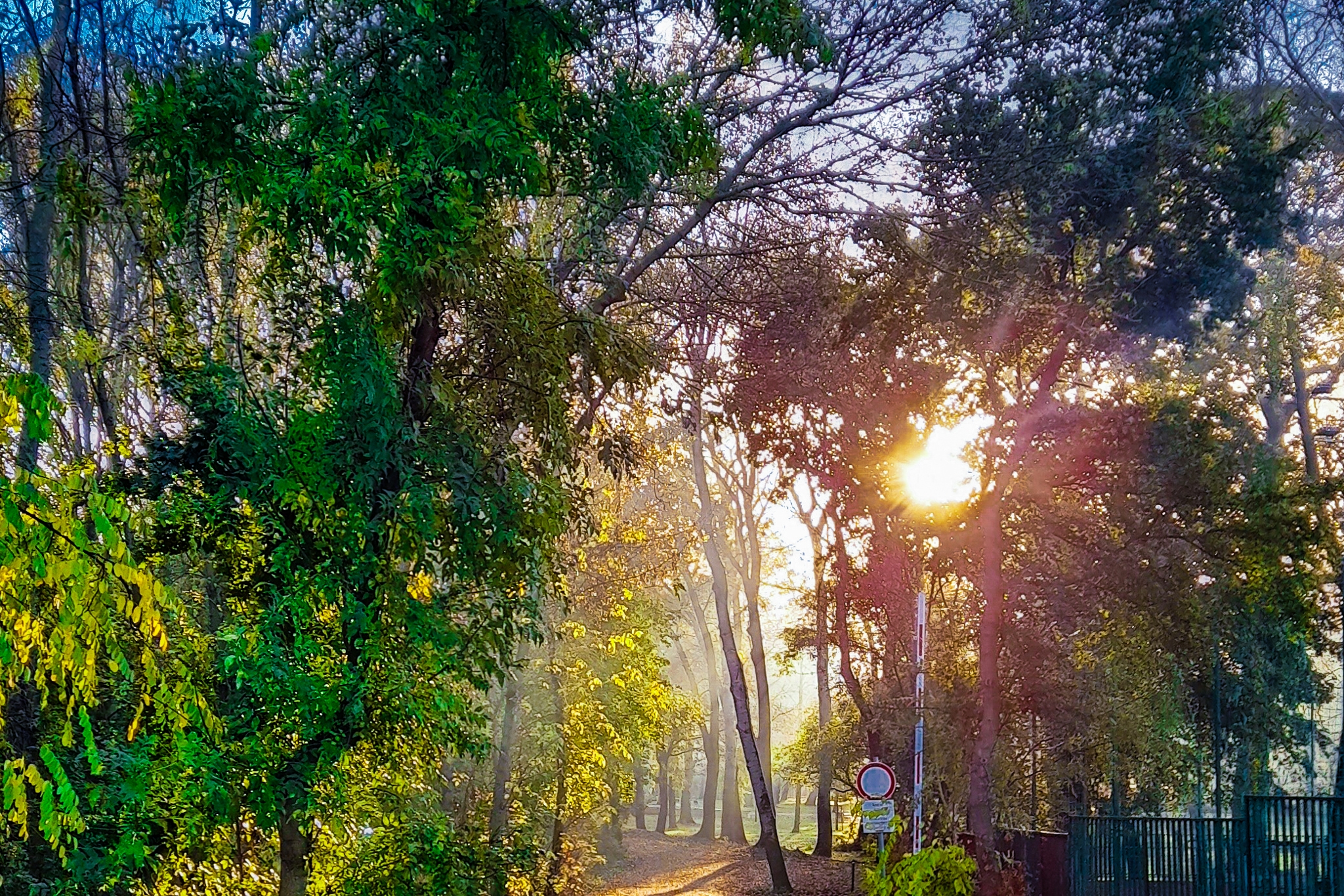 Mintha az időjárás nem tudná eldönteni, milyen évszak van éppen. A reggeli köd talajmenti fagyok és még mindig zöld falevelek közt bolyong, szikrázva szórva szét a fákra a napfelkelte hűvös sugarait. Vajon mikor készülhetett ez a fénykép? Szeptemberben? Októberben? Novemberben? Decemberben? Ősz-e ez még, vagy a tél erőtlen, lassú kezdete? Létezik-e még átmenet az évszakok között, vagy csak és kizárólag átmenet létezik kontúrok nélkül? Korántsem időtlenséget fejez ki ez a megragadott pillanat, sokkal inkább afféle köztes időt, ahol egyszerre van jelen az, ami volt, és az, ami eljövendő. A múlt árnyéka és a jövő ígérete, a Homályba borult világ és a közénk érkezett Fény, a rothadó avar és a zöldellő levelek. A sorompó ég felé nyúló karja és a Napot körbetáncoló lombkoronák mintha már sejtetnének valamit, ami még rejtve van, de a jelent az árnyékok uralják. Az előttünk álló út azonban határozottan az élet felé vezet.