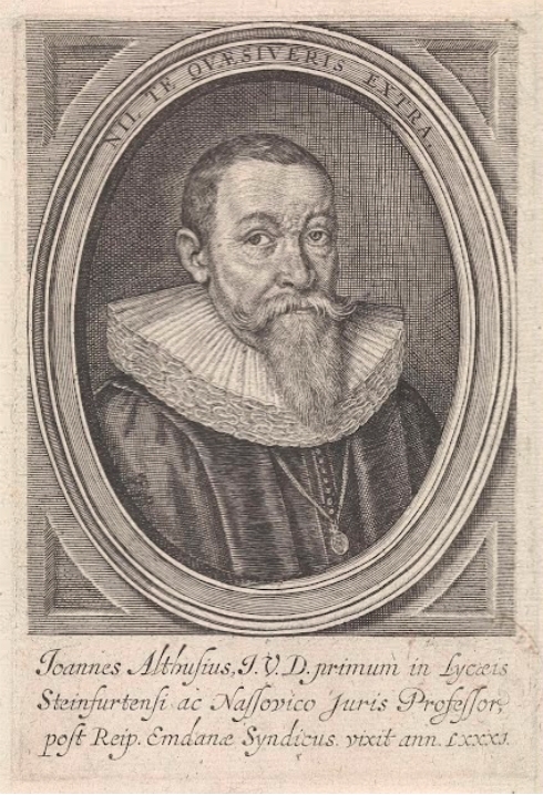 Johannes Althusius, vagy német nevén Althaus 1557-ben született a vesztfáliai Dienenshausenben, és 1638-ban halt meg, éppen akkor, amikor az első erdélyi puritán teológusnemzedék Kálvin tanainak szorosabb követésére tett fogadalmat. Kölni és bázeli egyetemi tanulmányok után Bázel egyetemén doktorált, és annak a herborni akadémiának volt a tanára, ahonnan később több tanár is érkezett Erdélybe Bethlen Gábor hívására.